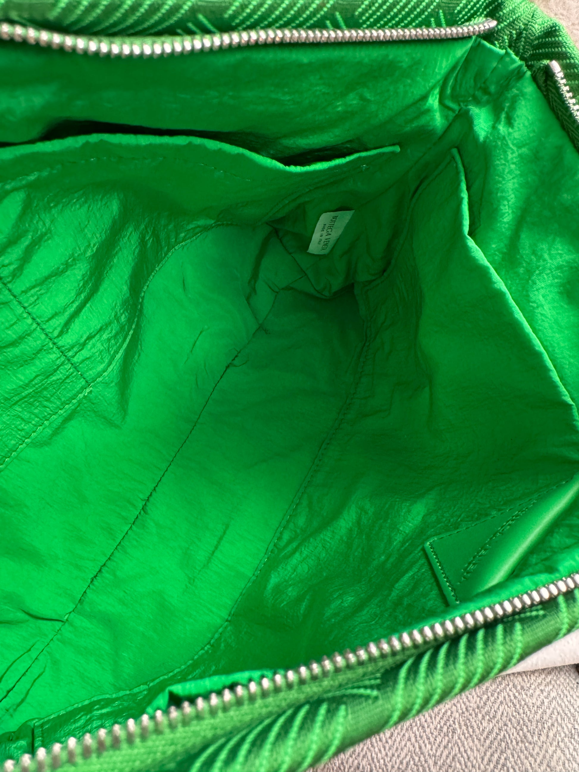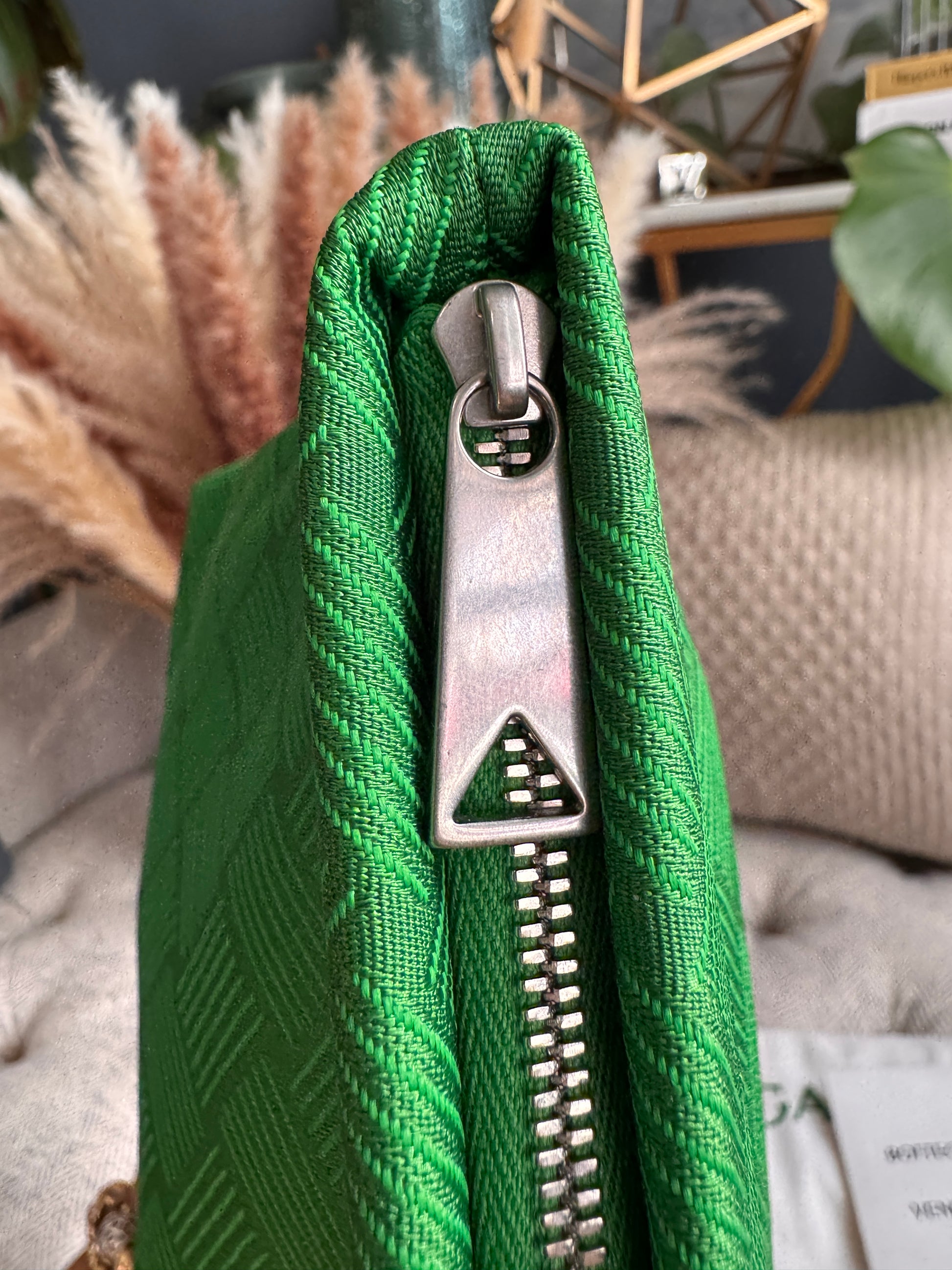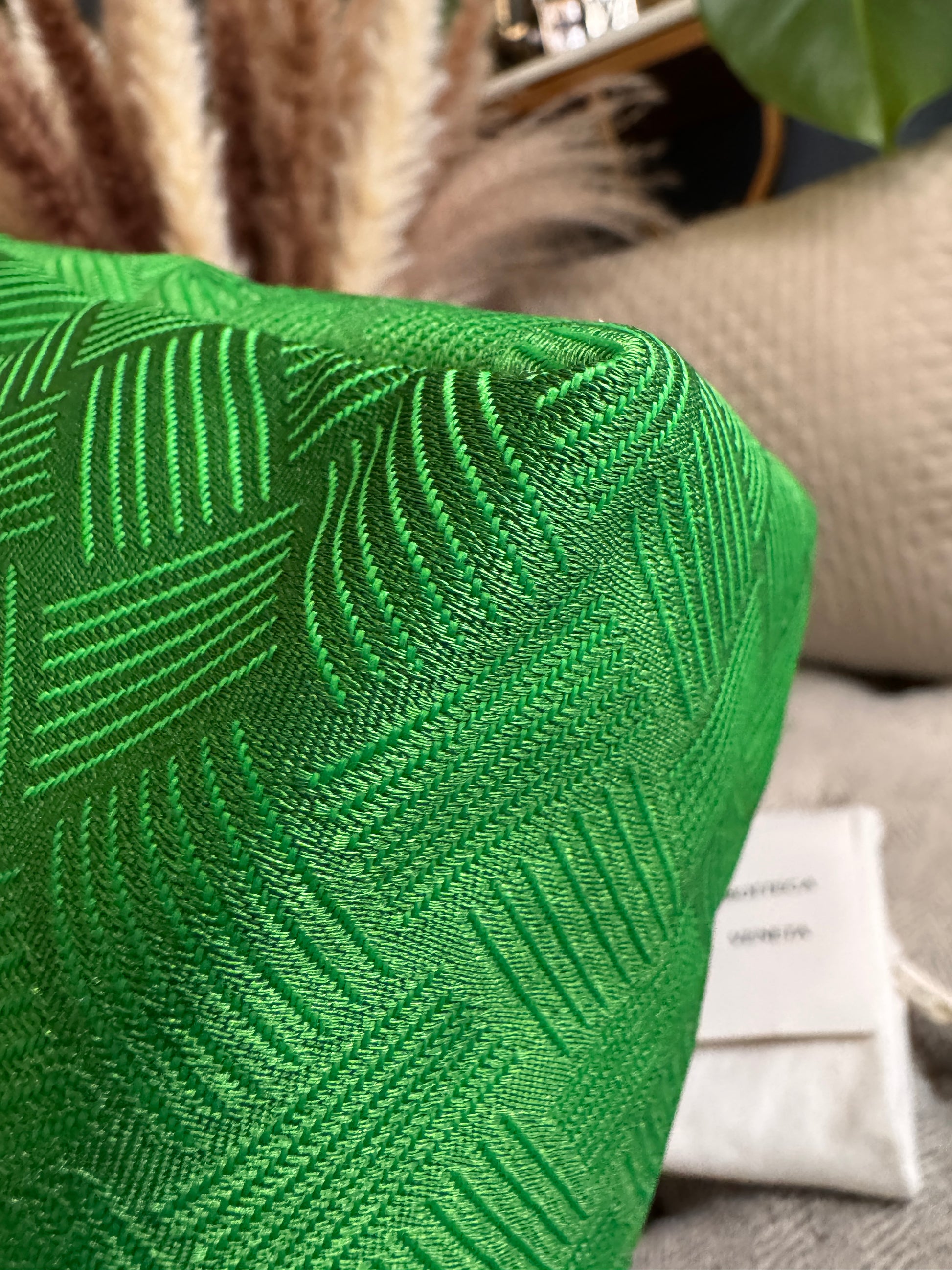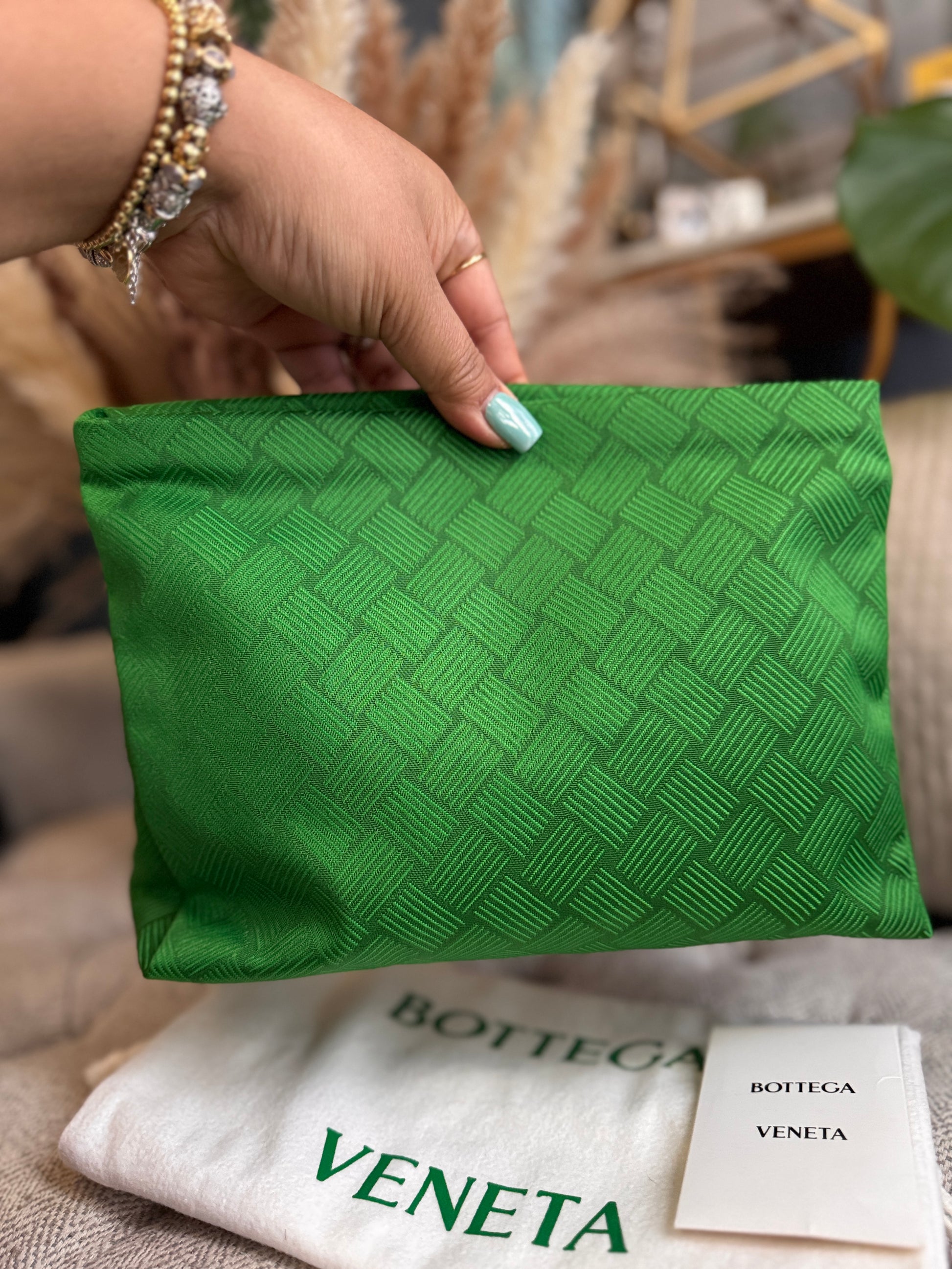 Be bold and stand out with the Bottega Veneta Intrecciato Jaquard Twill Pouch! This beautiful green pouch features a jacquard twill design and measures 24cm in height, 39cm in width, and 13cm in depth, making it the perfect size for a clutch, catchall, or travel pouch. Comes with cards and dustbag. Take a risk and make a statement with this versatile piece! This item has never been used, any signs of wear will be from handling/storage.