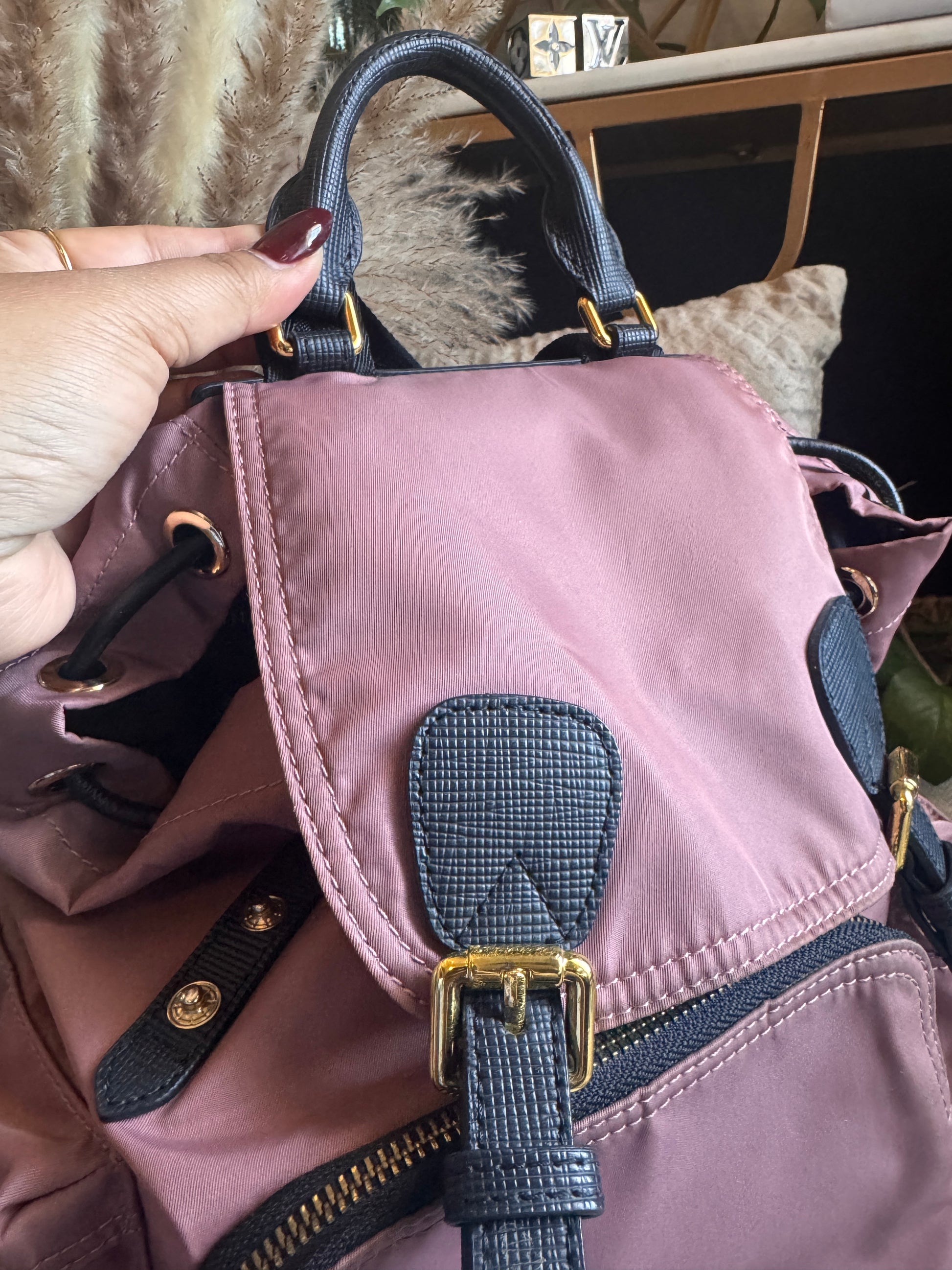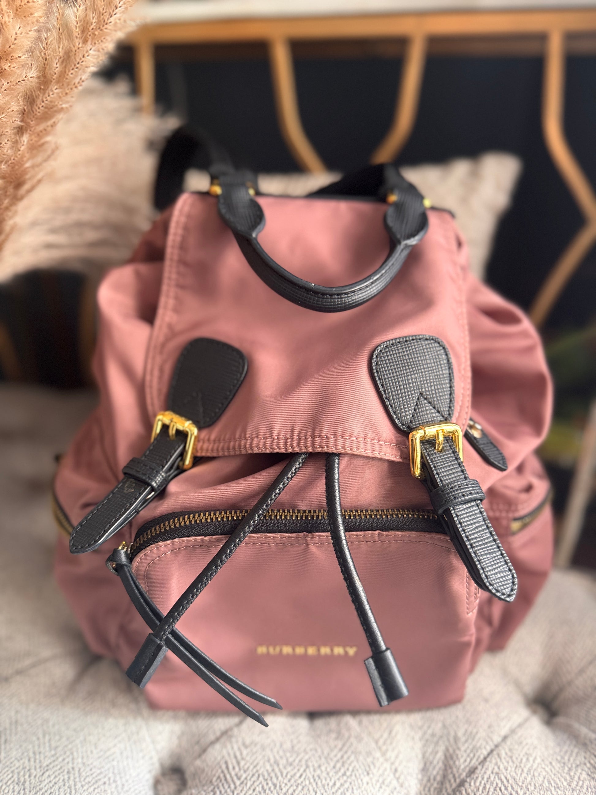 Carry your essentials in style with the Burberry Nylon Backpack. Crafted in chic mauve pink, this bag features adjustable gold chain-link shoulder straps, multiple pockets for easy organization, and a black logo fabric interior. With a playful mix of leather and gold accents, this backpack adds a touch of fun to any outfit. (Dimensions: 16 x 26 x 11 CM)