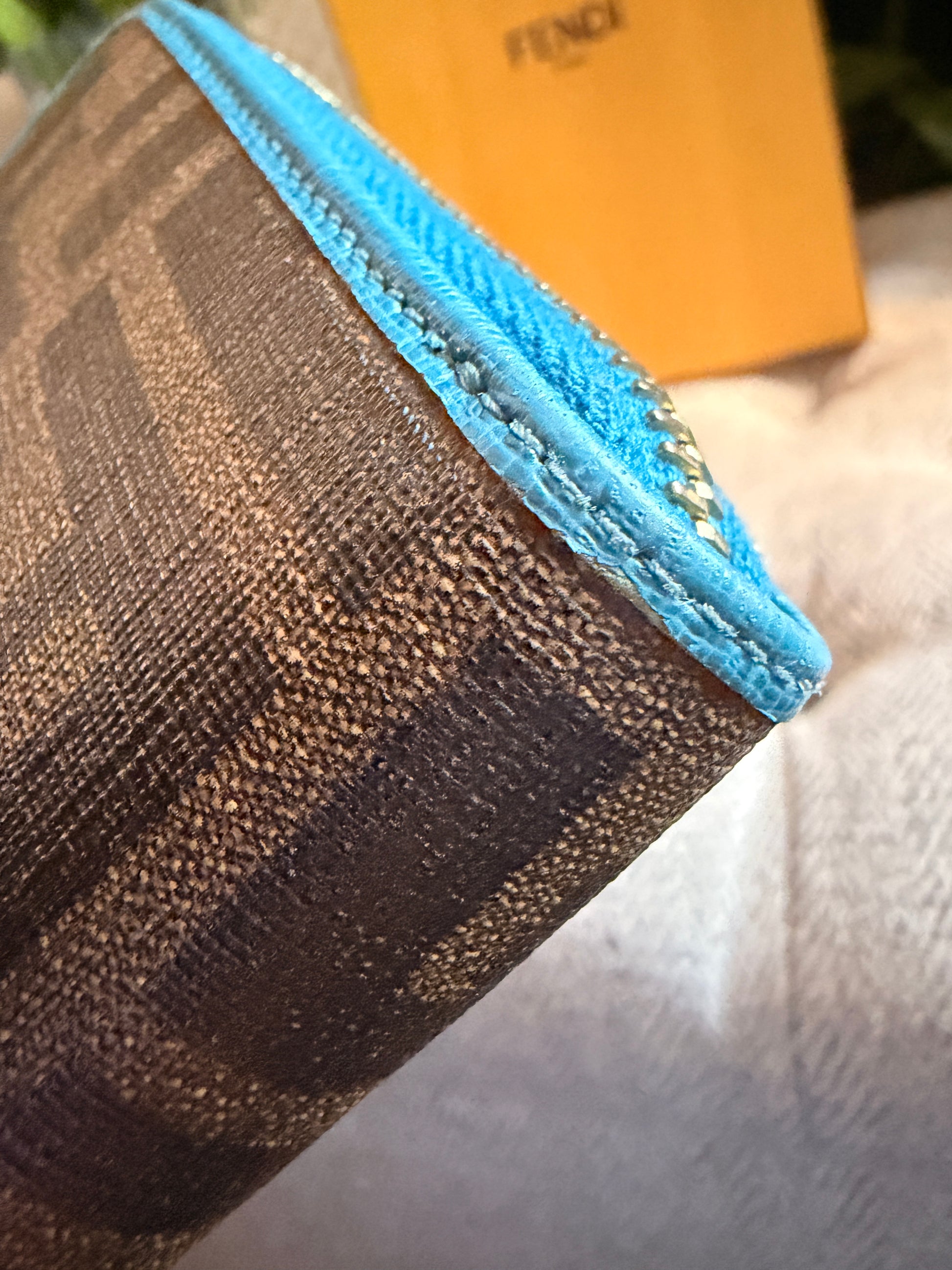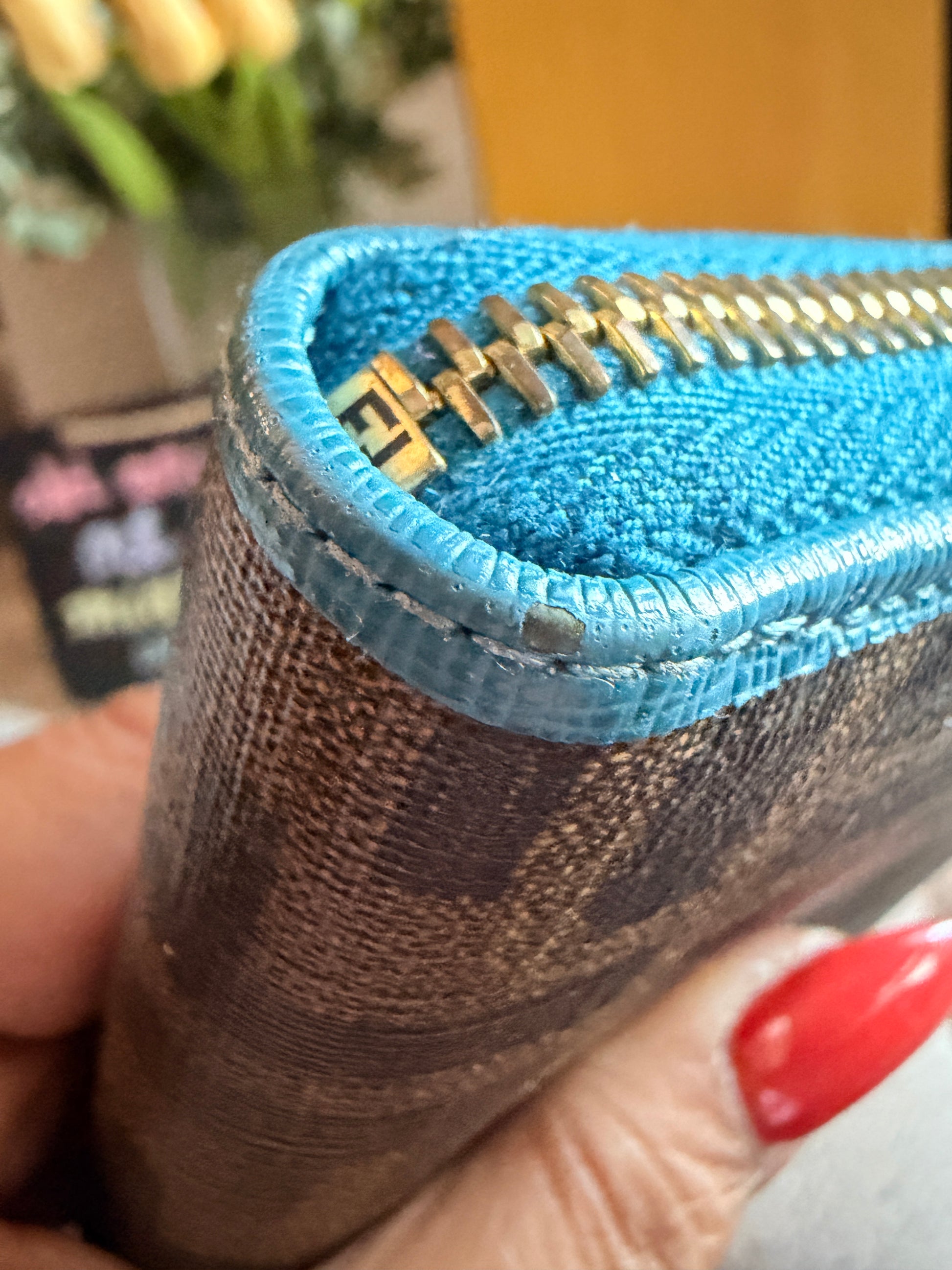 We have a nice shade of turquoise mixed in with the classic logo print on this full sized zippy. It does show some corner wear so please do take the time to look at photos closely in case this might bother you. Photos are zoomed in so it’s worse than it actually looks in real life but it’s there so bear this in mind. Overall this wallet is charming and is still in wonderful condition and will be a great spring/summer wallet!