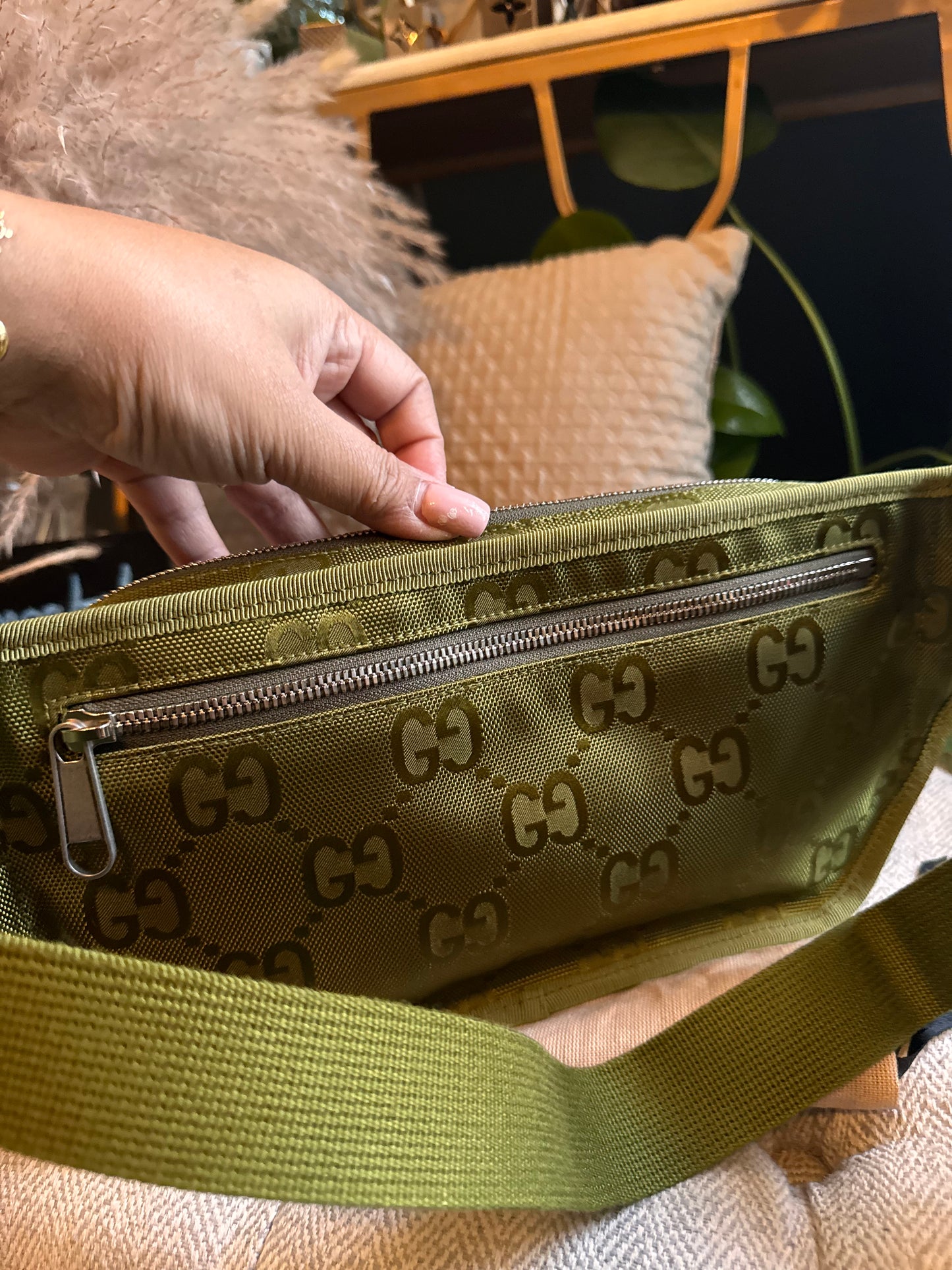 The Gucci Off the Grid Beltbag is more than just a stylish accessory, it's a statement of sustainability. Made with recycled and responsibly sourced materials, this chic belt bag features the iconic Gucci GG monogram in juniper green Econyl nylon. Perfect for the eco-conscious fashionista on-the-go.