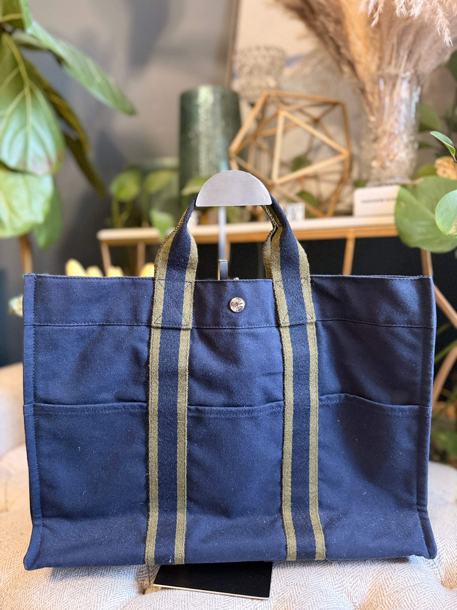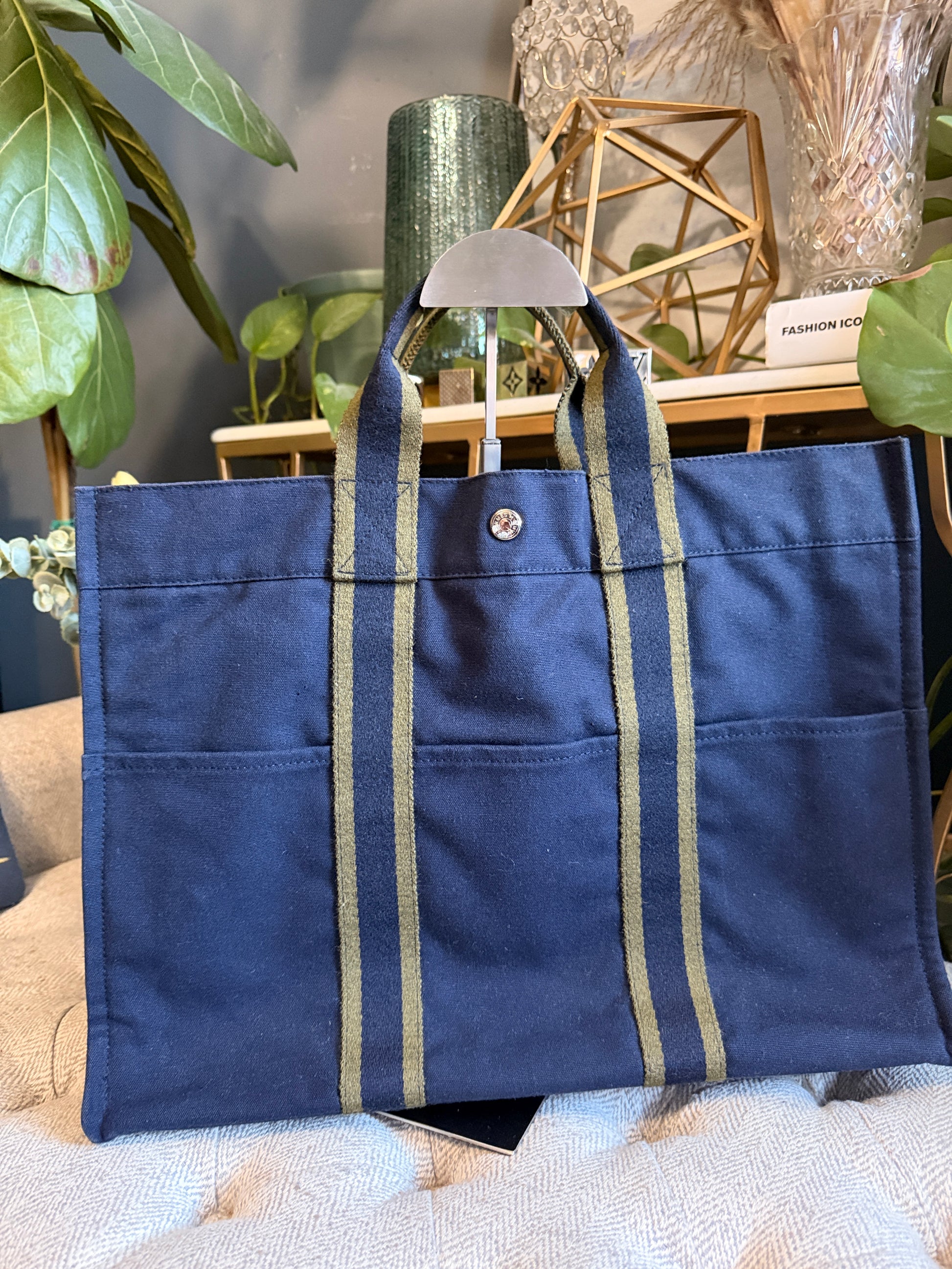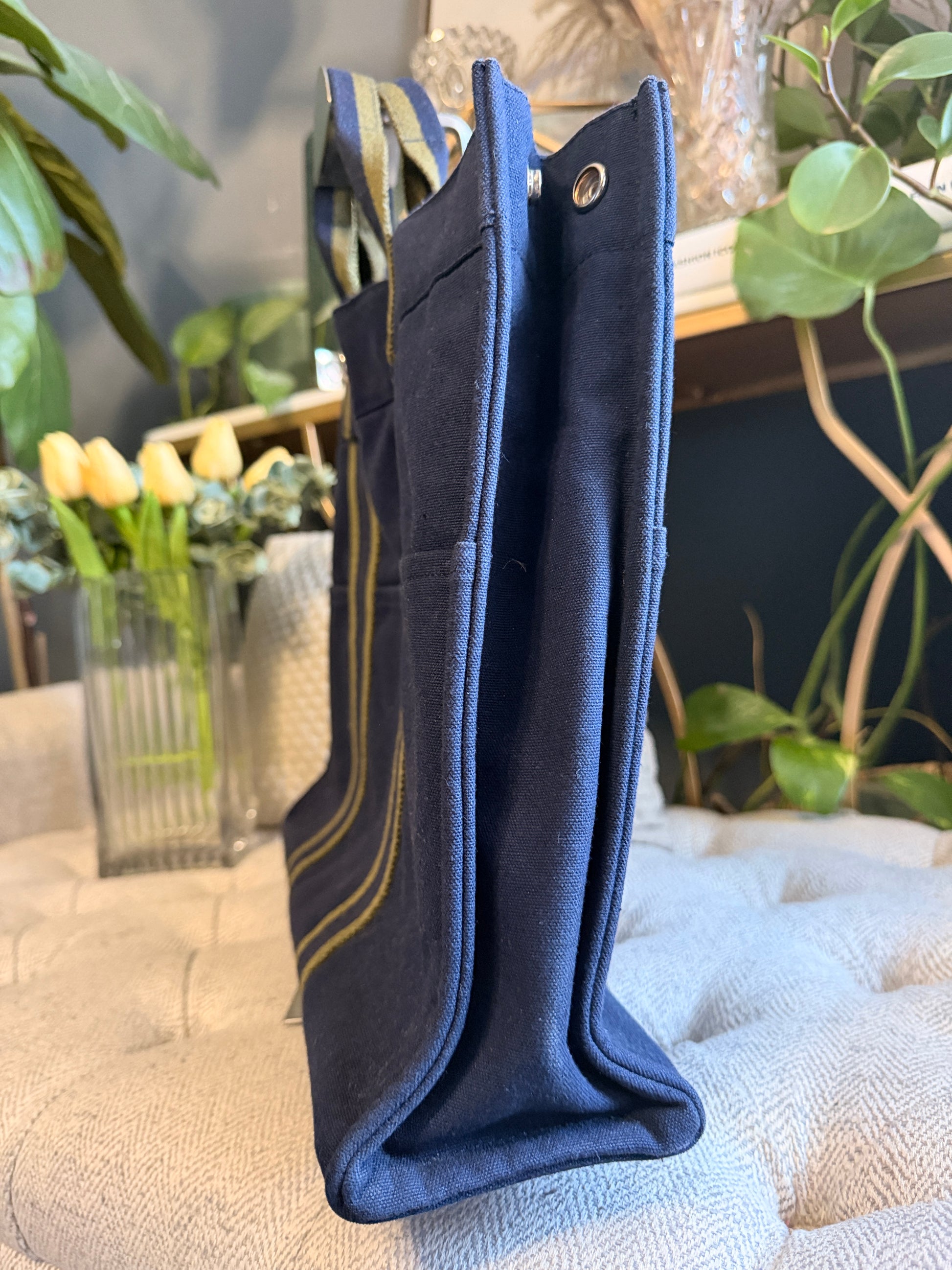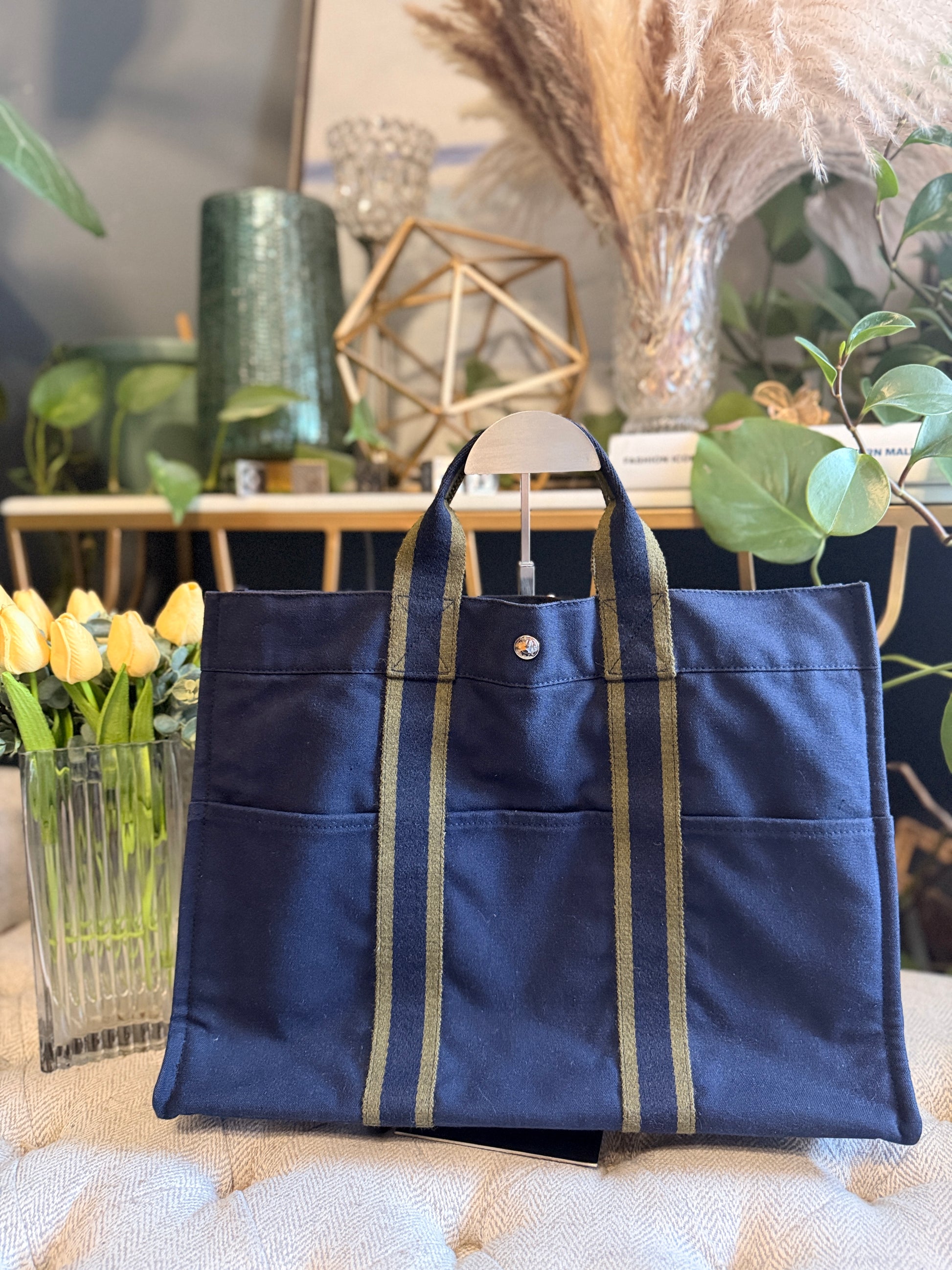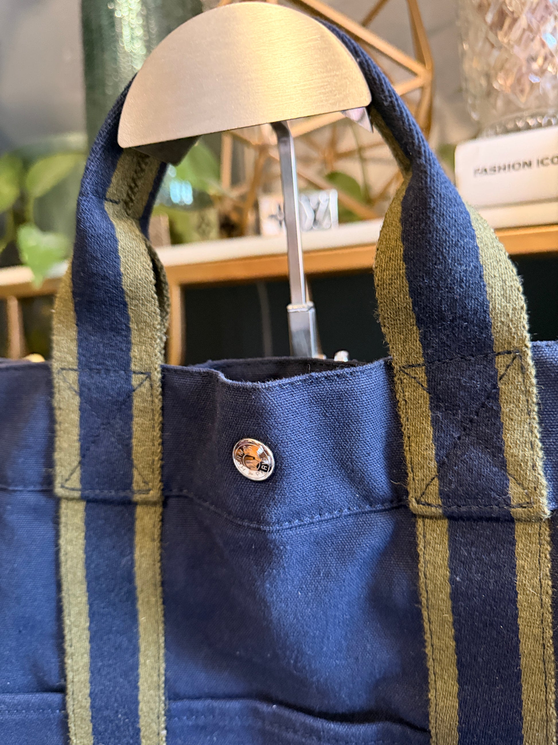Designed by luxury brand Hermes, the Fourre Tout tote is the perfect everyday companion. Crafted with durable canvas in a sleek dark blue color, this preloved bag is in great condition. This tote geatures 6 exterior slip pockets with 2 webbed handle straps with green-tone trim. Has a concealed snap closure and tonal . stitching.