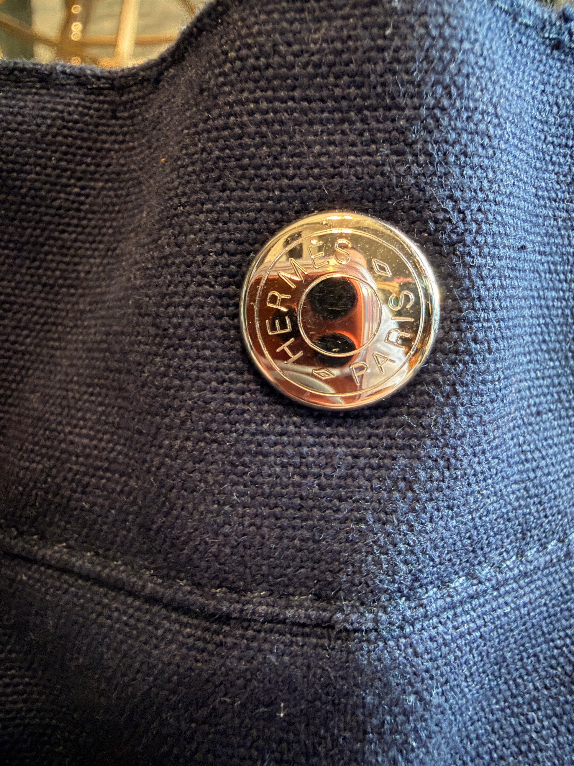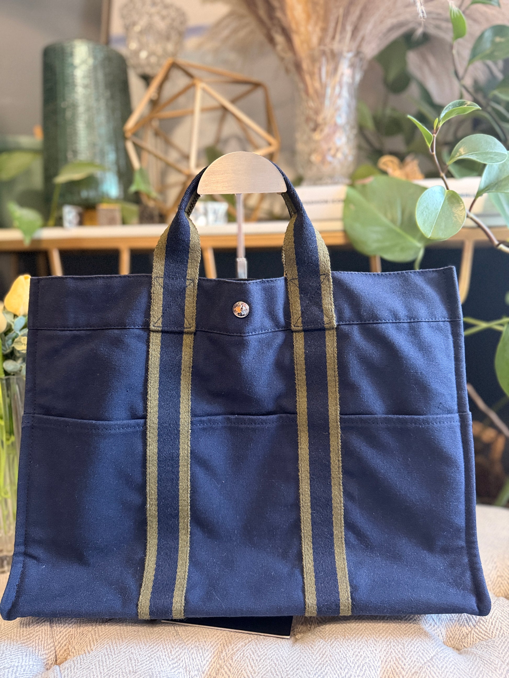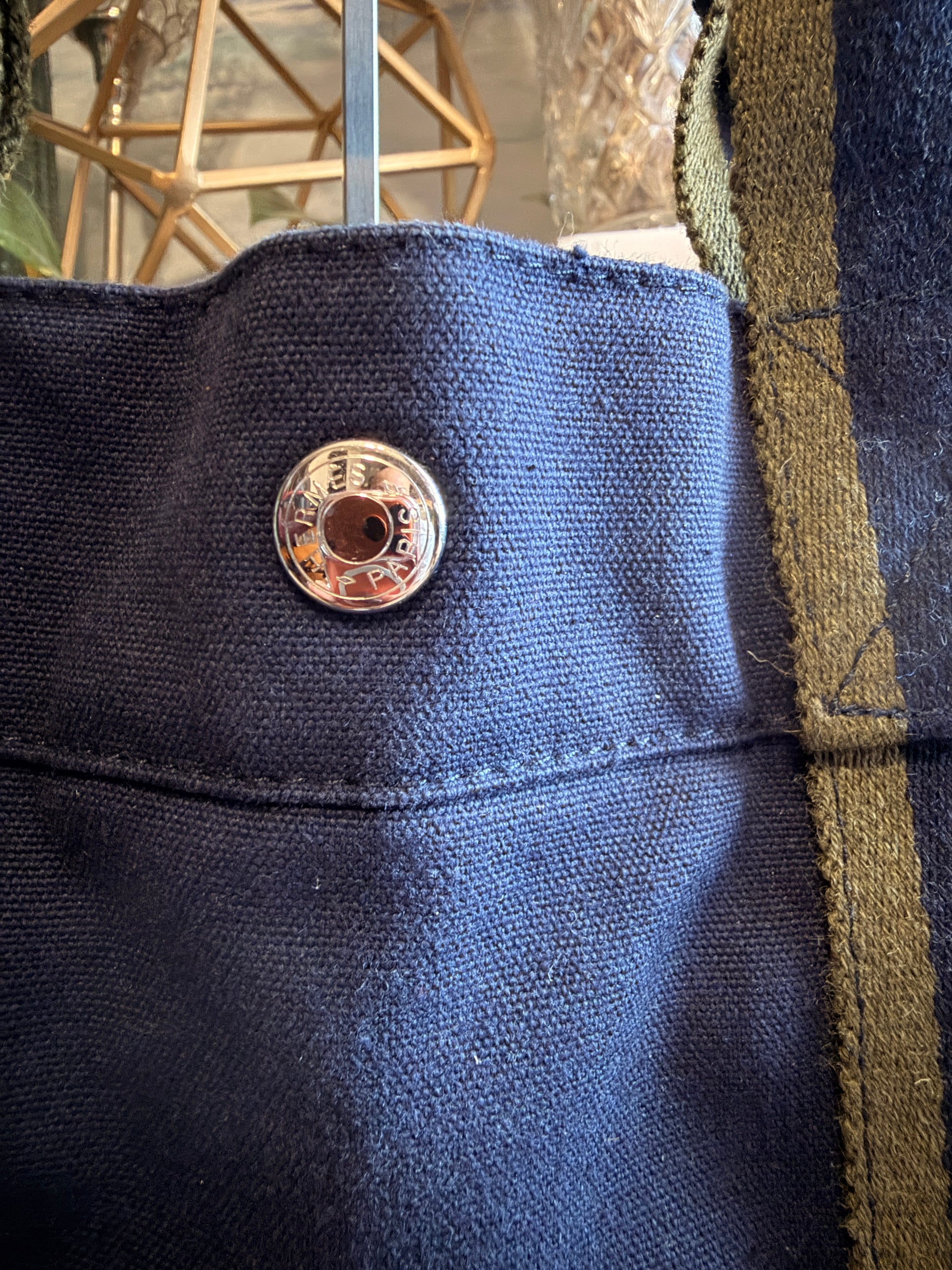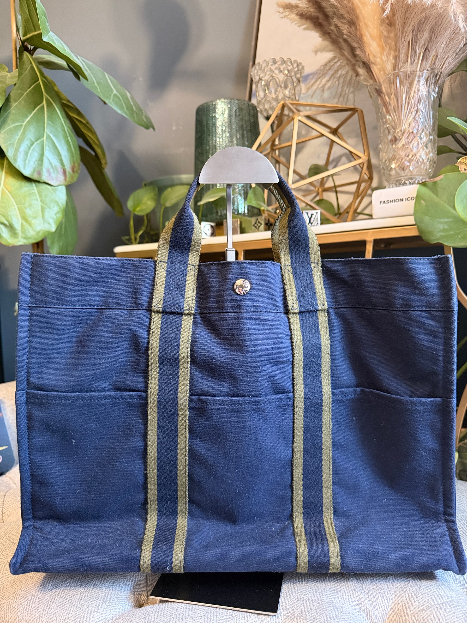 Designed by luxury brand Hermes, the Fourre Tout tote is the perfect everyday companion. Crafted with durable canvas in a sleek dark blue color, this preloved bag is in great condition. This tote geatures 6 exterior slip pockets with 2 webbed handle straps with green-tone trim. Has a concealed snap closure and tonal . stitching.