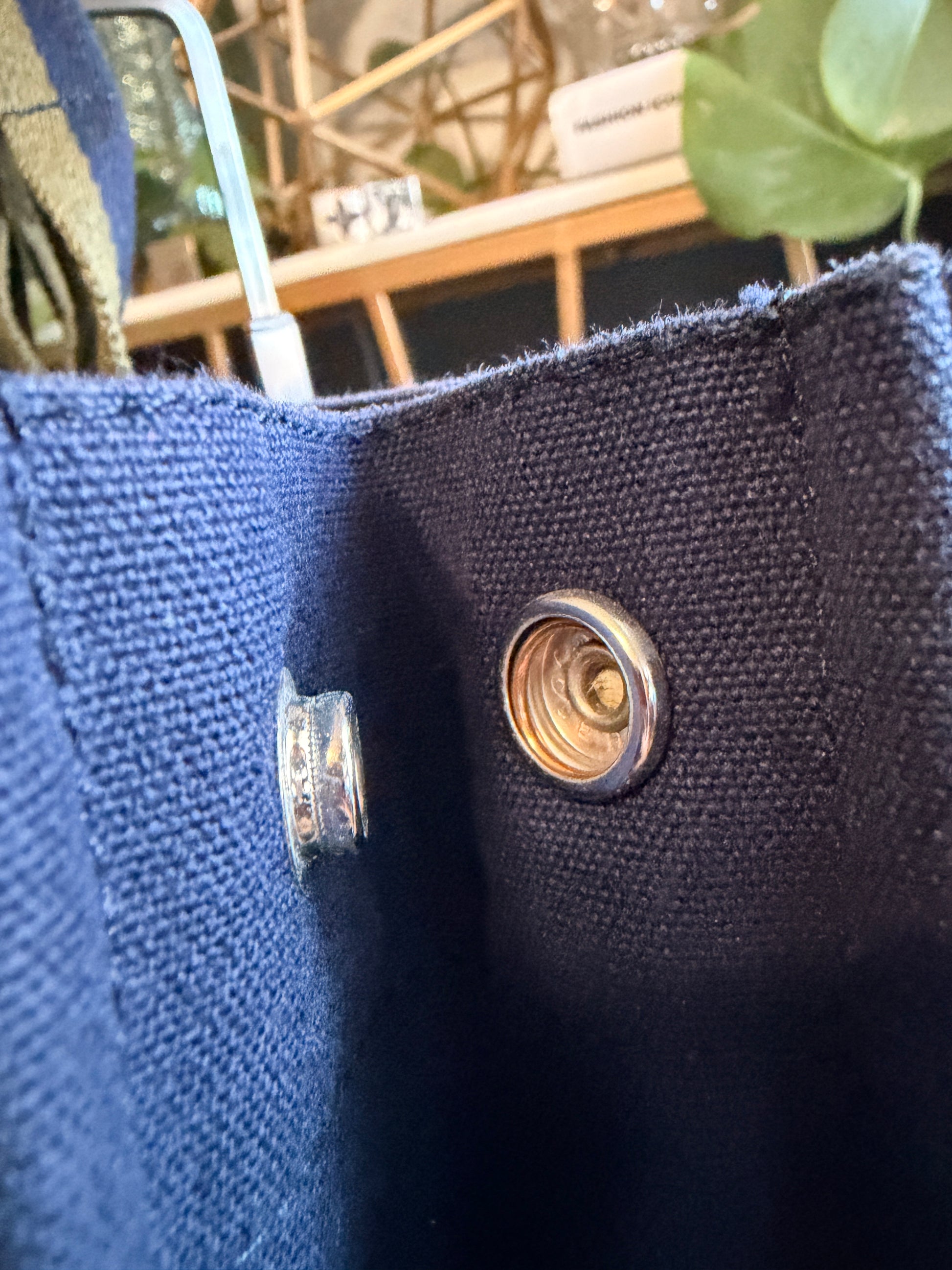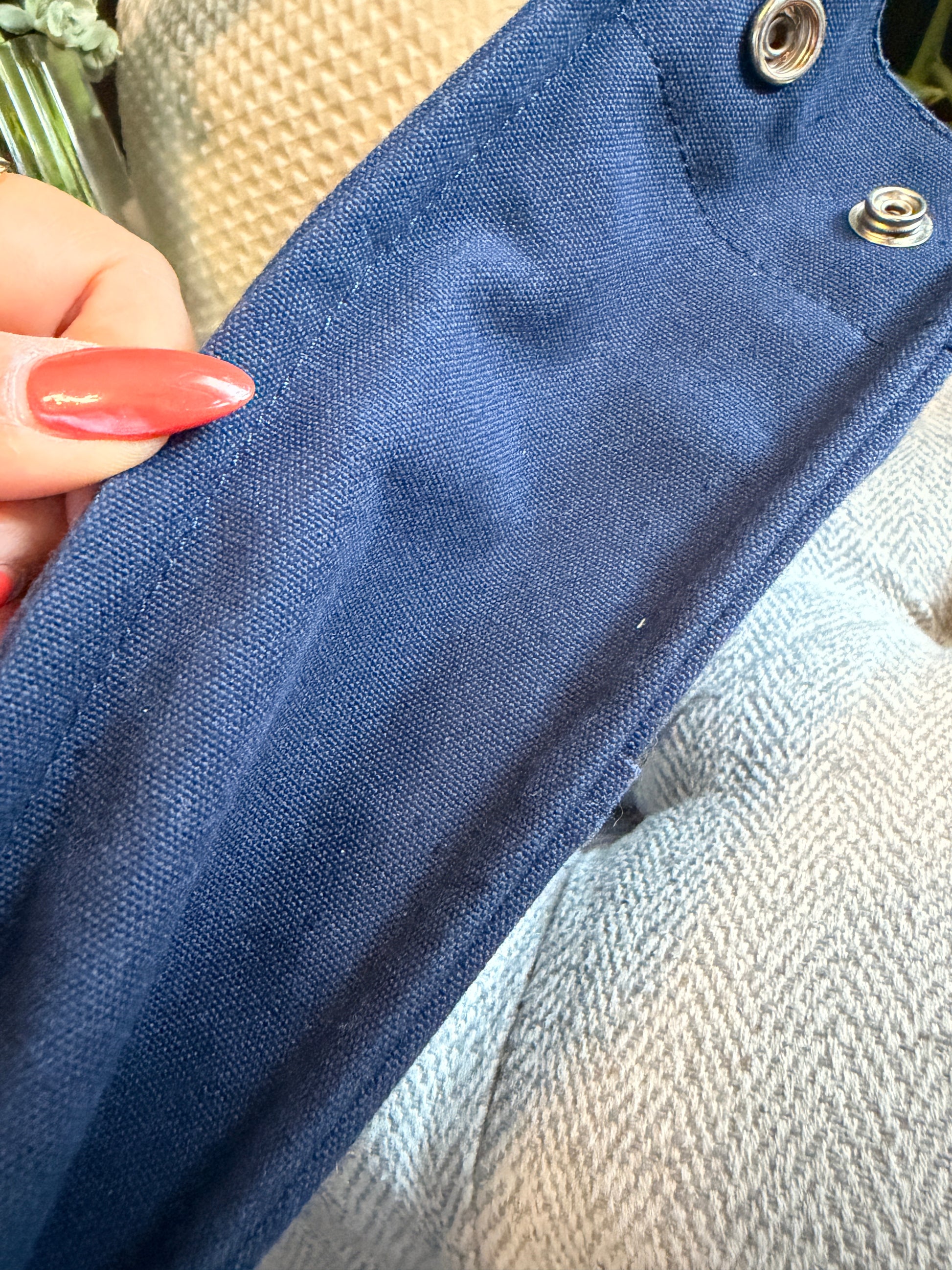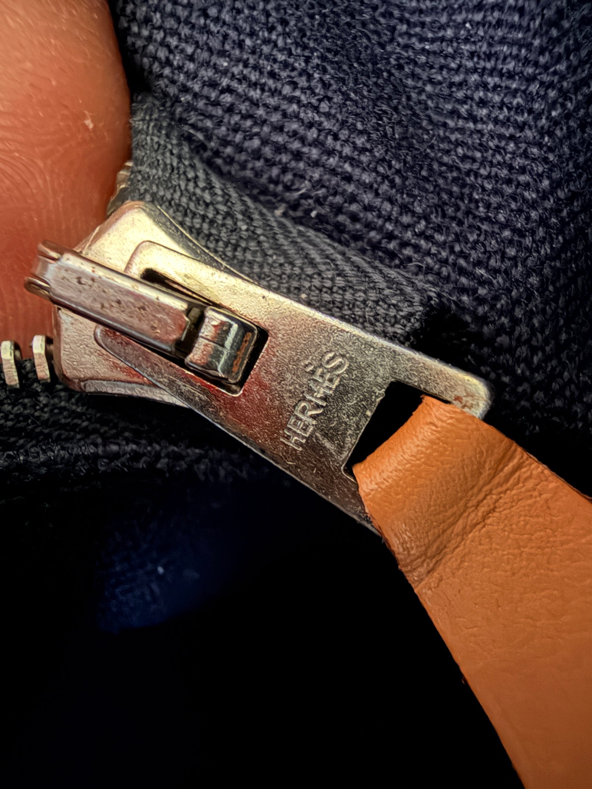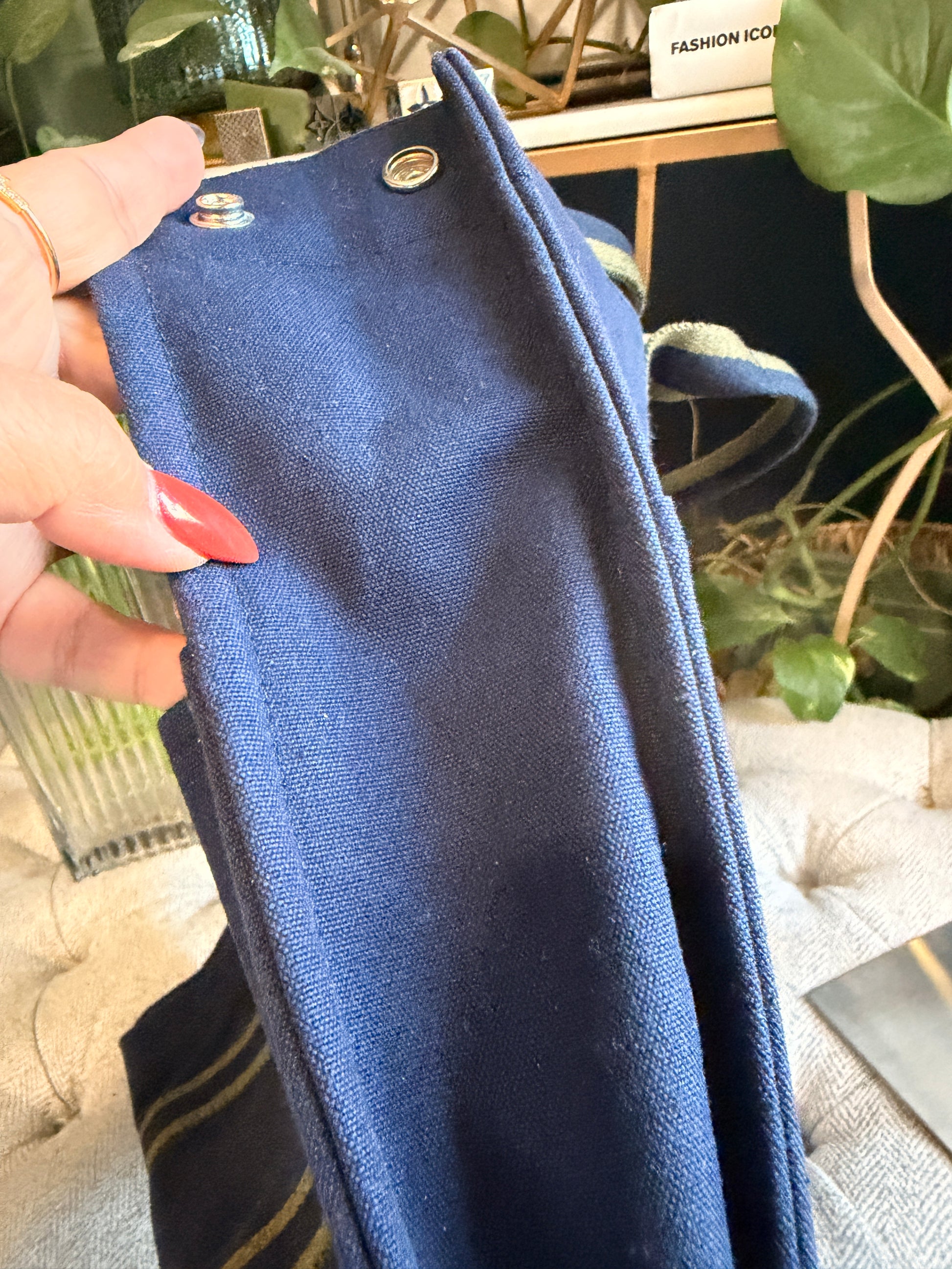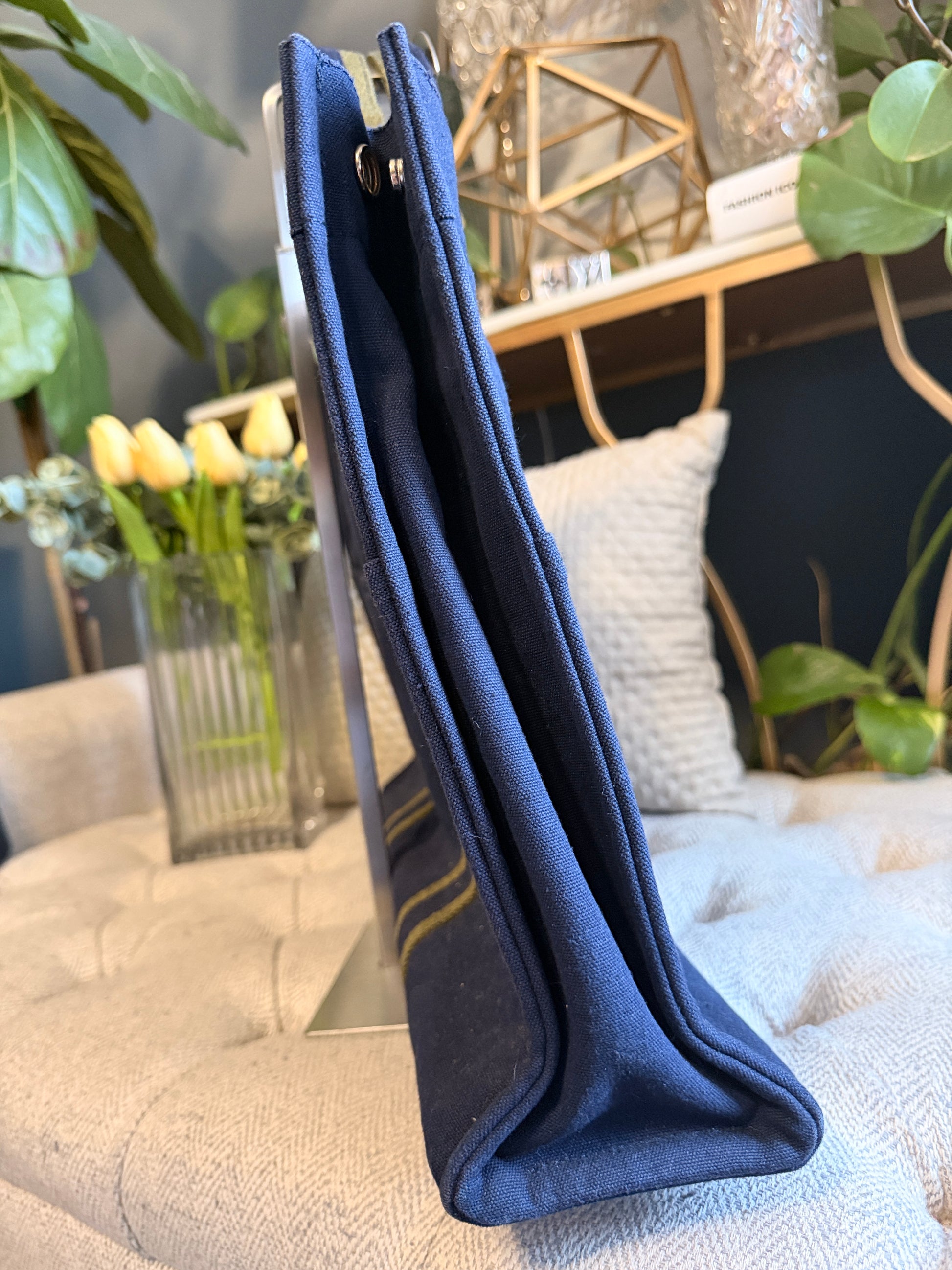 Designed by luxury brand Hermes, the Fourre Tout tote is the perfect everyday companion. Crafted with durable canvas in a sleek dark blue color, this preloved bag is in great condition. This tote geatures 6 exterior slip pockets with 2 webbed handle straps with green-tone trim. Has a concealed snap closure and tonal . stitching.