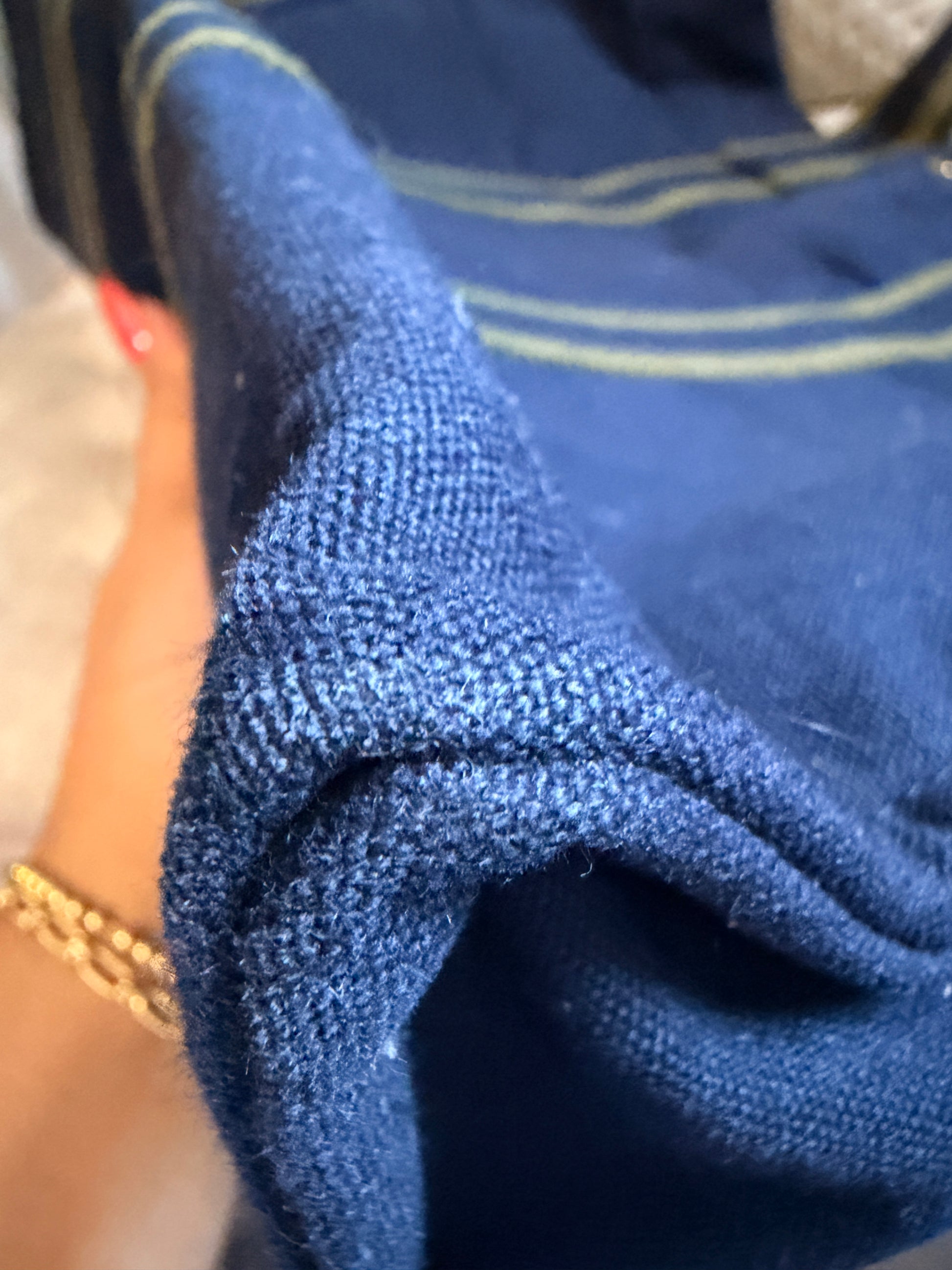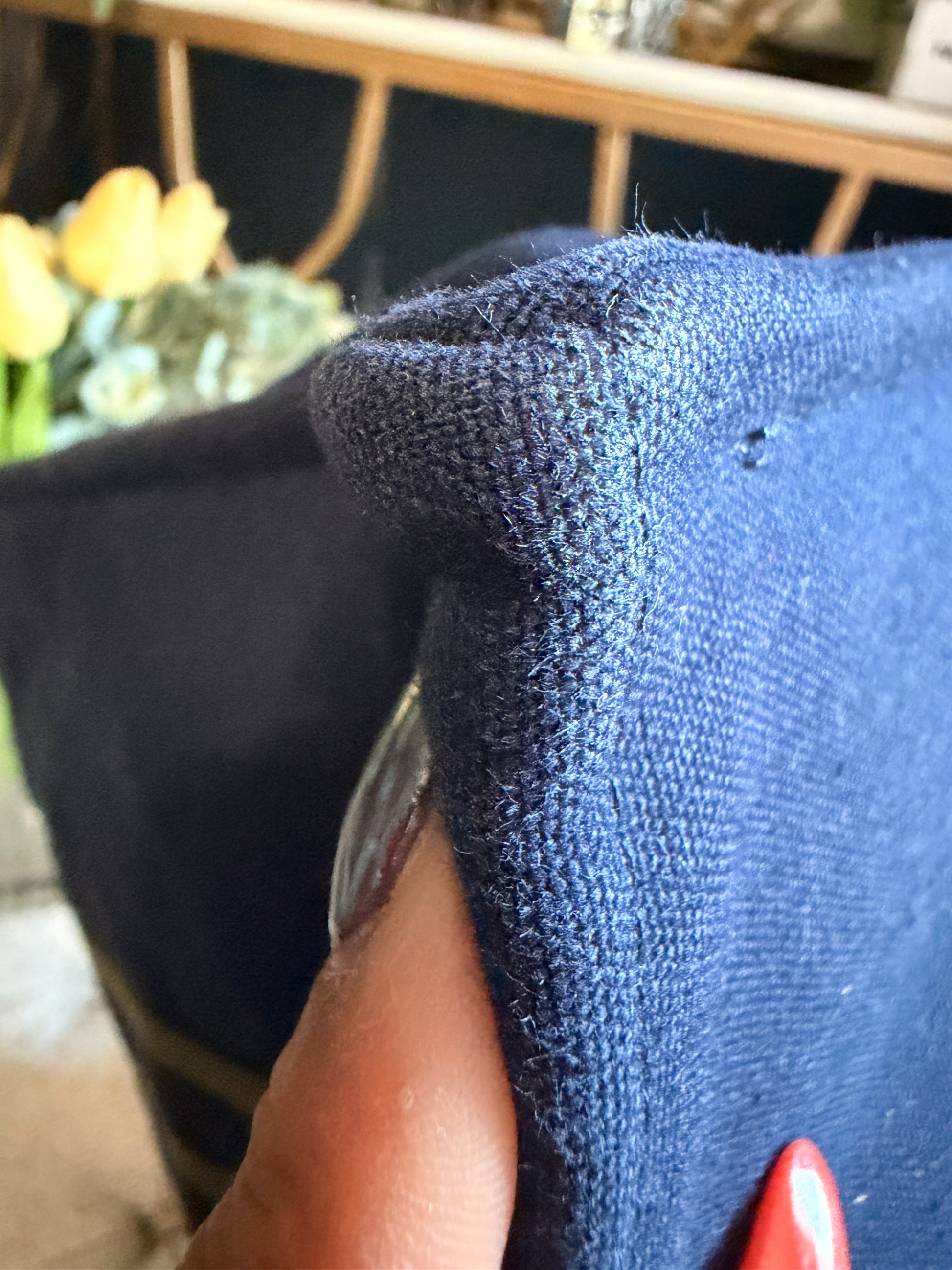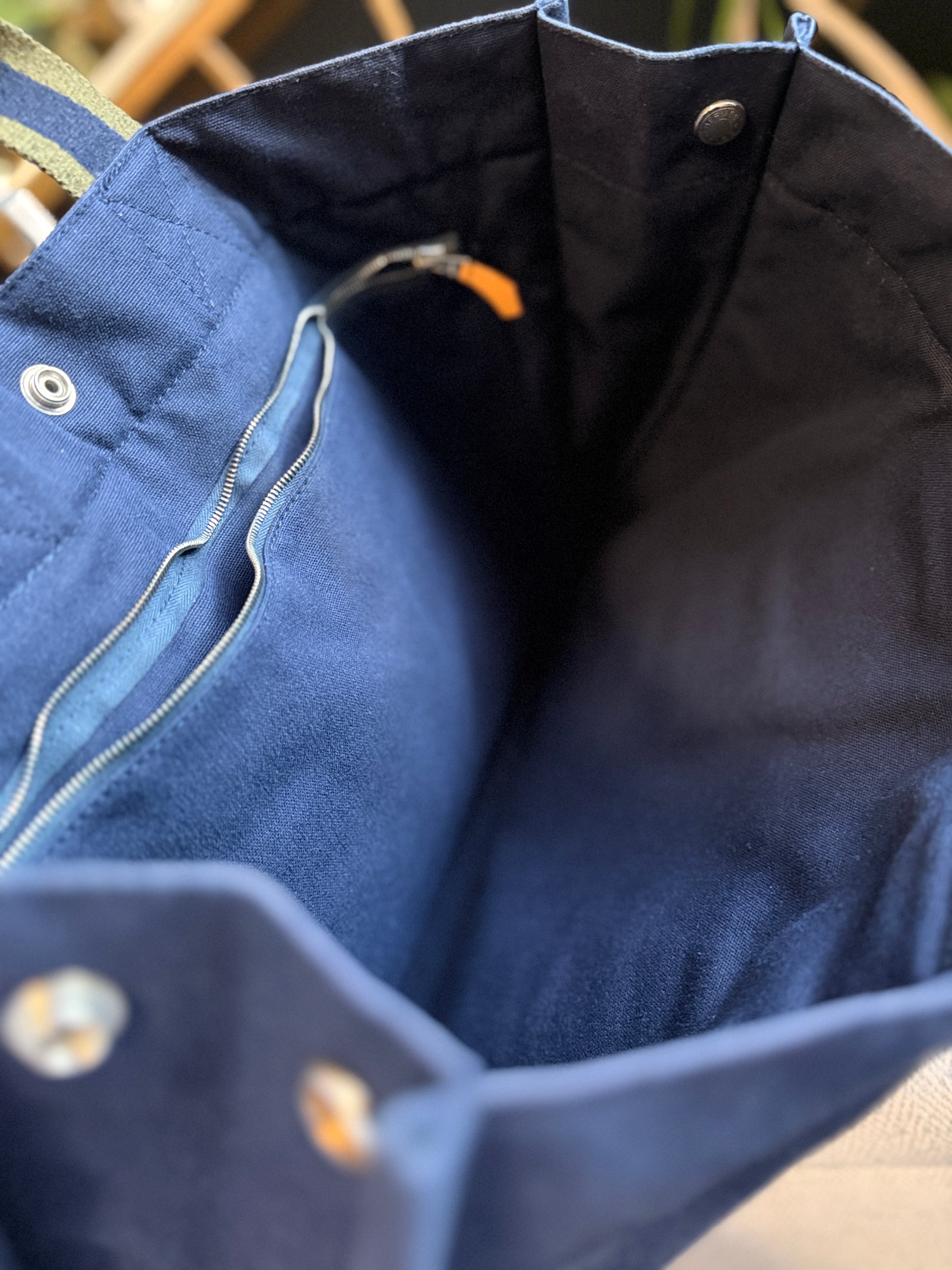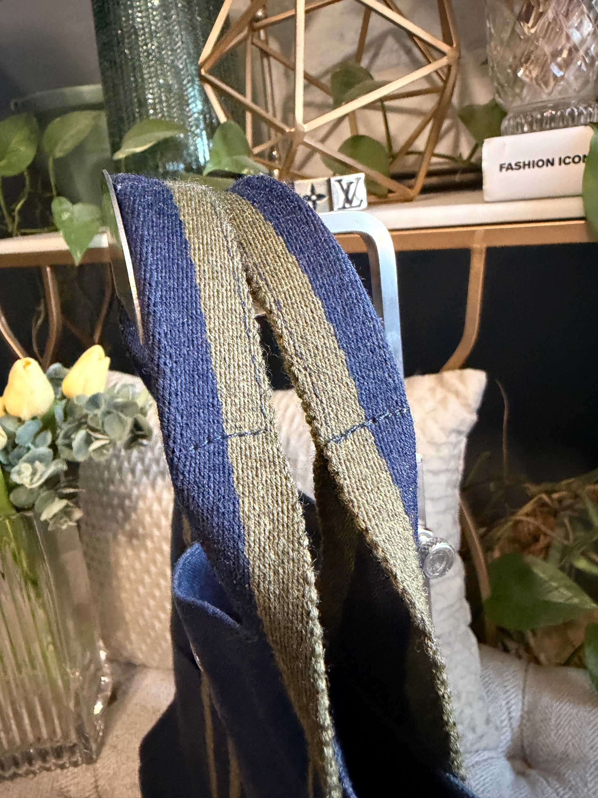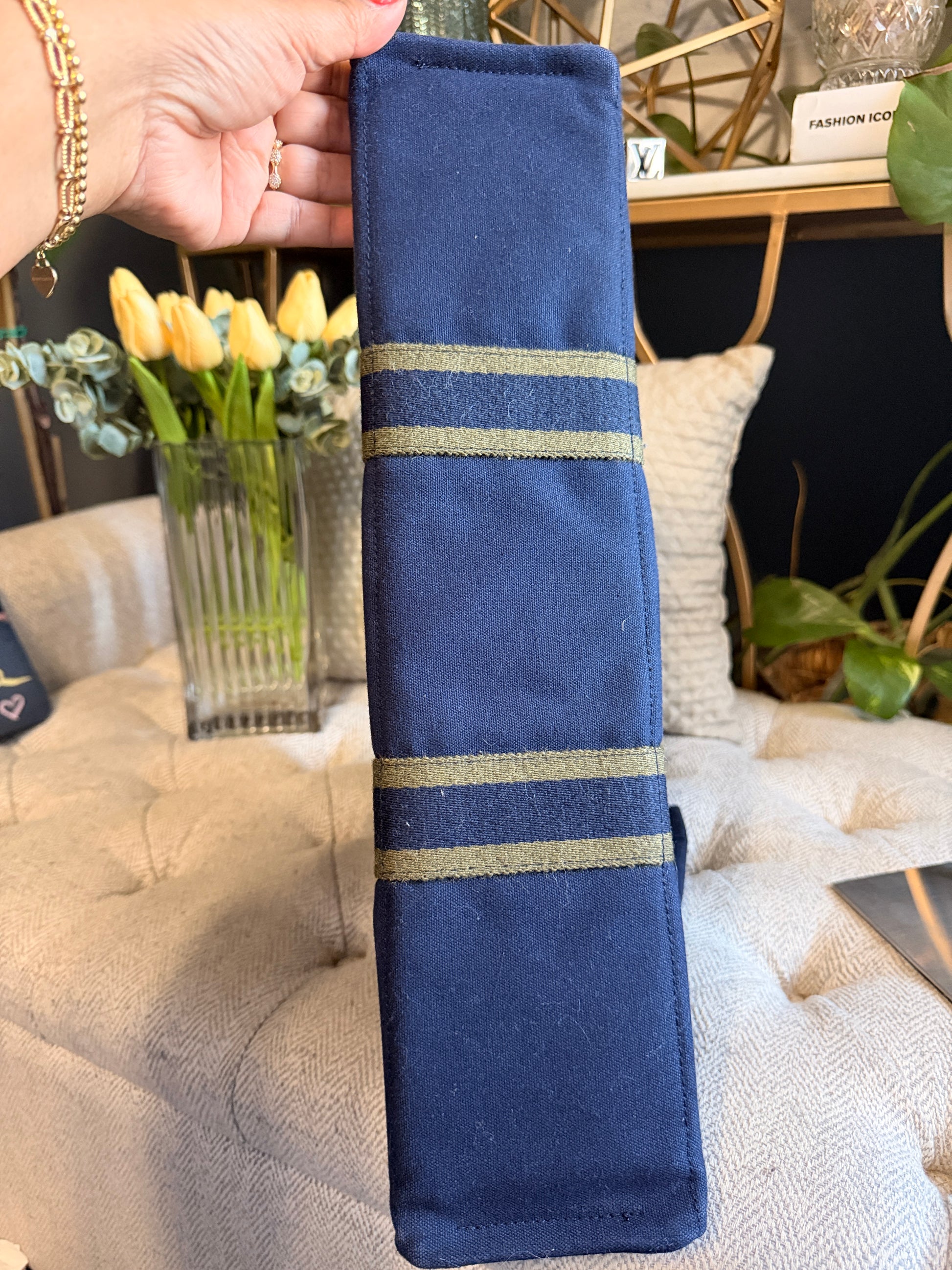 Designed by luxury brand Hermes, the Fourre Tout tote is the perfect everyday companion. Crafted with durable canvas in a sleek dark blue color, this preloved bag is in great condition. This tote geatures 6 exterior slip pockets with 2 webbed handle straps with green-tone trim. Has a concealed snap closure and tonal . stitching.
