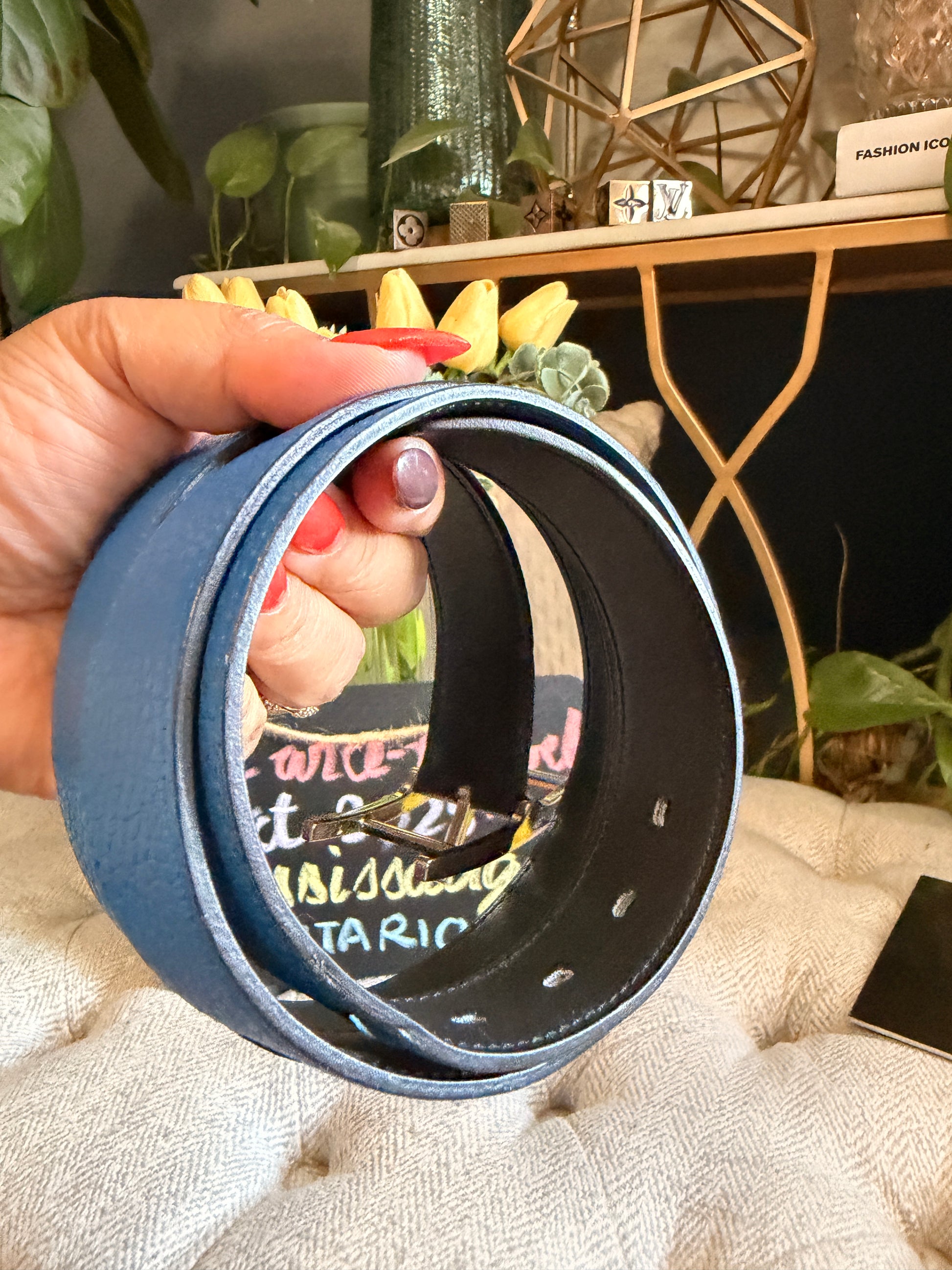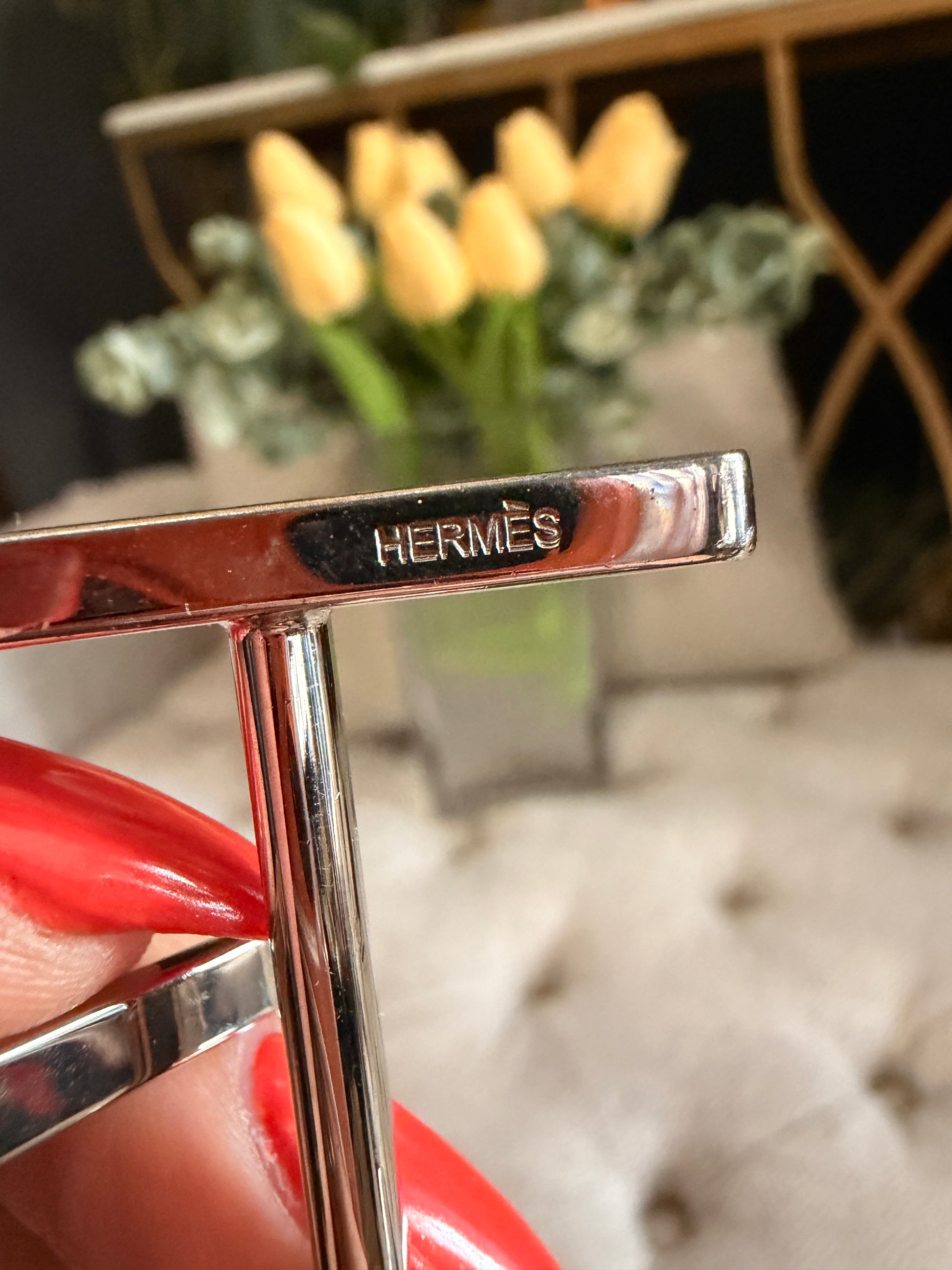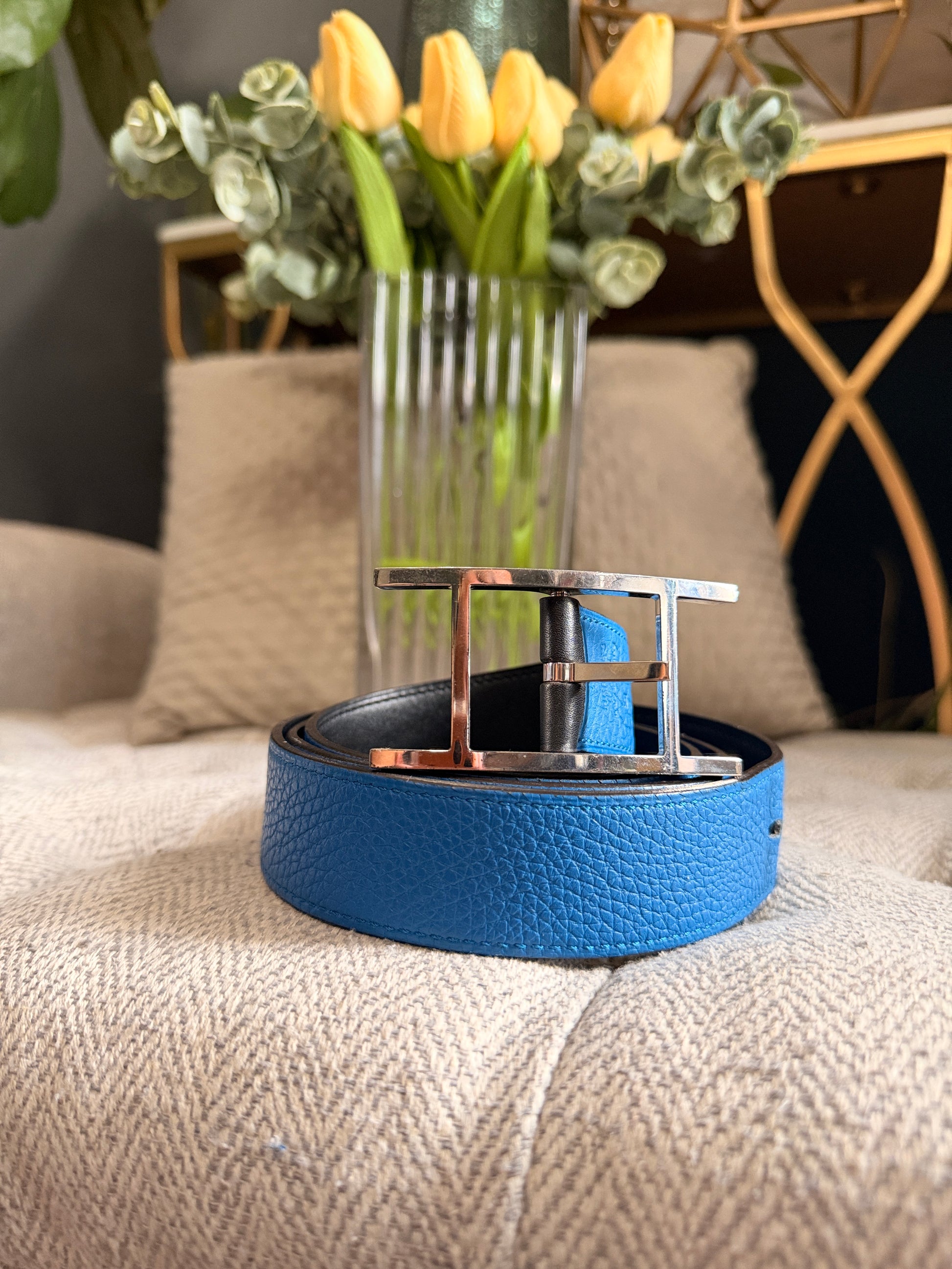 Rev up your style with the Hermes Quentin Reversible Belt. This playful, dual-sided leather belt is crafted in France and features a sleek palladium-plated buckle. With a width of 32 mm, size 100, it's perfect for both everyday wear and special occasions. Get it preloved in beautiful condition at a steal of a price (Retail price is currently $1425 cad plus taxes )