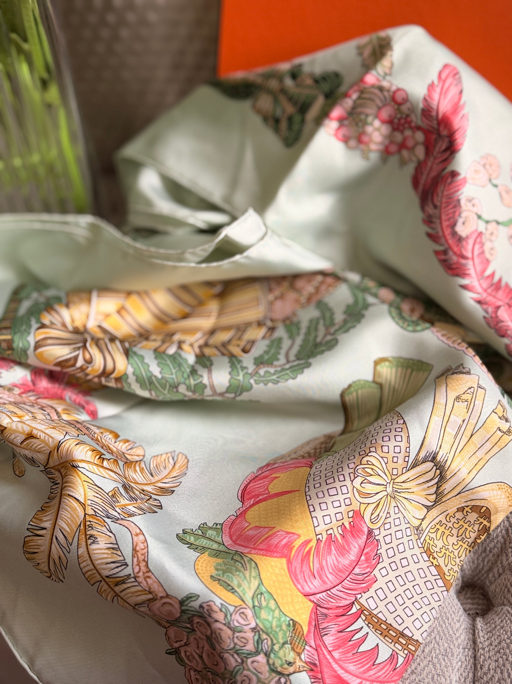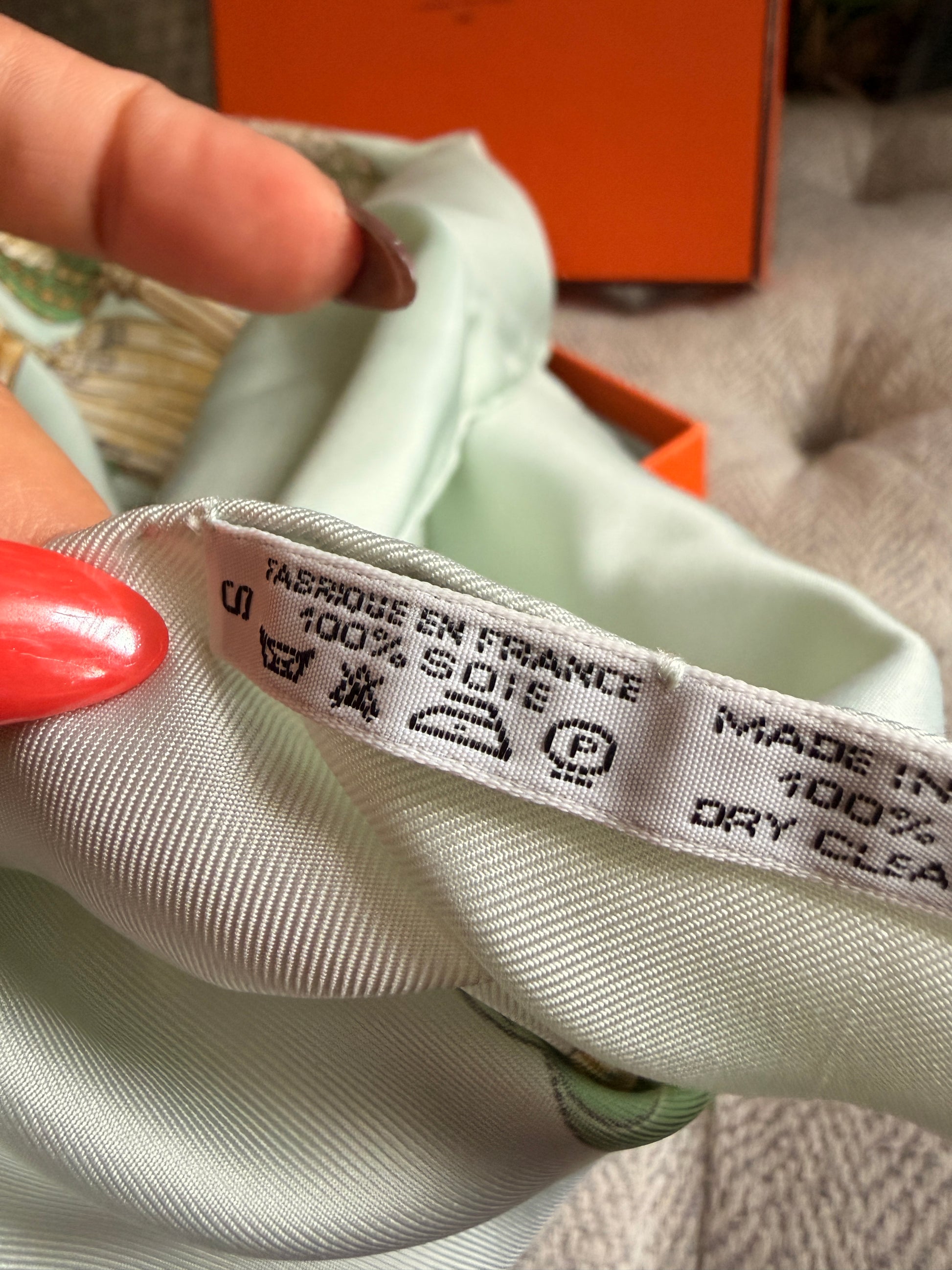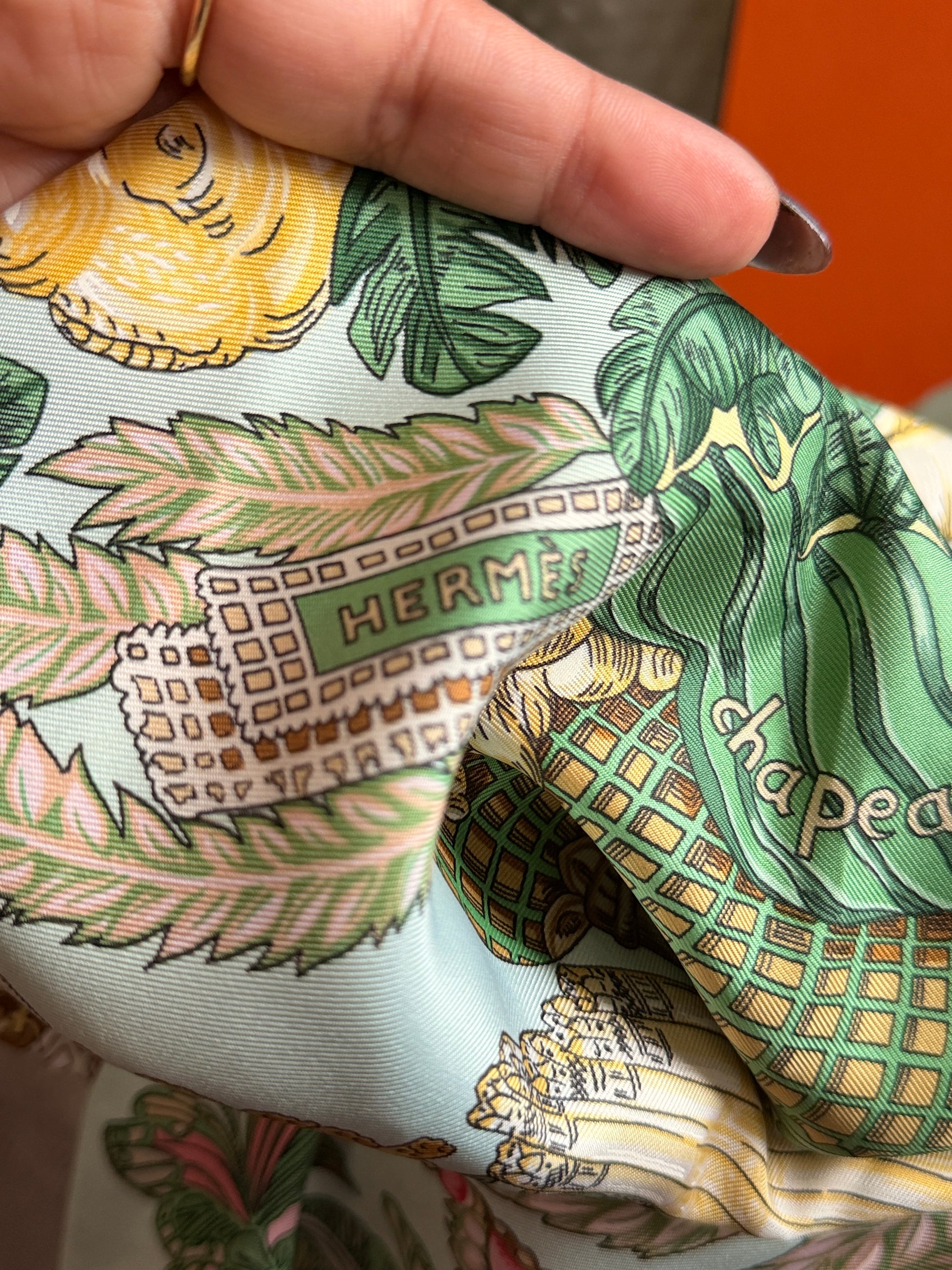 This limited edition silk handkerchief from Hermes is designed by Annie Faivre. The rolled edges add a touch of elegance to the luxurious 100% silk material. Measuring 90 x 90 cm, it is made in France and part of the 90's Collection. Elevate your style with this timeless and versatile scarf.