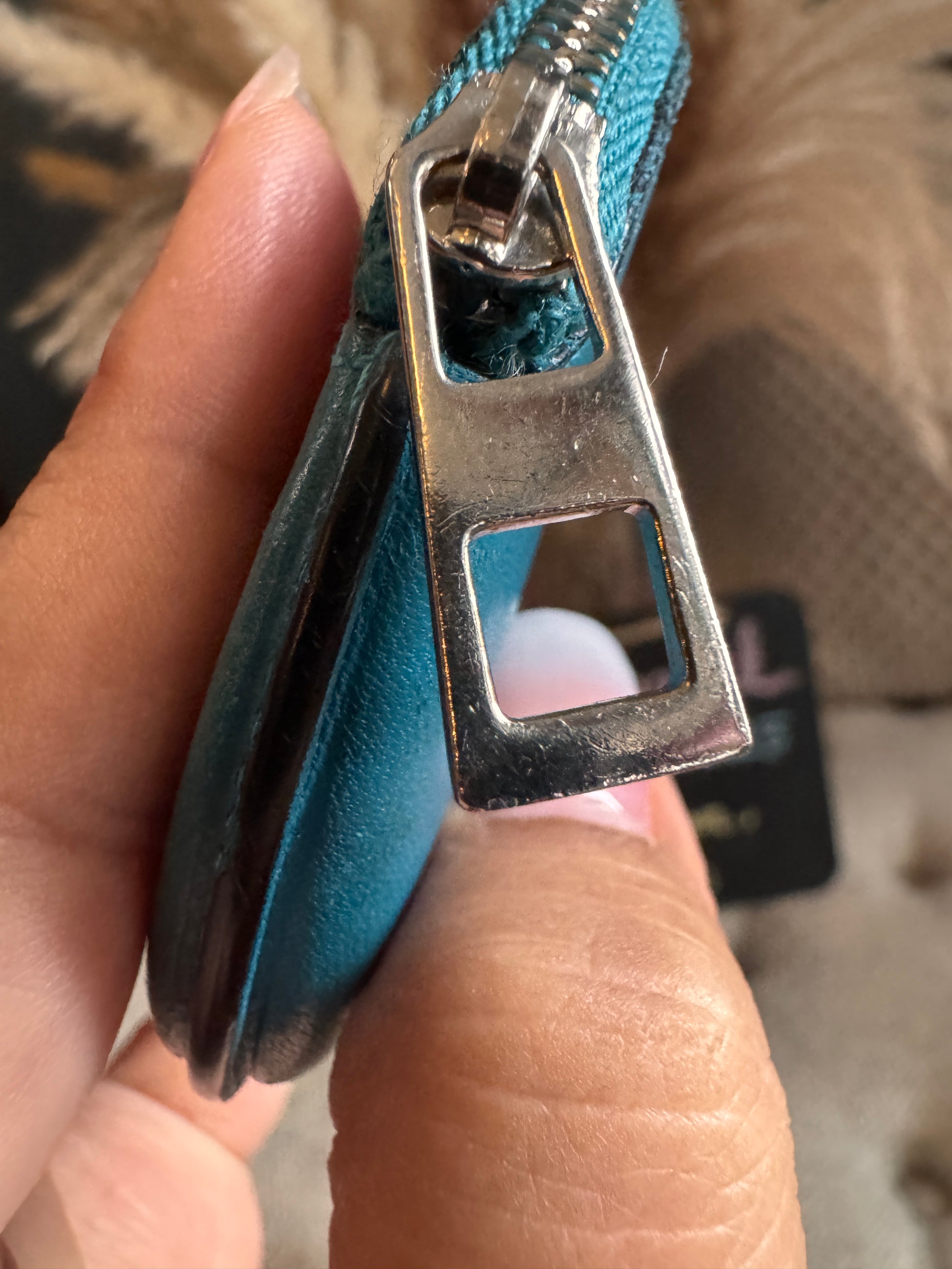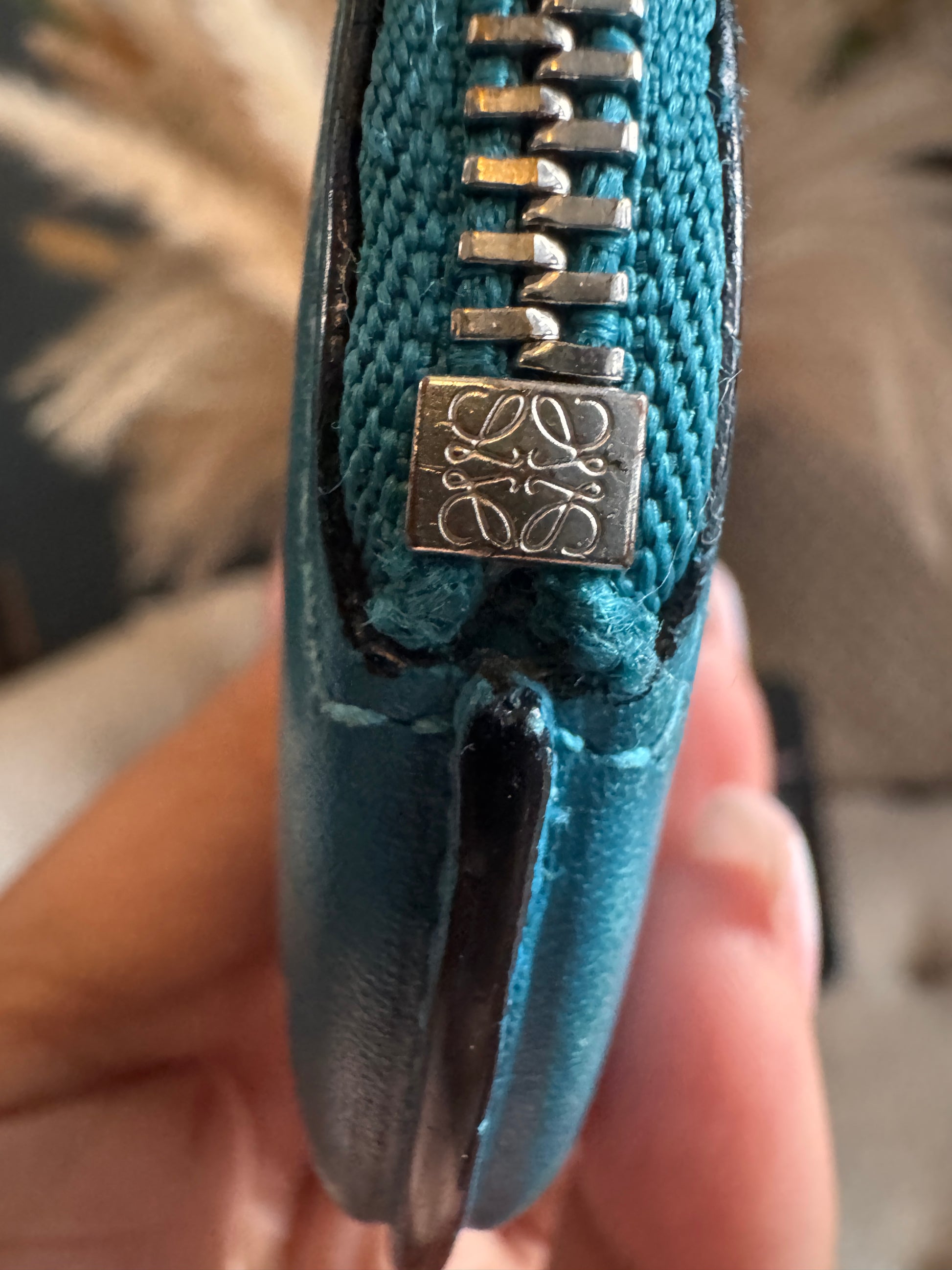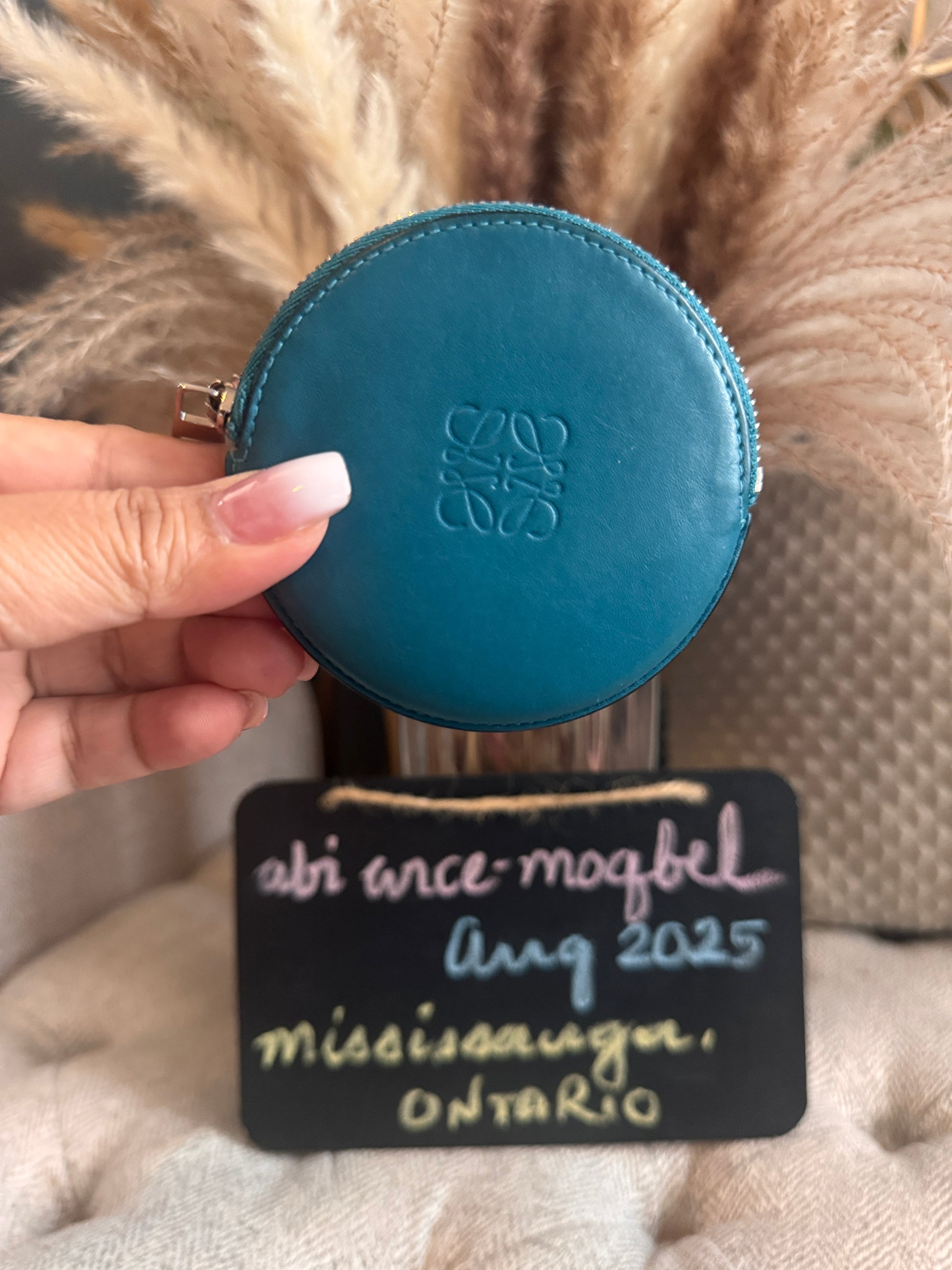Crafted from beautiful teal leather and featuring a sleek black interior, the Loewe Leather Round Coin Purse is an elegant yet practical accessory. Despite some signs of use on the leather, it is still in excellent condition and the silver hardware adds a touch of sophistication. The stunning anagram on the front adds a unique touch to this versatile purse. No inclusions.