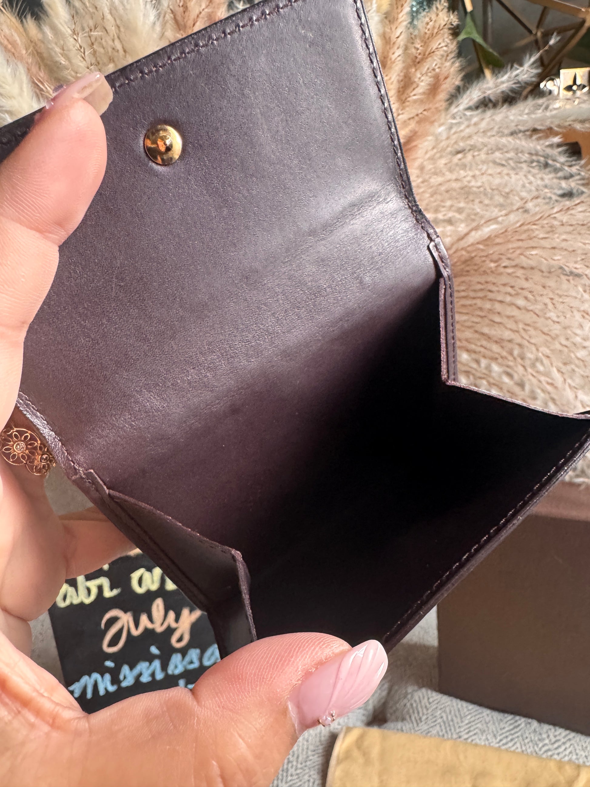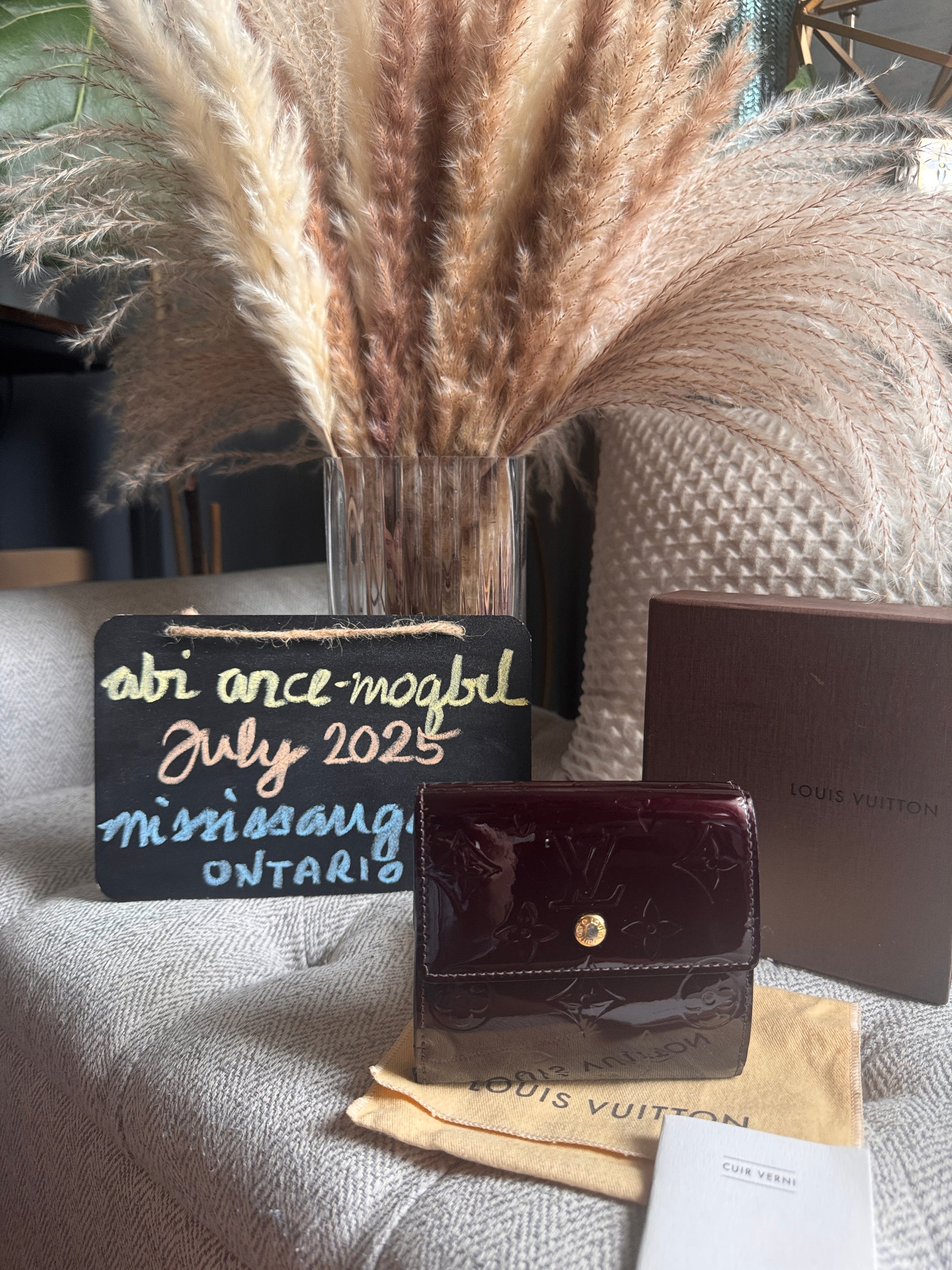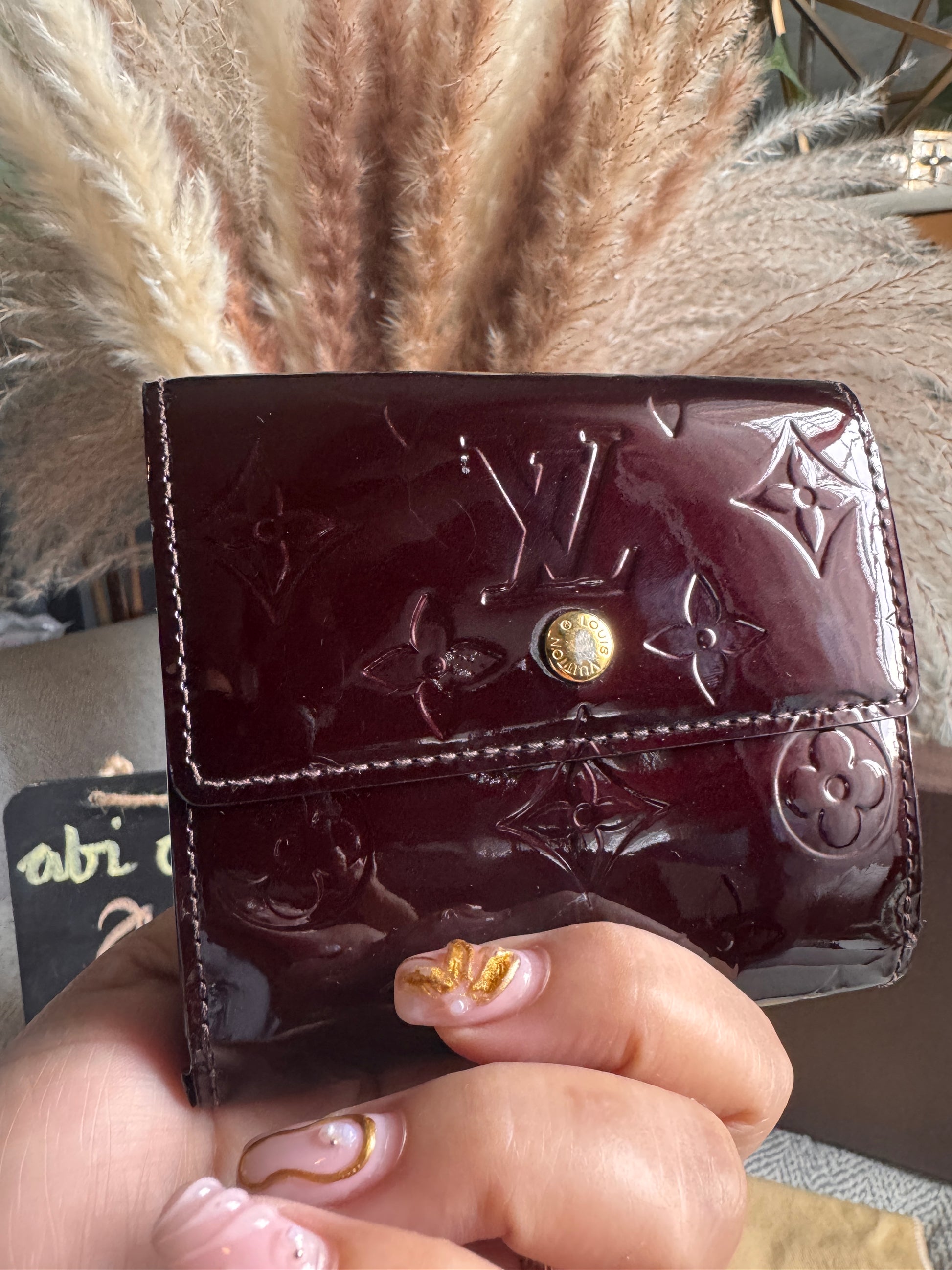 Get quirky and compact with the Louis Vuitton Compact wallet in Amarante. Made of Vernis material, it features a playful exterior with light markings and someglazing cracks on edges. The interior has light scuffs and indentations, snap button has silvering as shown in photos. Measuring at 4" x 3" x 0.75", it comes with a dustbag, carecard and box. Embrace the imperfections of this previously owned authentic item with style.