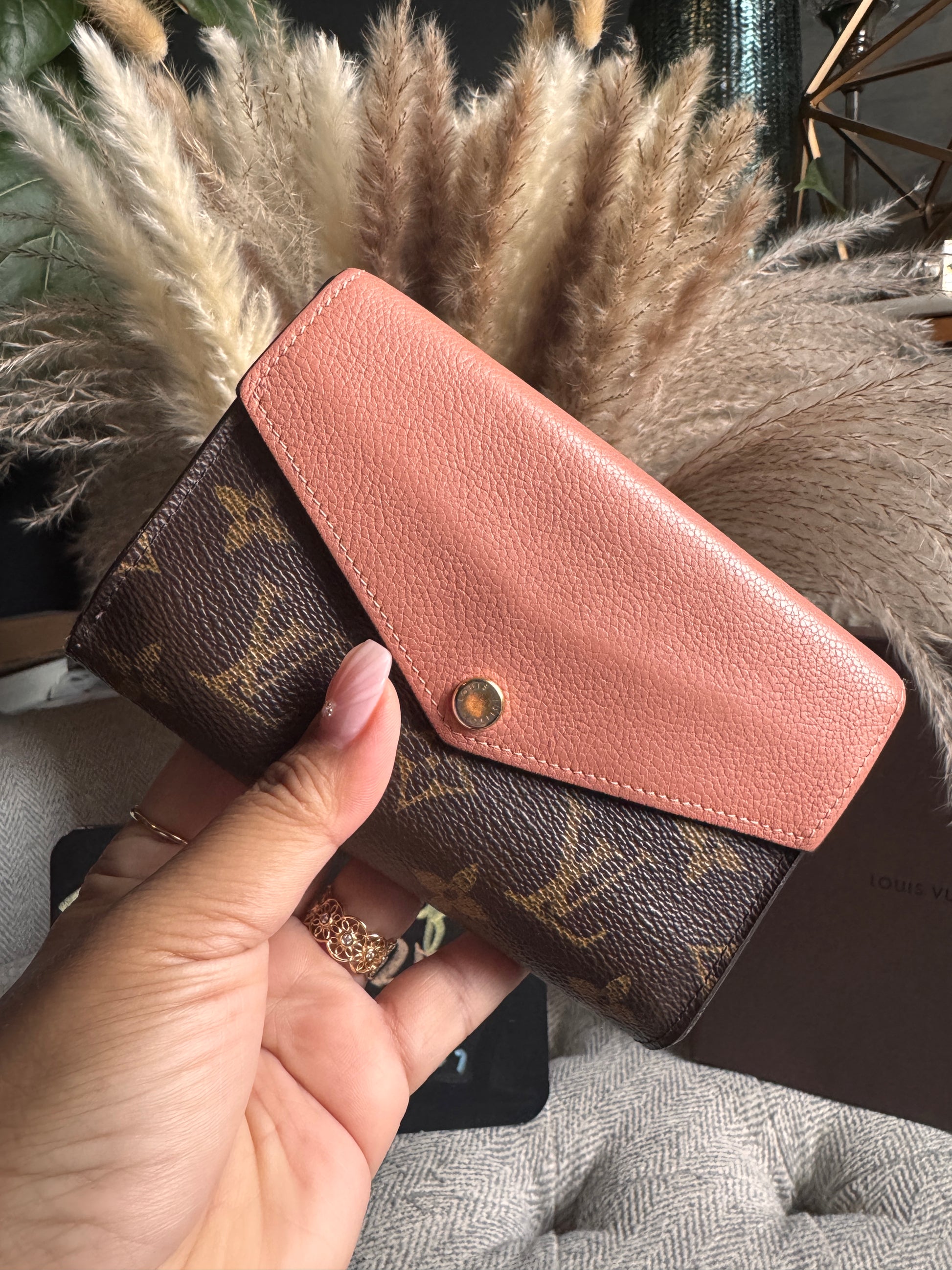 Introducing the LOUIS VUITTON Monogram Pallas Compact Wallet, perfect for everyday use! Crafted from their classic monogram on toile canvas, this stylish clutch wallet features a peach pink calfskin leather flap with multiple card slots and patch pockets. Its compact and sleek design is complemented by a brass clasp and matching leather interior. Treat yourself to this luxurious accessory today!
