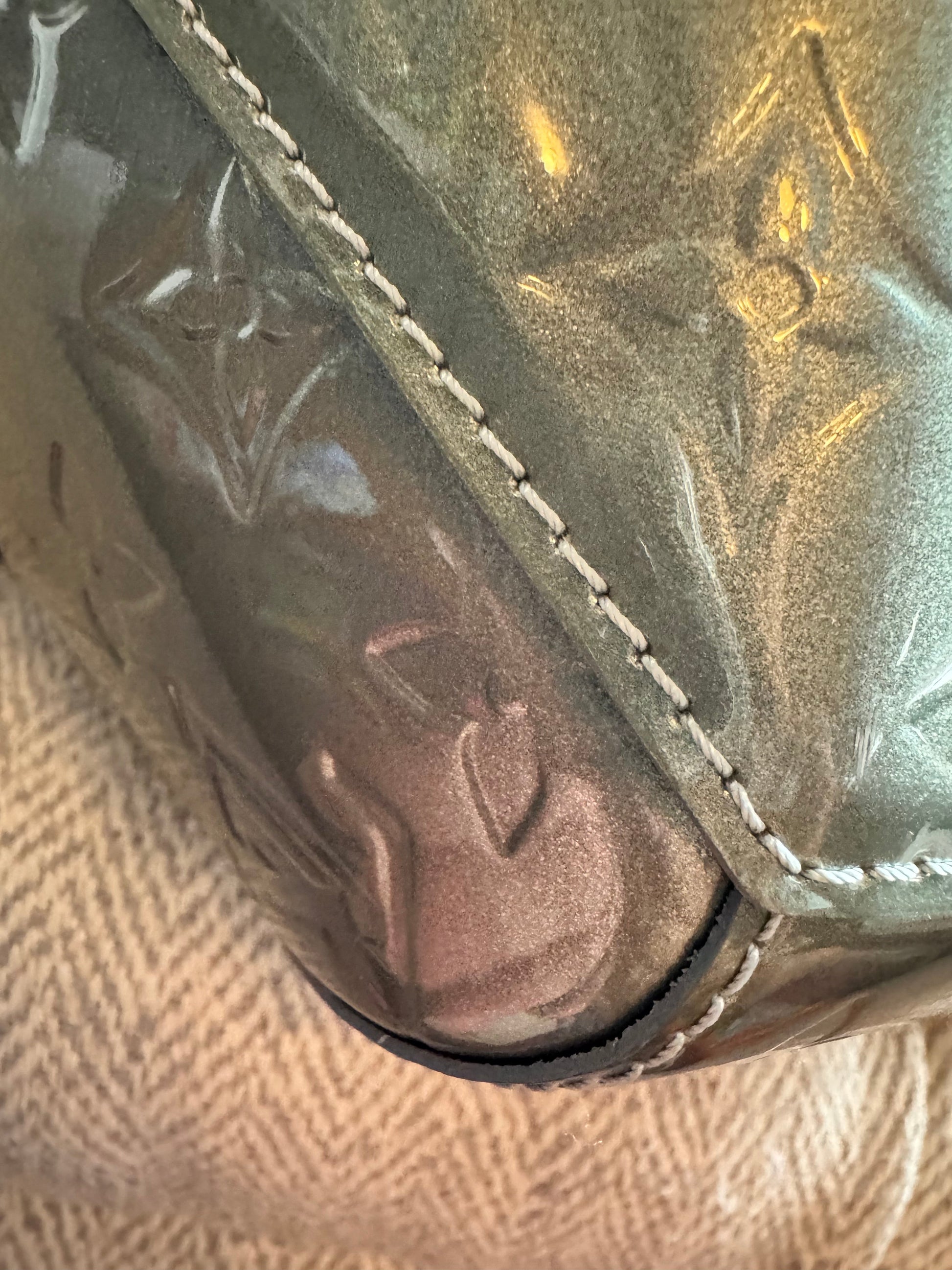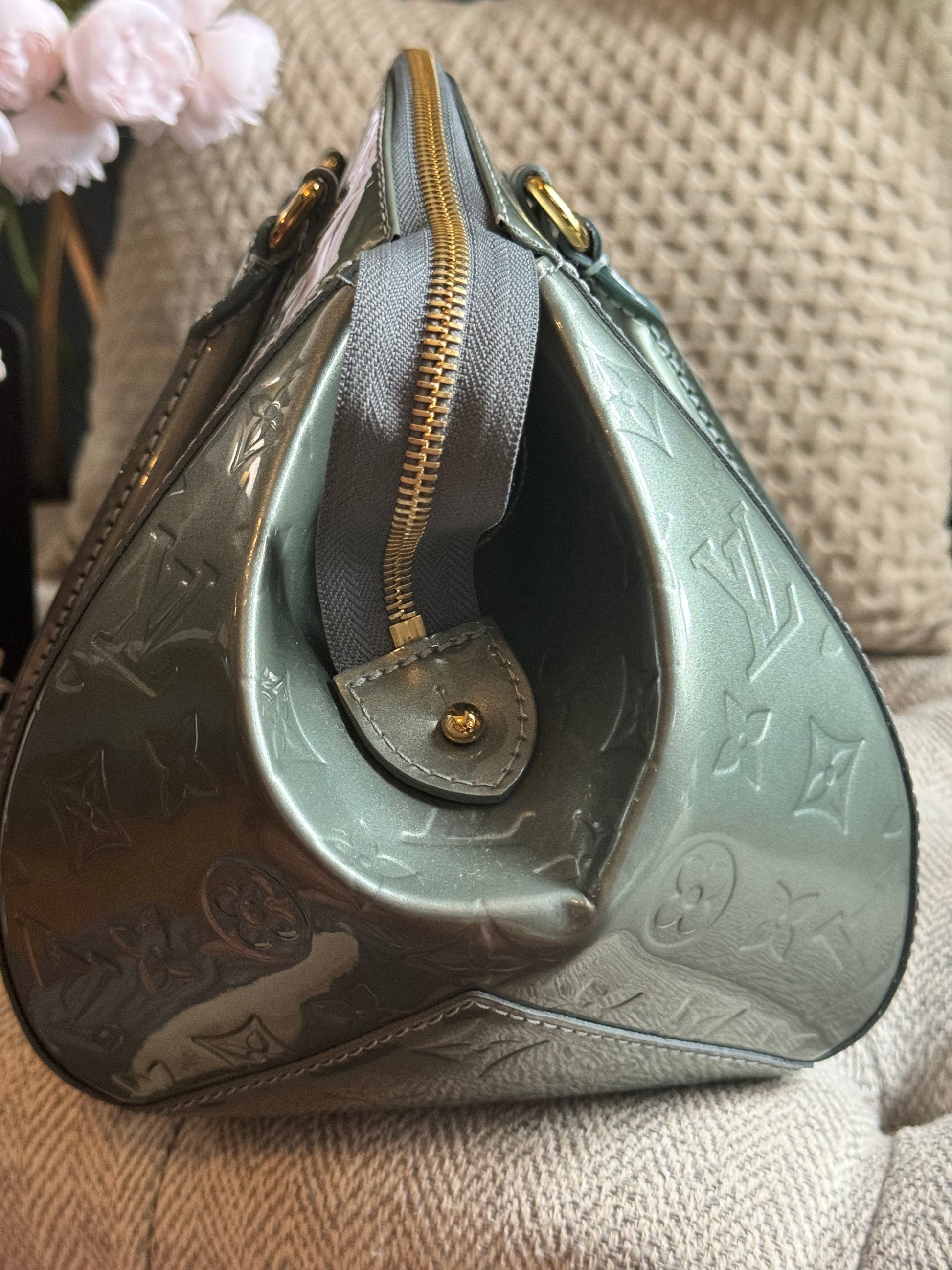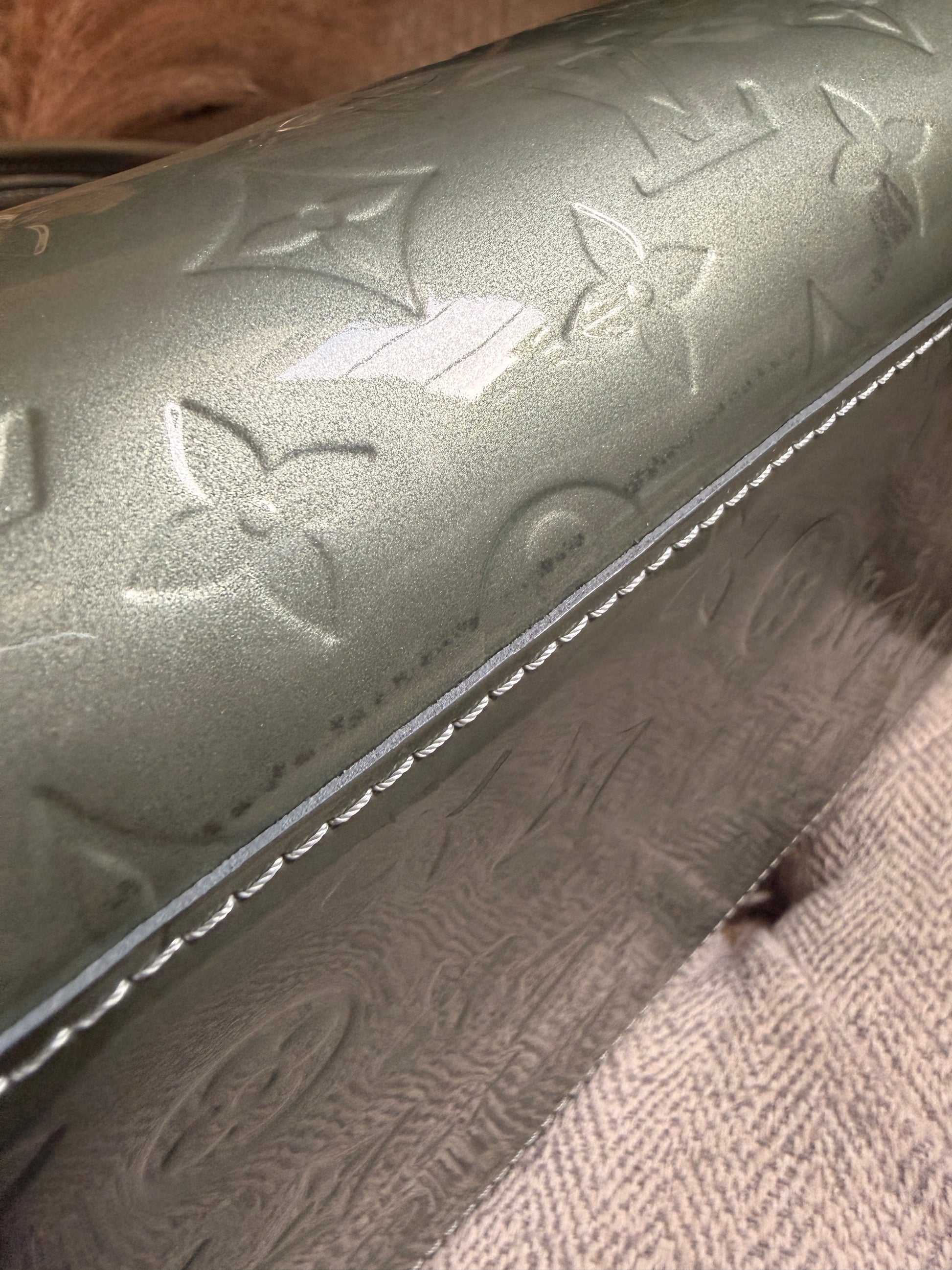 Experience the beauty of Vernis with this Sherwood GM in the super cool colour Givre. The polished gray monogram embossed vernis patent leather exudes confidence and sophistication. With tall and sturdy rolled leather handles, polished brass hardware, and a matching fabric interior, this satchel is perfect for those who love to take risks and make a statement. Add a touch of daring to your wardrobe with this retired vintage piece.
