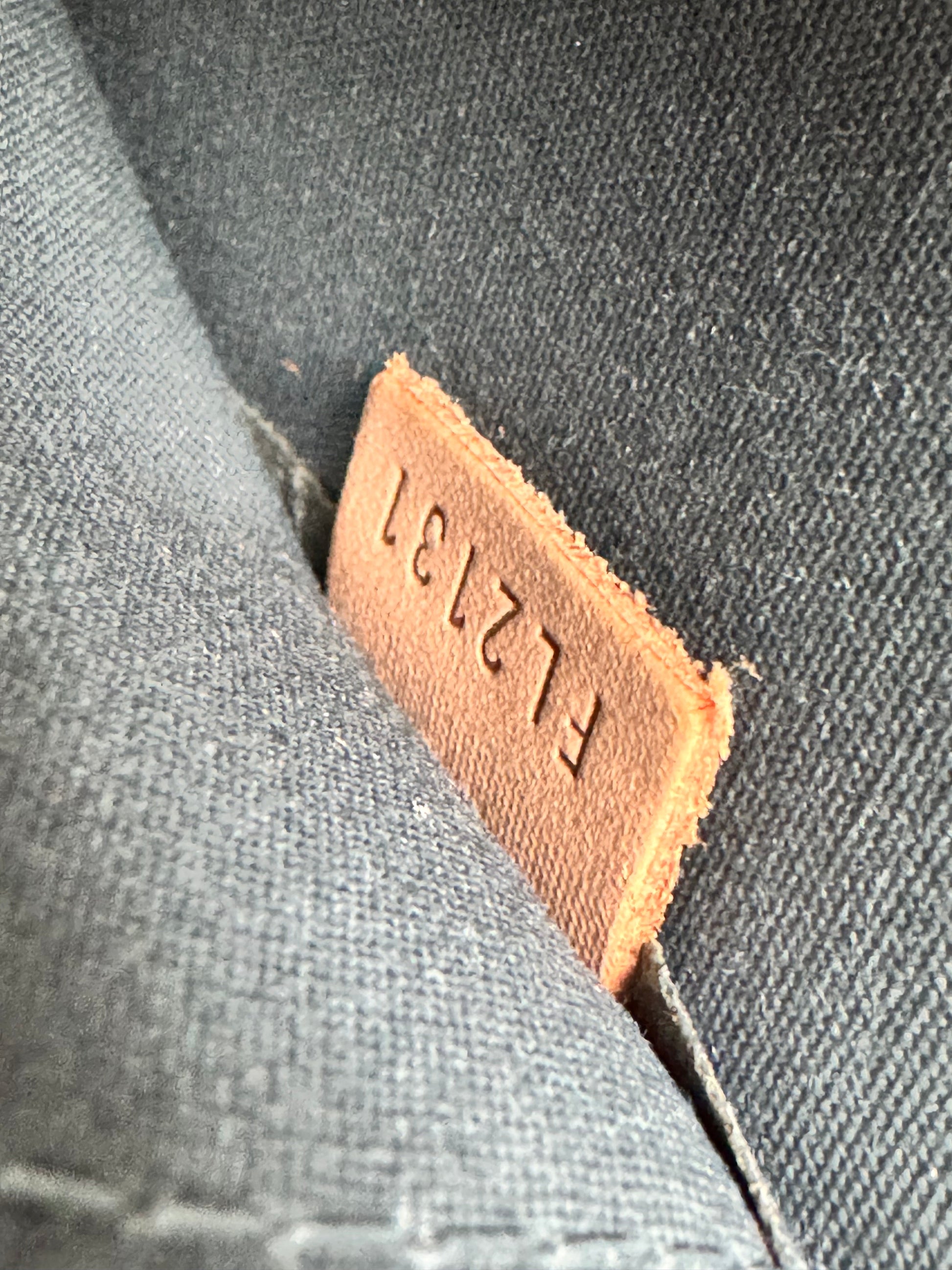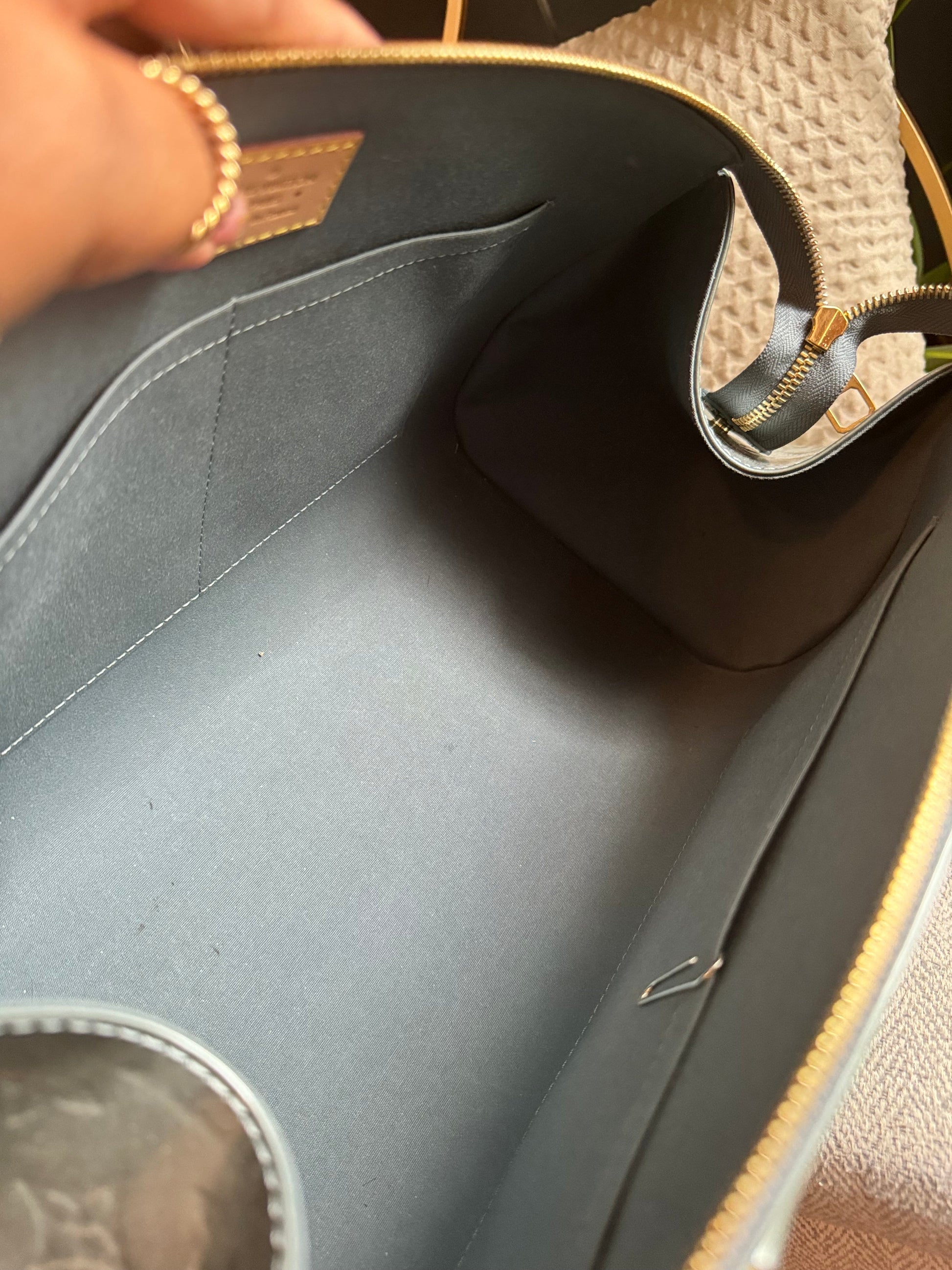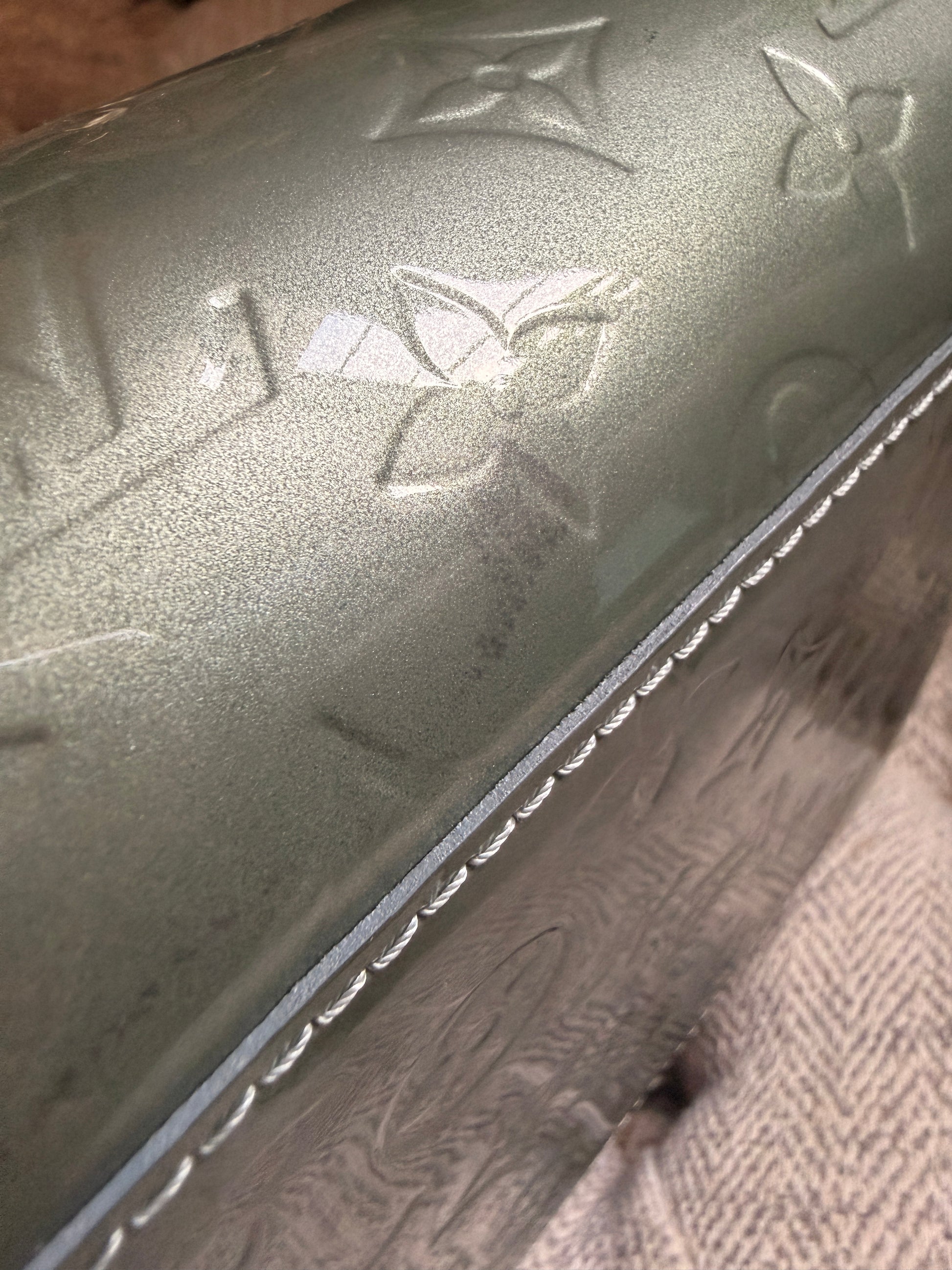 Experience the beauty of Vernis with this Sherwood GM in the super cool colour Givre. The polished gray monogram embossed vernis patent leather exudes confidence and sophistication. With tall and sturdy rolled leather handles, polished brass hardware, and a matching fabric interior, this satchel is perfect for those who love to take risks and make a statement. Add a touch of daring to your wardrobe with this retired vintage piece.