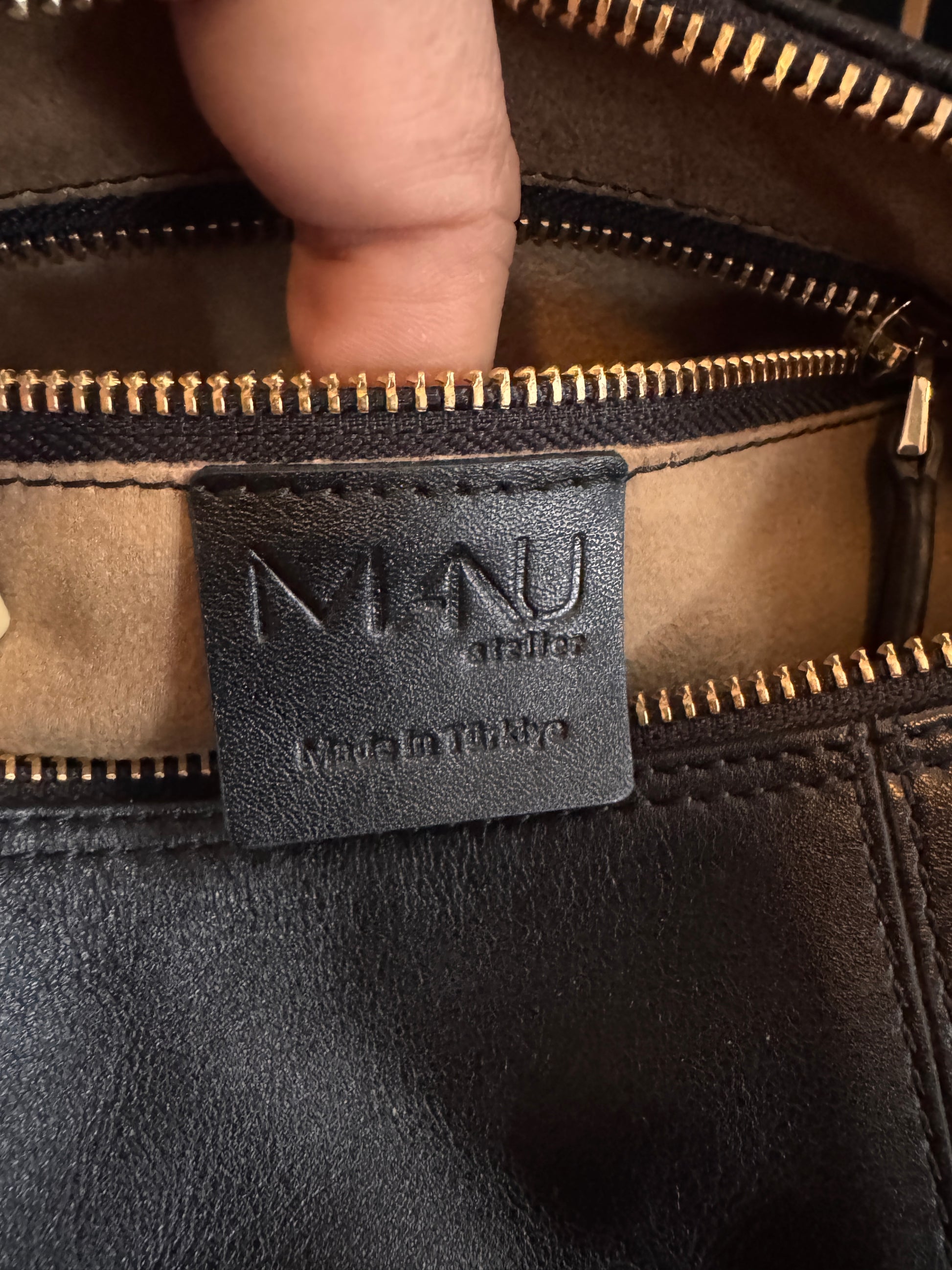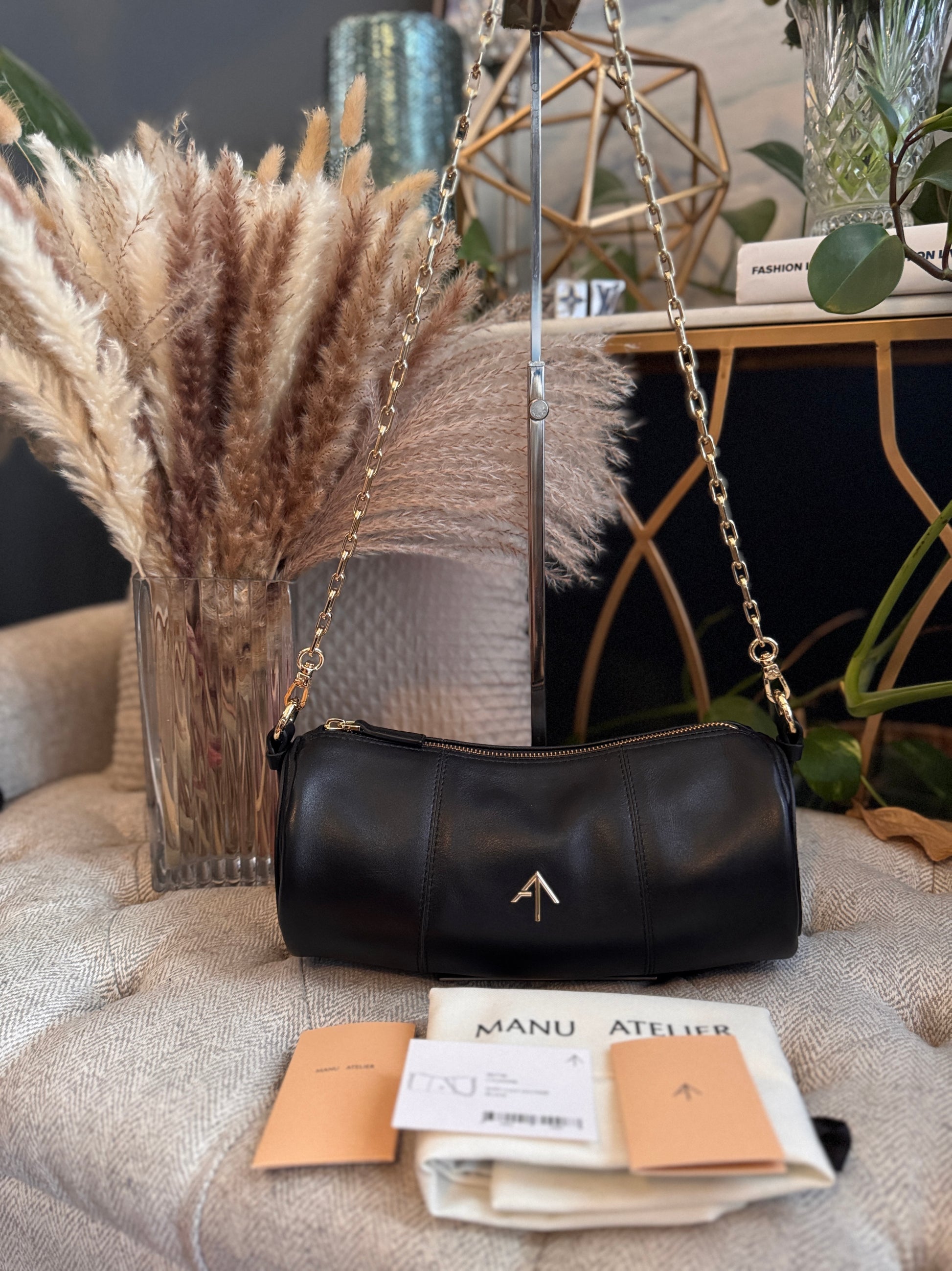 Introducing the Manu Atelier Cylinder Shoulder Bag. Made from luxurious leather, this bag boasts a chic cylinder shape and a sophisticated black calfskin exterior. Perfect for any occasion, it's the ideal accessory to elevate any outfit. Includes dustbag and cards. (Excellent condition, like new.)