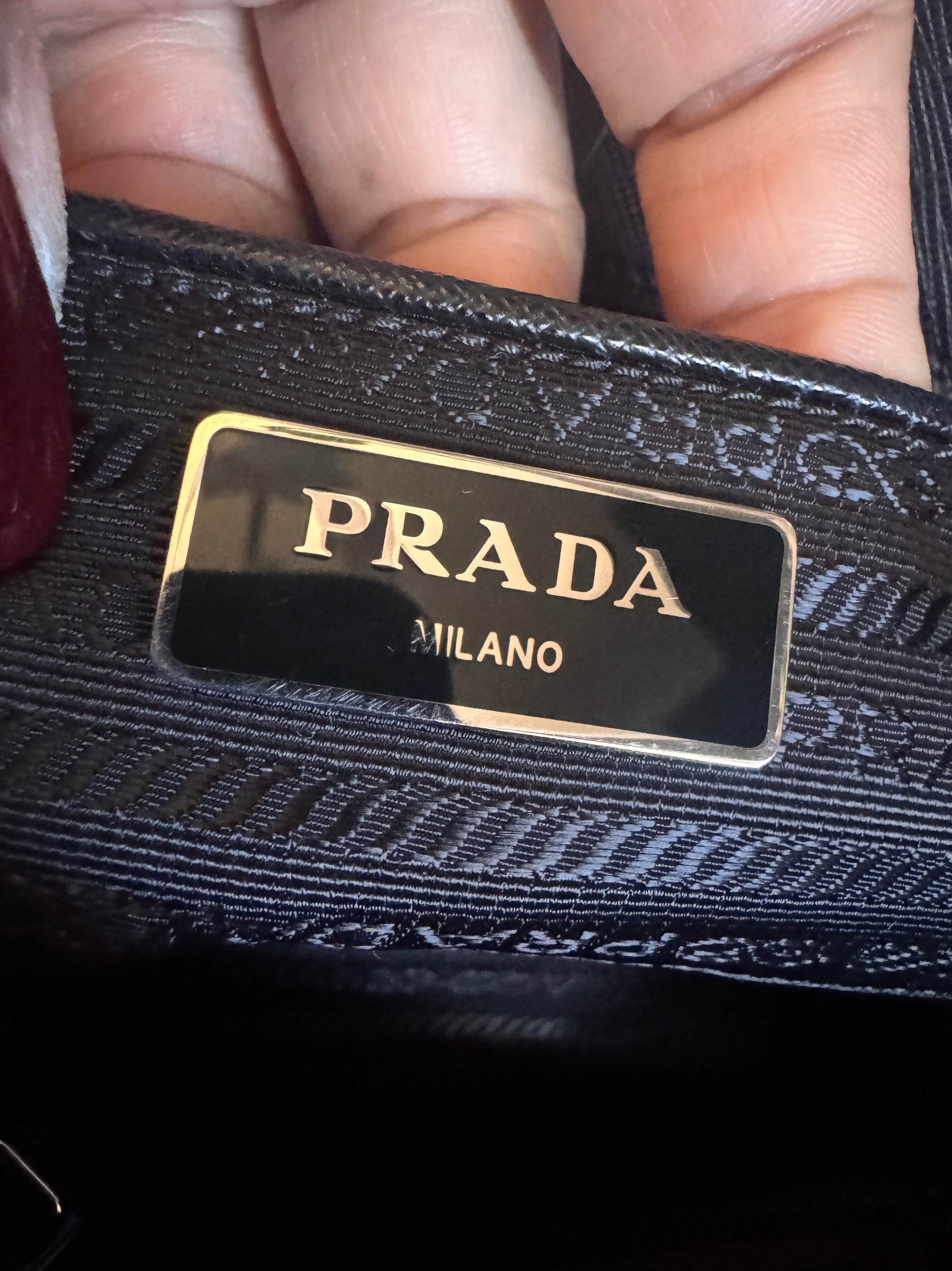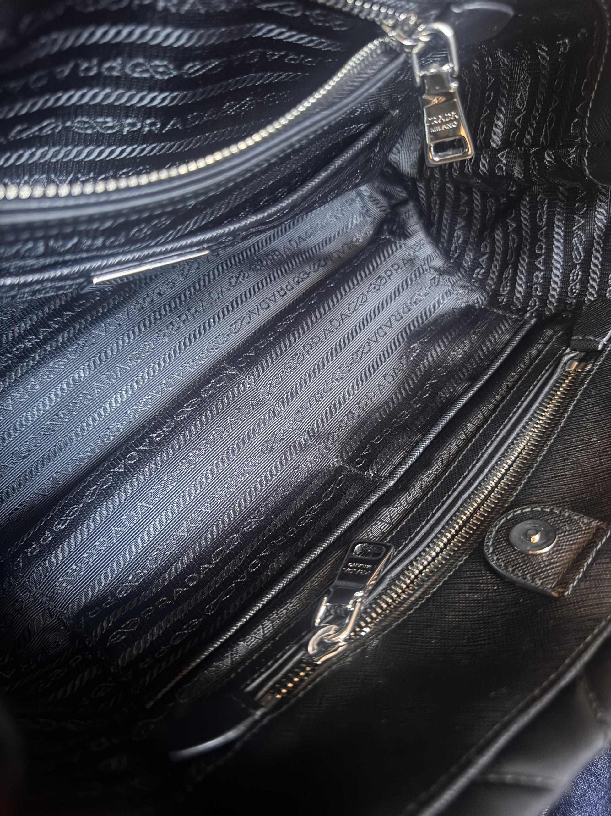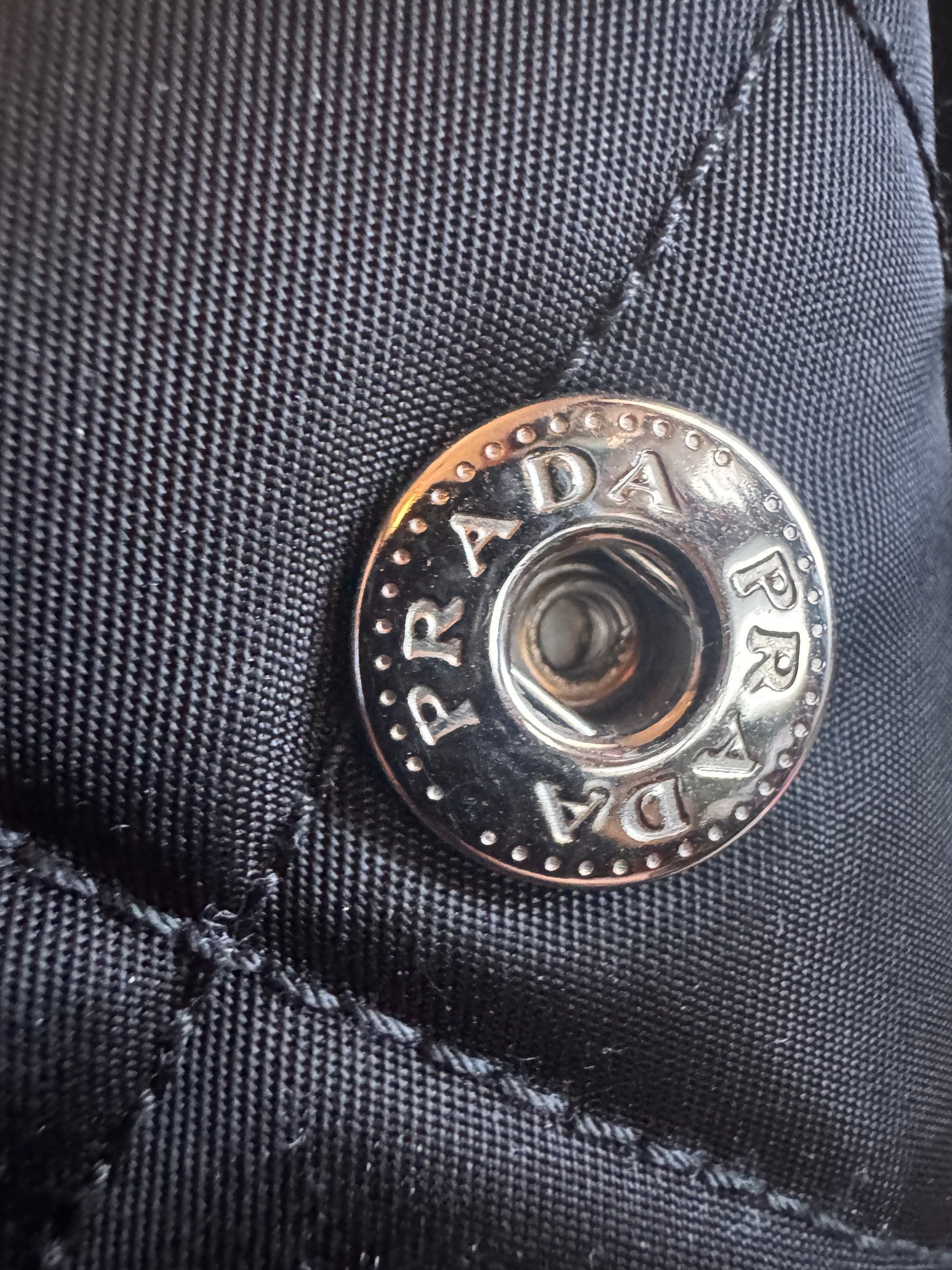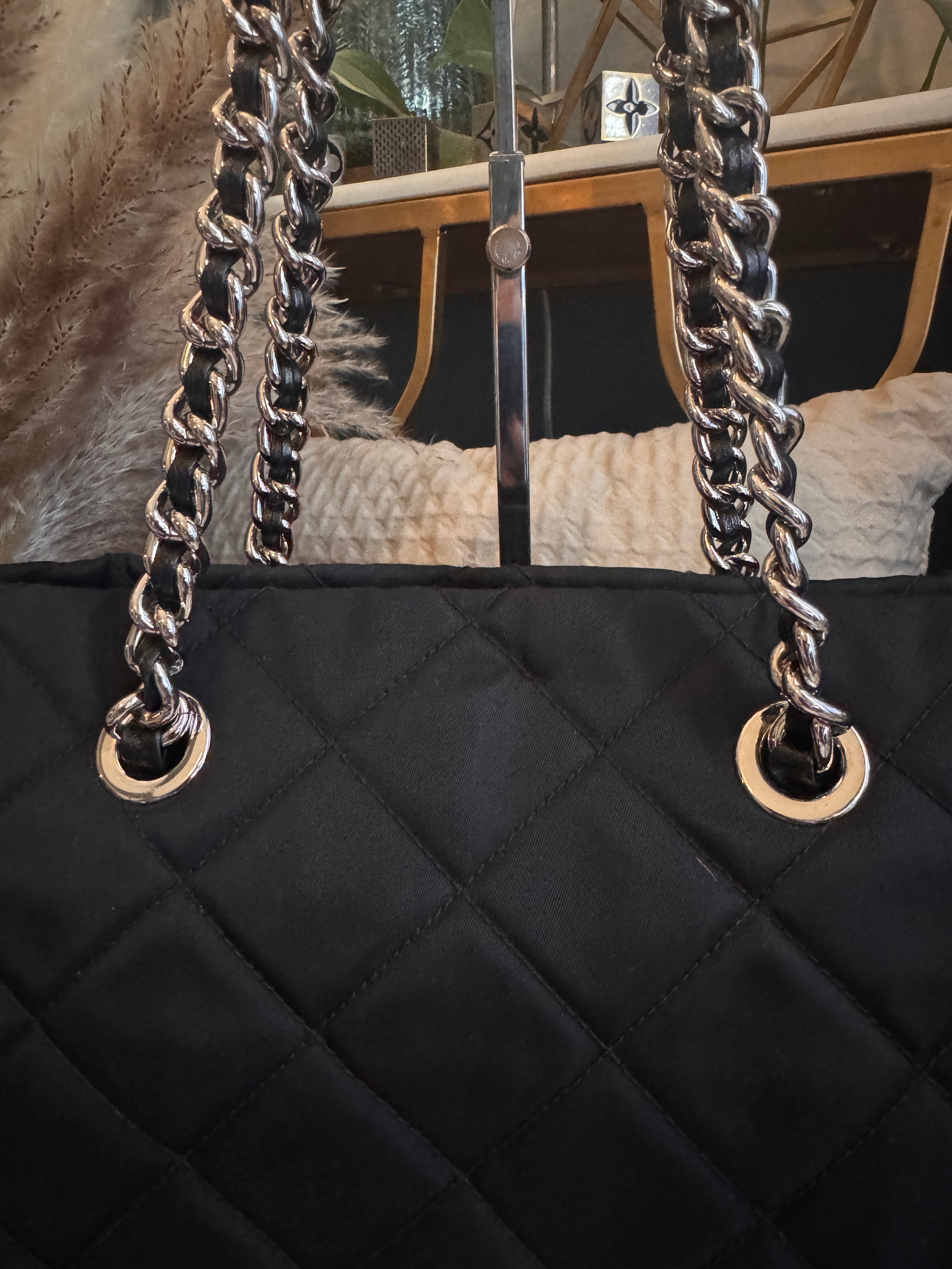 Get ready to elevate your style with the Prada Tessuto Nero Tote! This open convertible tote satchel is made in Italy and features a quilted nylon body with side snap closures, leather woven chain straps with leather guards, and D rings for a long strap attachment. The open top with magnetic snap closure makes it easy to access your items, while the interior zip and slip pockets keep you organized. In excellent condition, this tote also comes with a dustbag and cards. Time to add a touch of Italian luxury to your life!