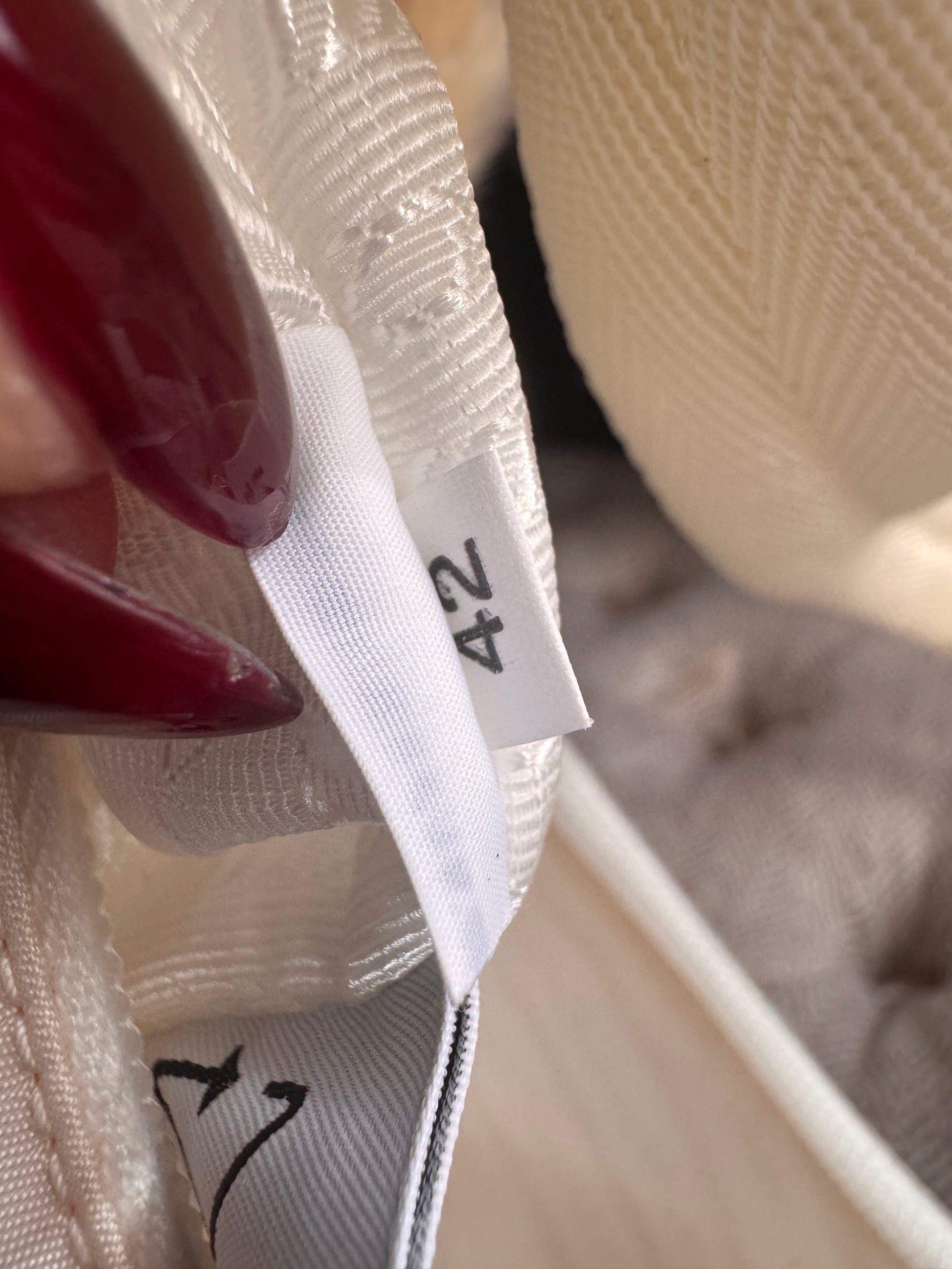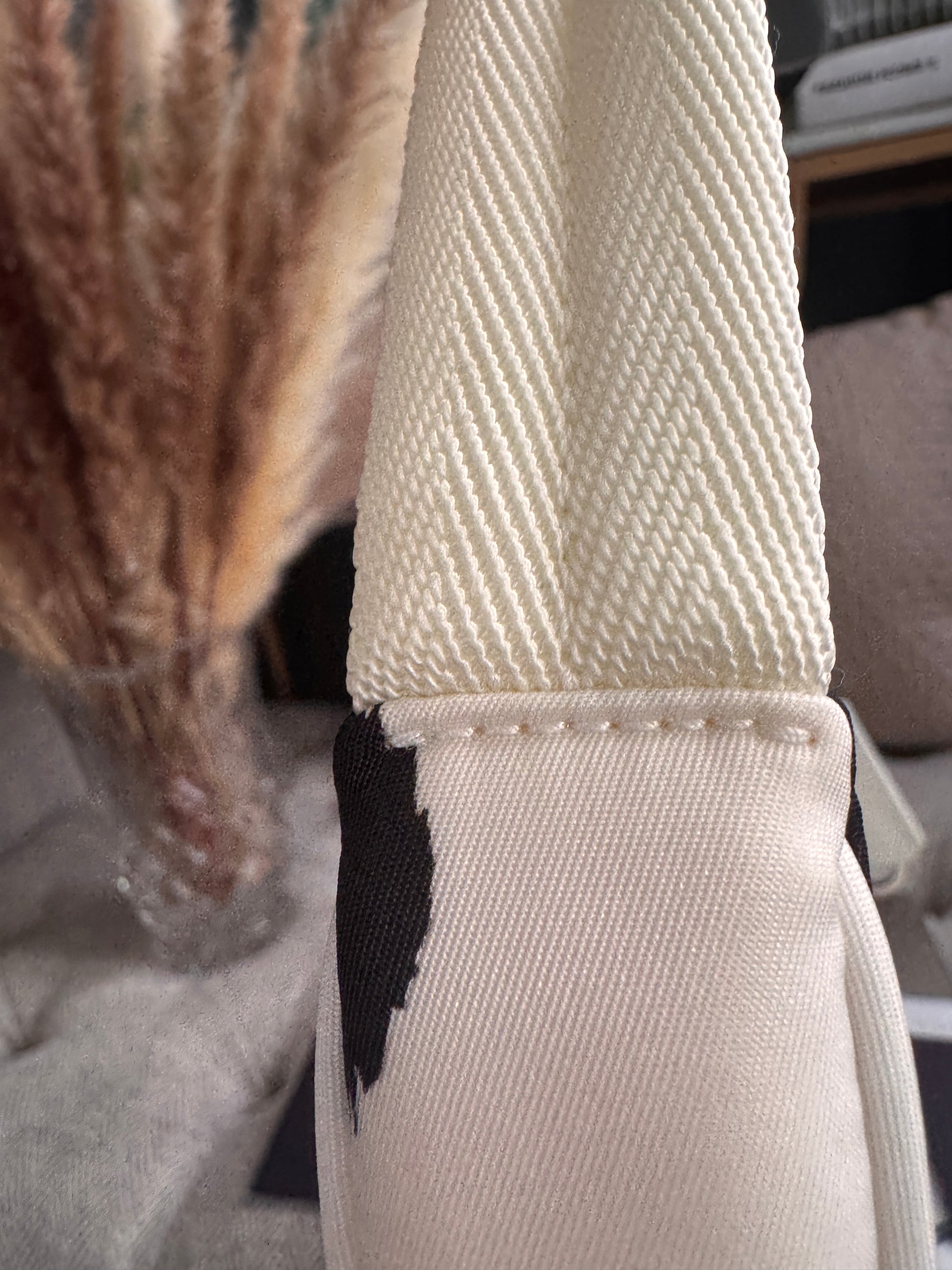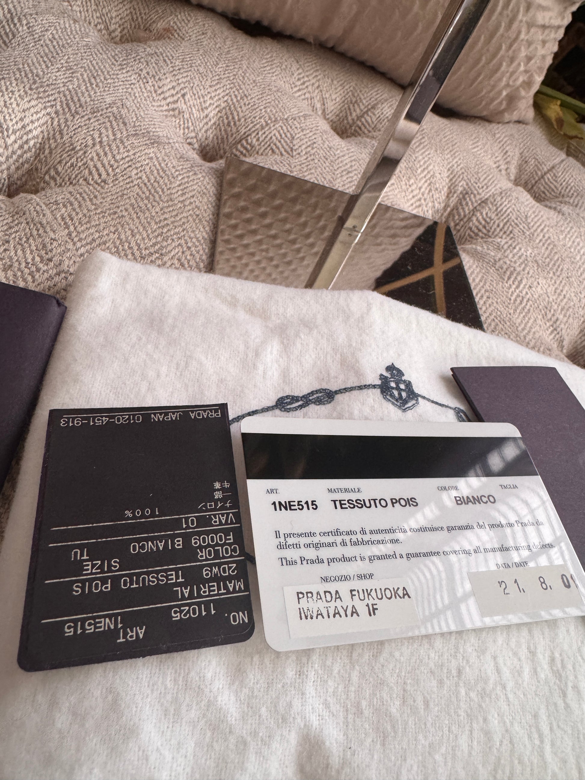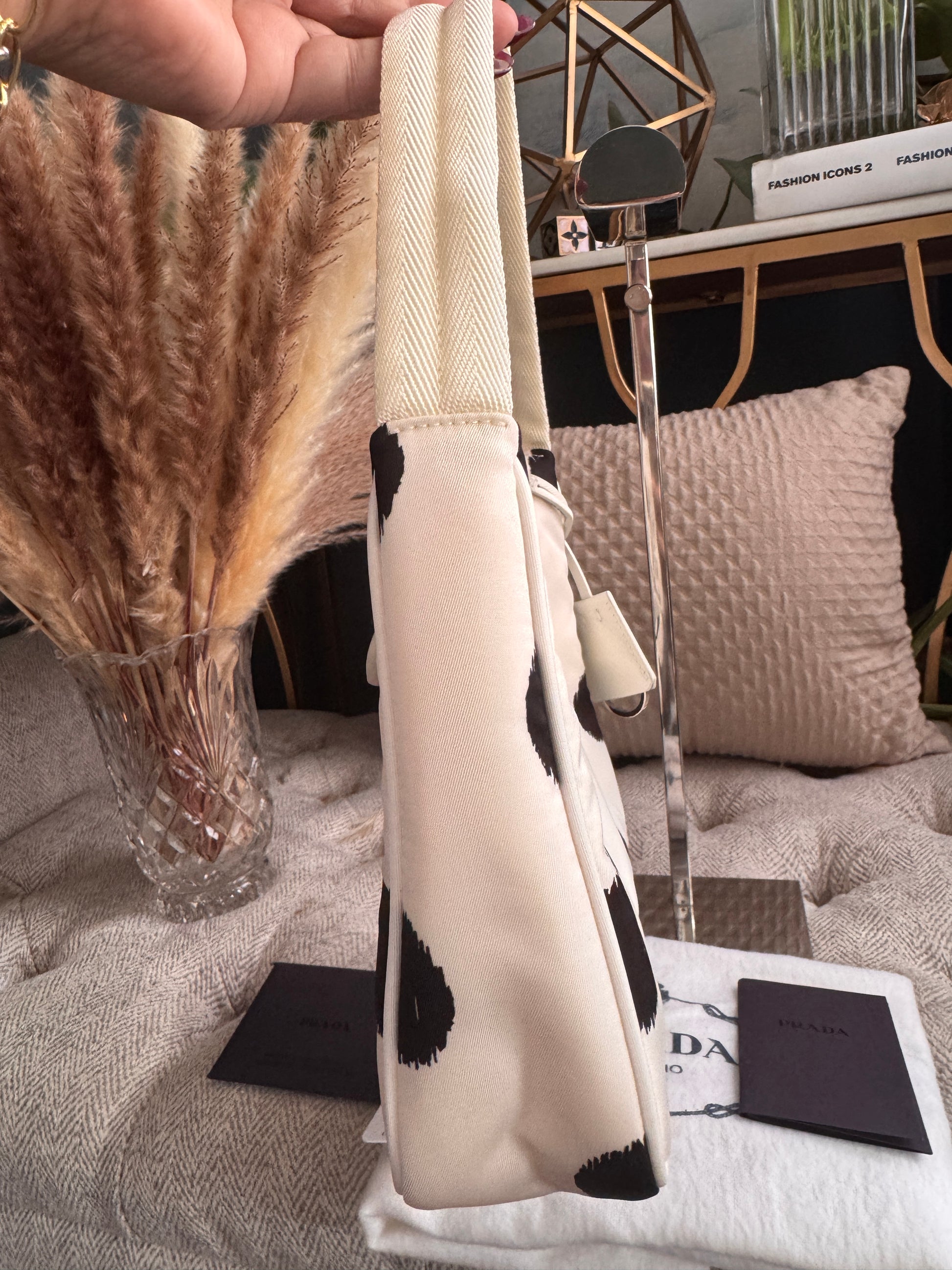 This Prada shoulder bag is a must-have for fashion lovers. The compact design measures 22.5 cm in width, 12.5 cm in height, and 6 cm in depth, making it both stylish and functional. The stunning white cloth with black polka dots adds a touch of playfulness to any outfit. Crafted of sturdy white tessuto nylon with black polka dots and silver hardware. The bag features a shoulder strap and the top zipper opens to a white jacquard fabric interior.Despite some yellowing, the bag is in beautiful condition. Expertly crafted by Prada, this shoulder bag is a fashion statement that will turn heads.
