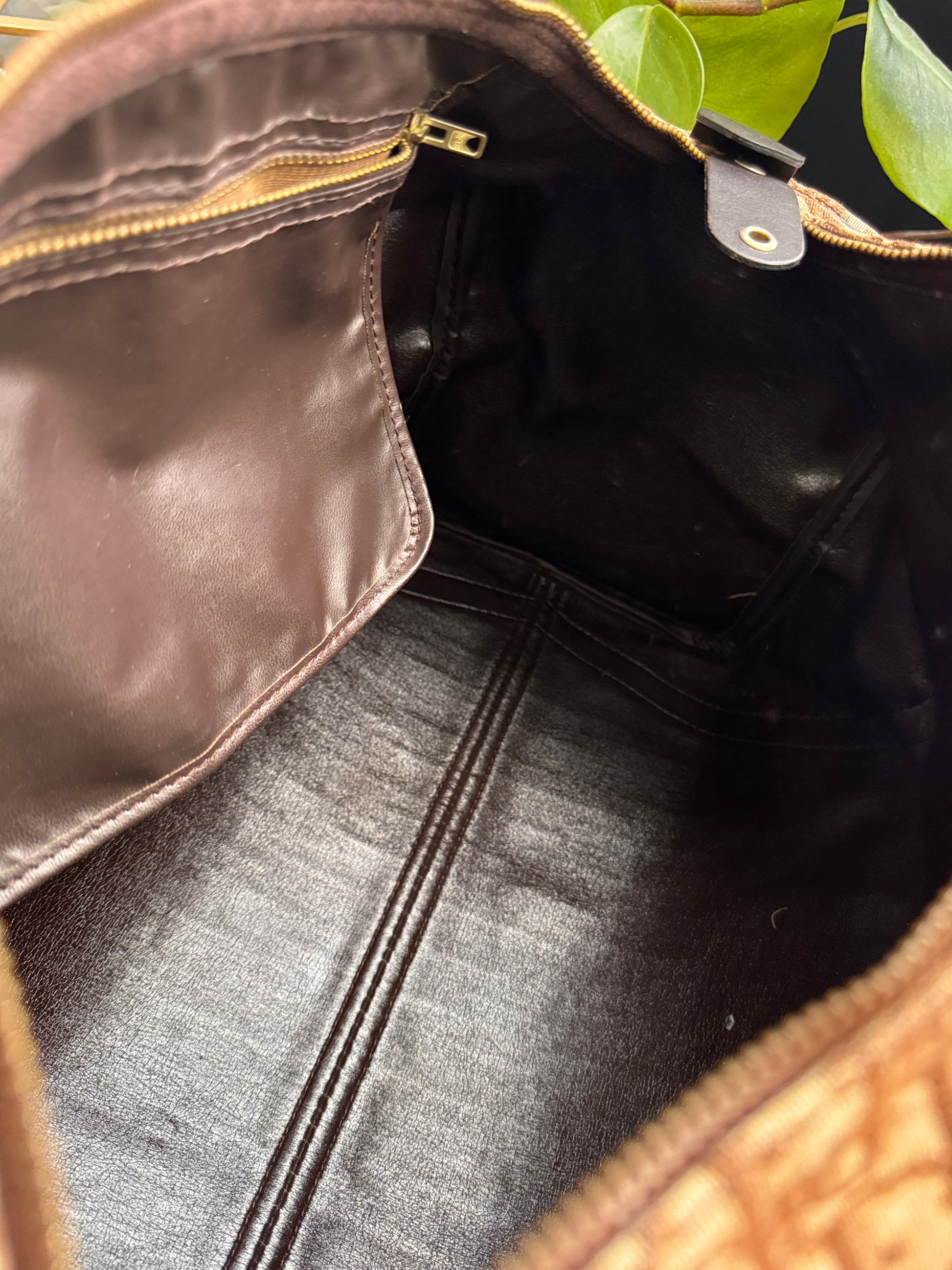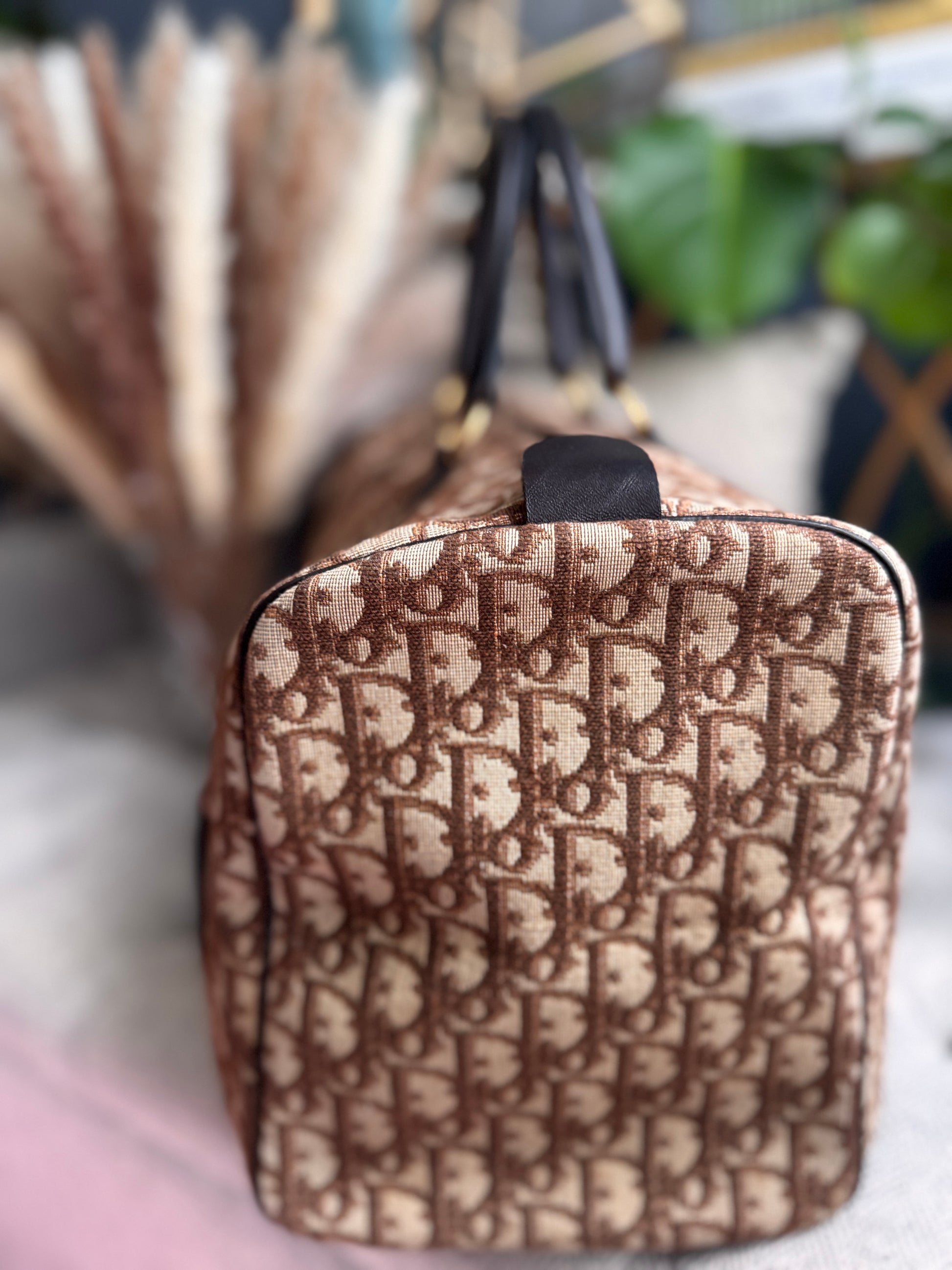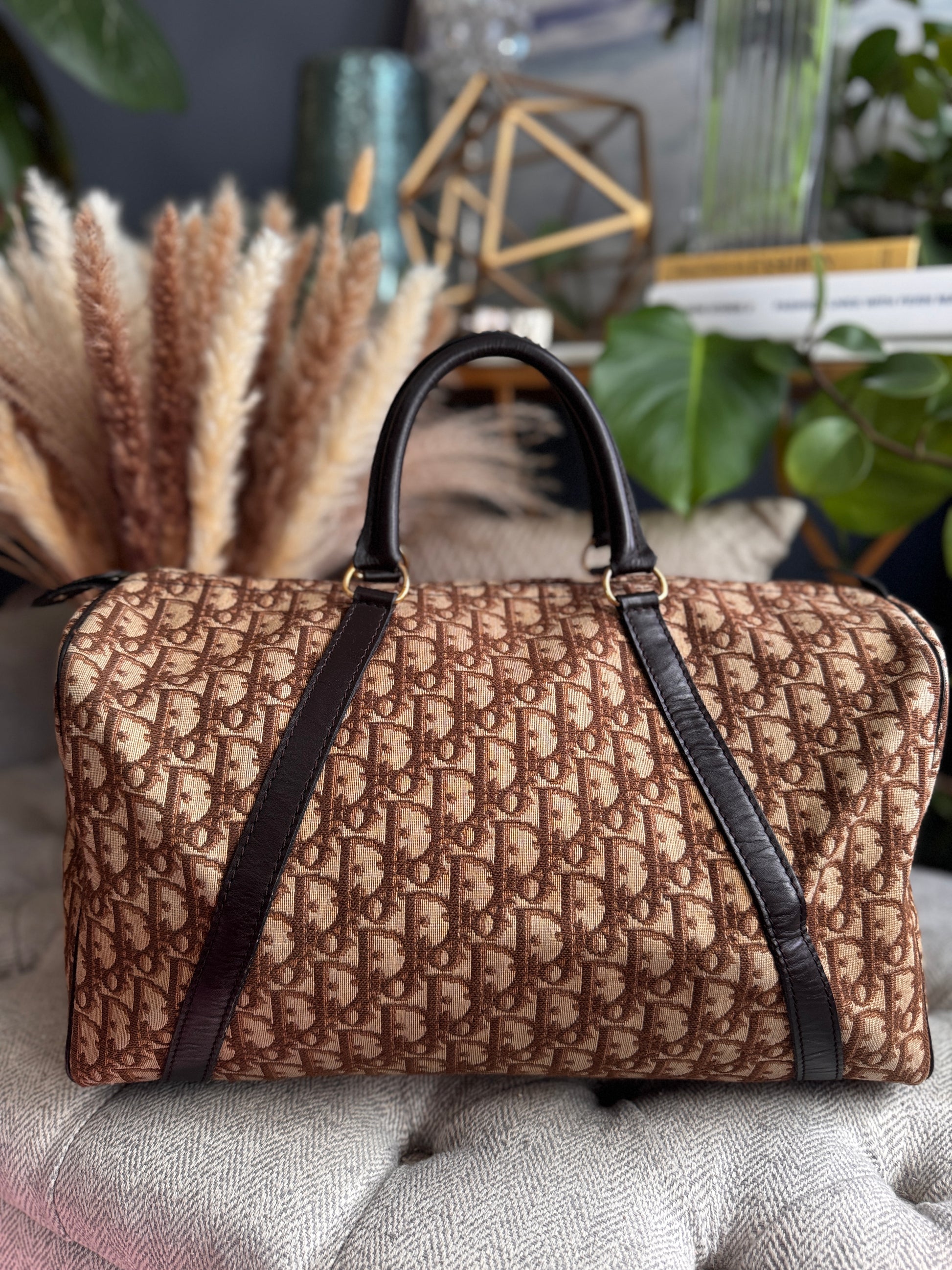 Carry your essentials in style with the Dior Vintage Trotter Boston Bag. This brown canvas bag features a spacious 40 x 23 cm size, perfect for daily use. With minimal exterior wear and a good condition interior, this bag is 100% authentic and guaranteed to make a statement. (No need for a time machine with this vintage find!)