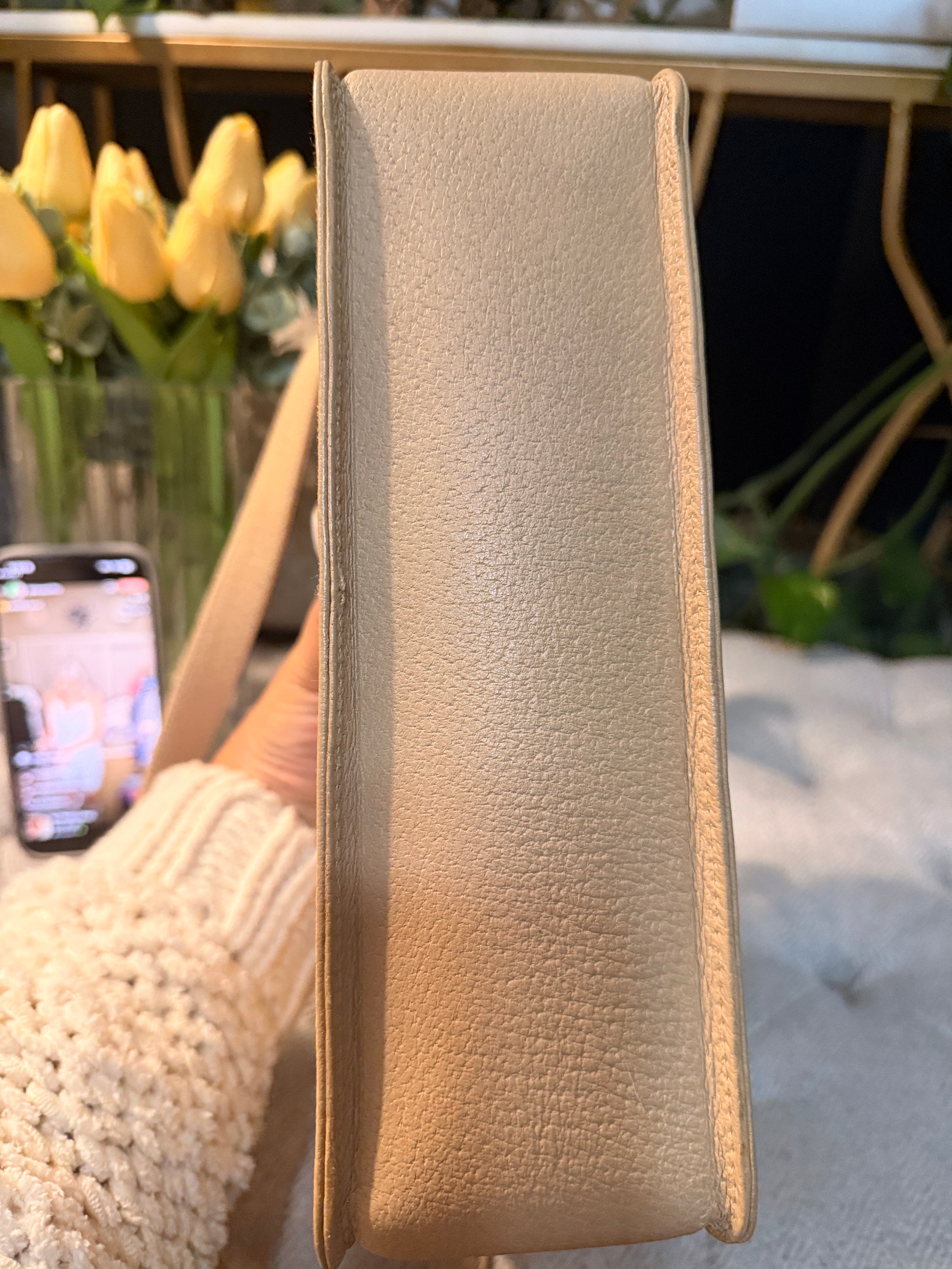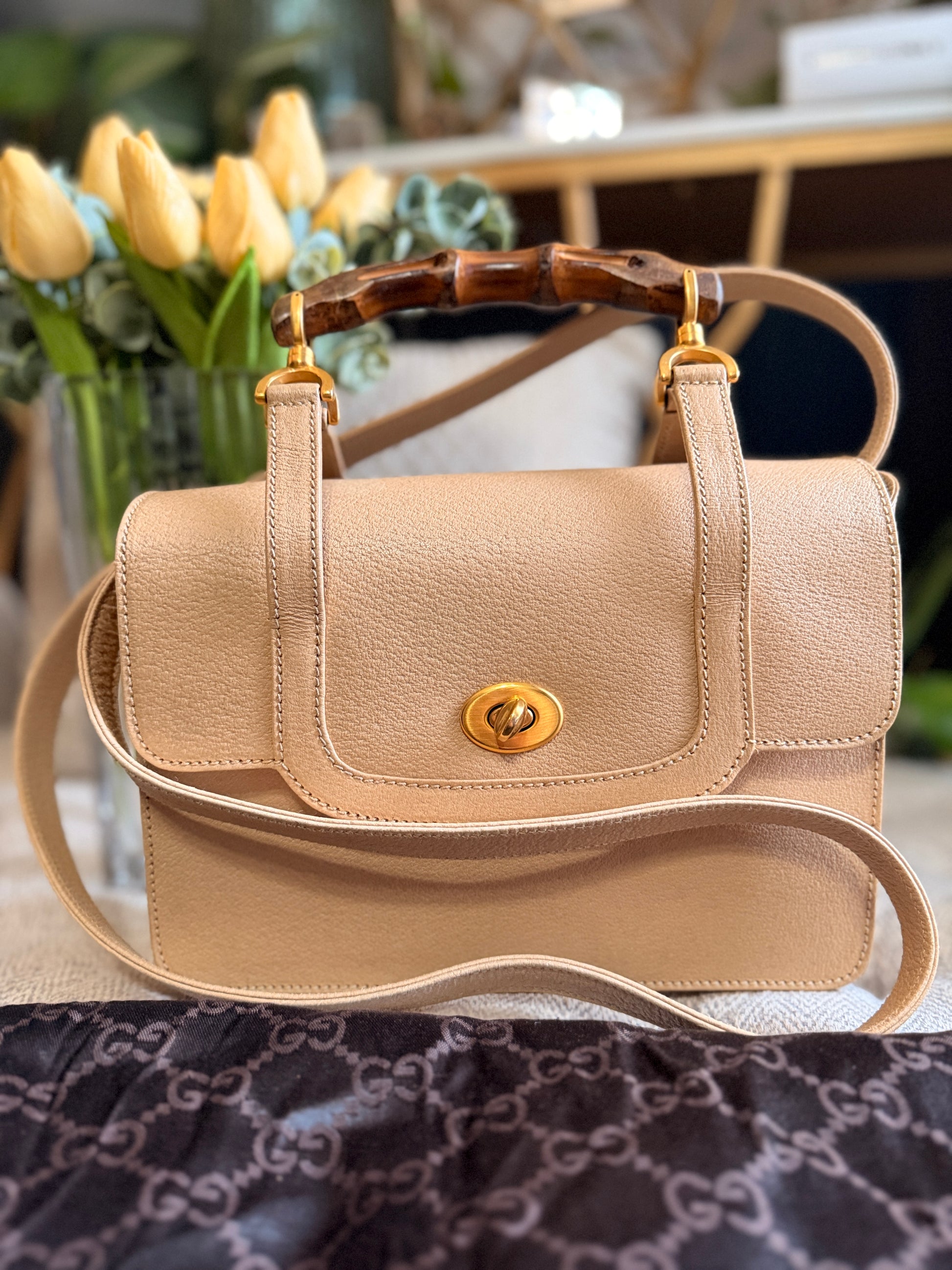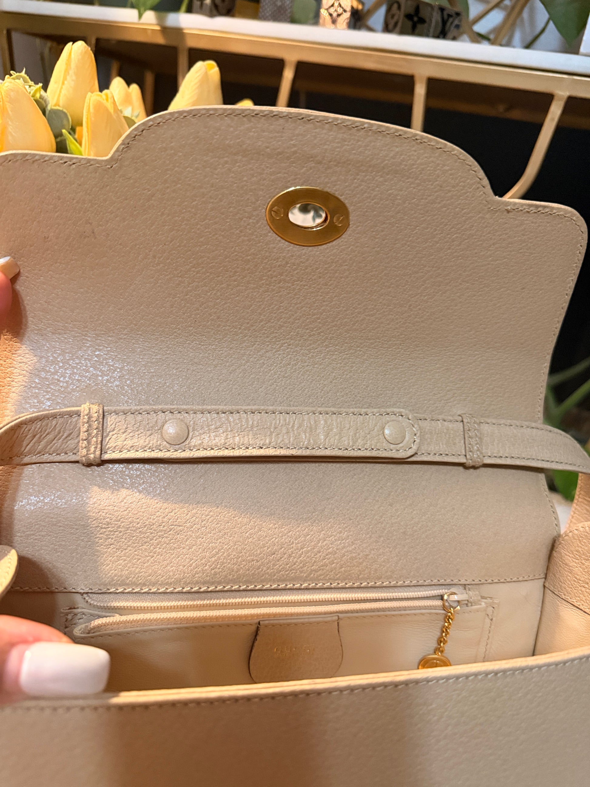 Step back in time with this Vintage Gucci bag, where creamy beige leather meets bamboo accents—talk about a stylish throwback! With a gold-tone twist-lock that’s simple yet stunning and an interior pocket for your little Knick knacks , this purse is perfect for the chic time traveler. Grab it and go, fashionista!