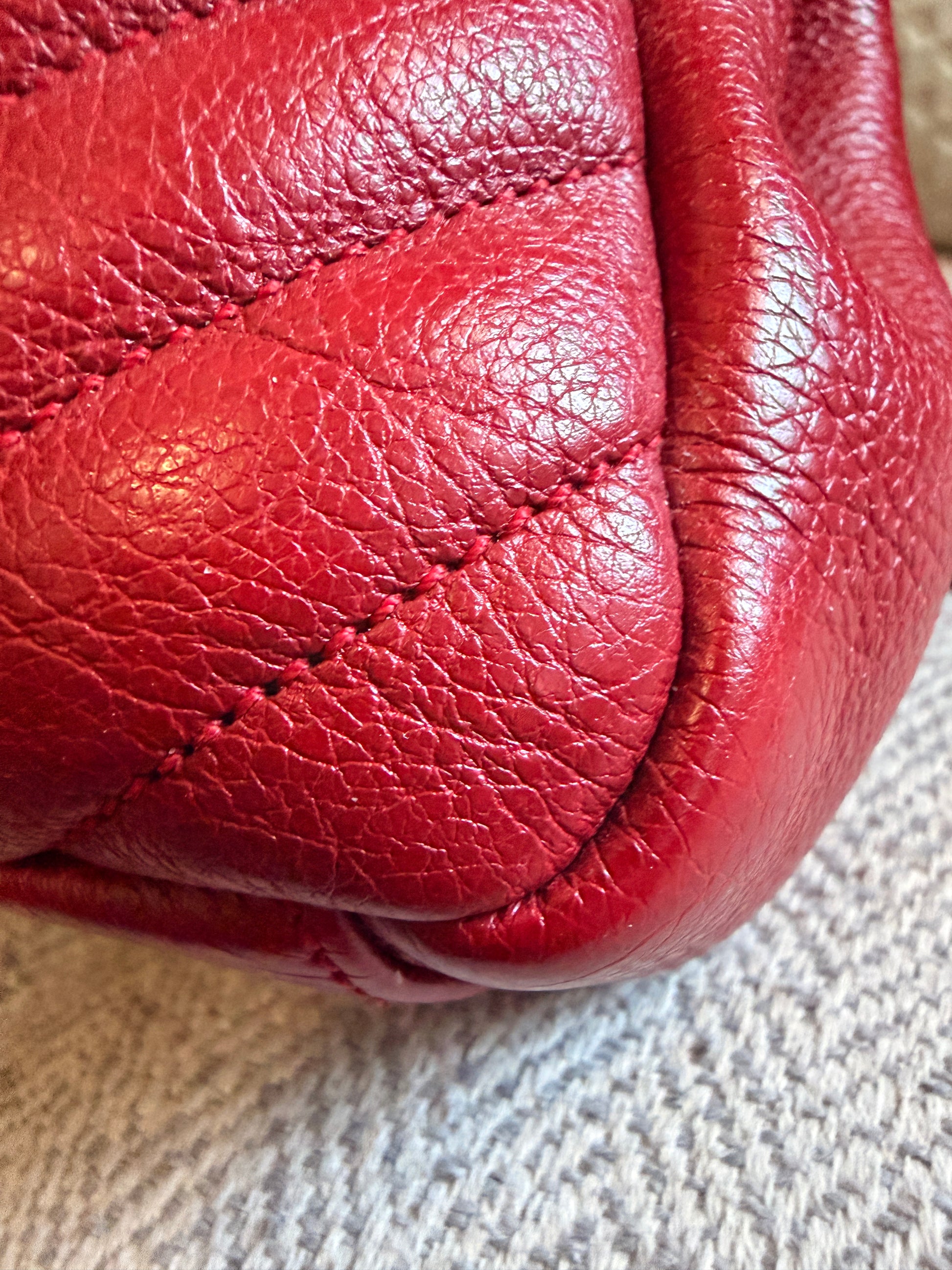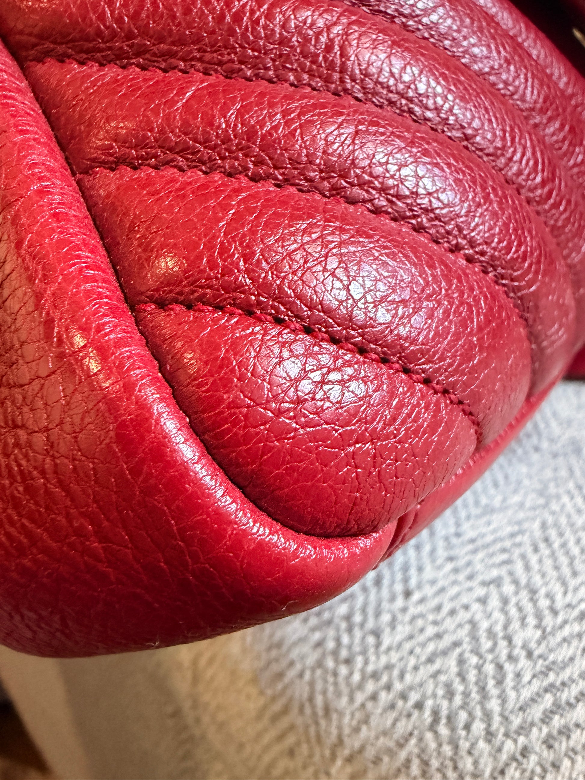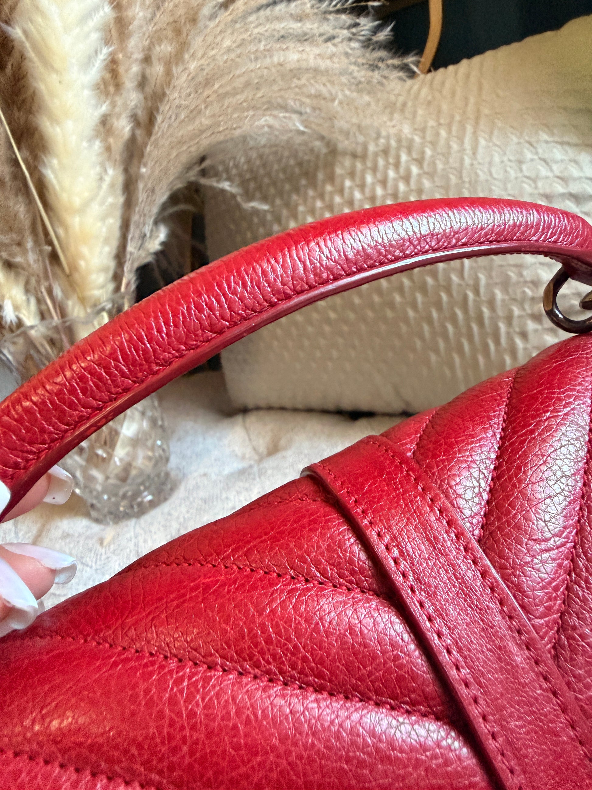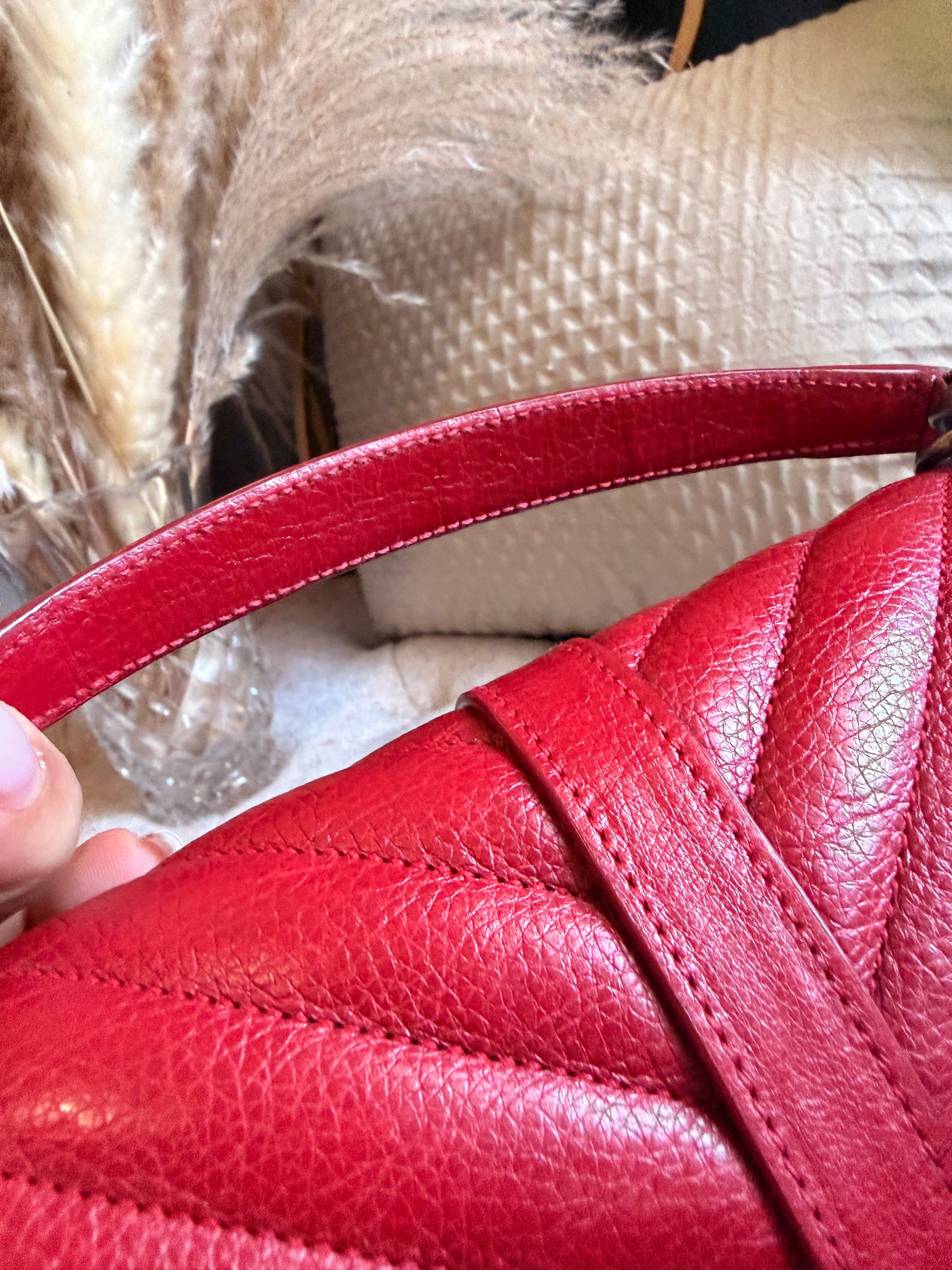 This is a satchel with the iconic chevron quilt pattern, adorned with the metal cassandre. It is such a functional piece and comes with a top handle plus a strap that you can use on your shoulder or as a crossbody strap. This bag has only minor signs of loving use, corners look great, interior is clean. Hardware has typical signs of light use. Leather has softened up beautifully but it still has beautiful structure with some signs of naturally relaxing leather. Overall beautifully preloved and ready for a new home! Will only come with a dustbag from another brand. Feel free to ask for more pics if you’d like to see more.