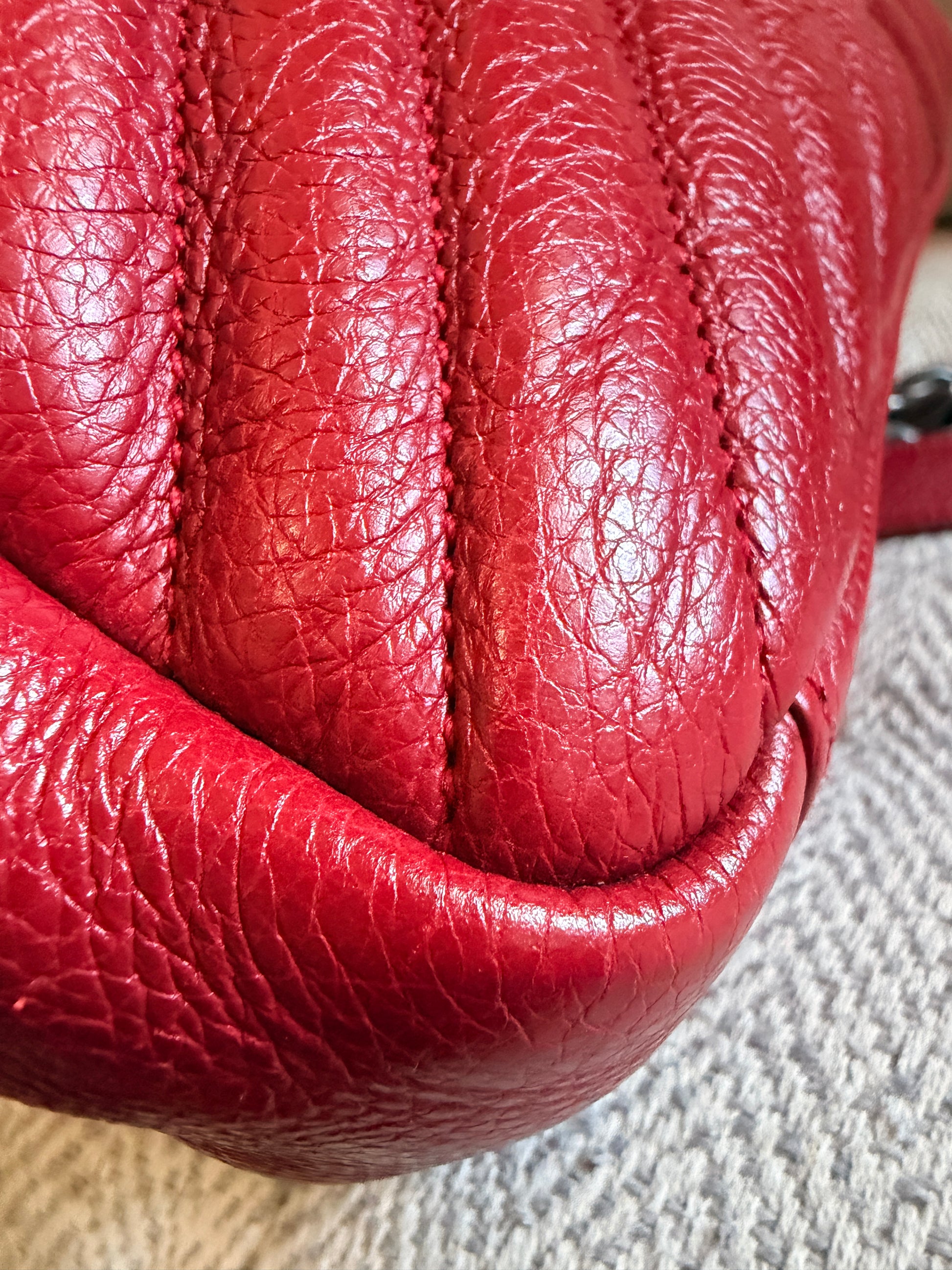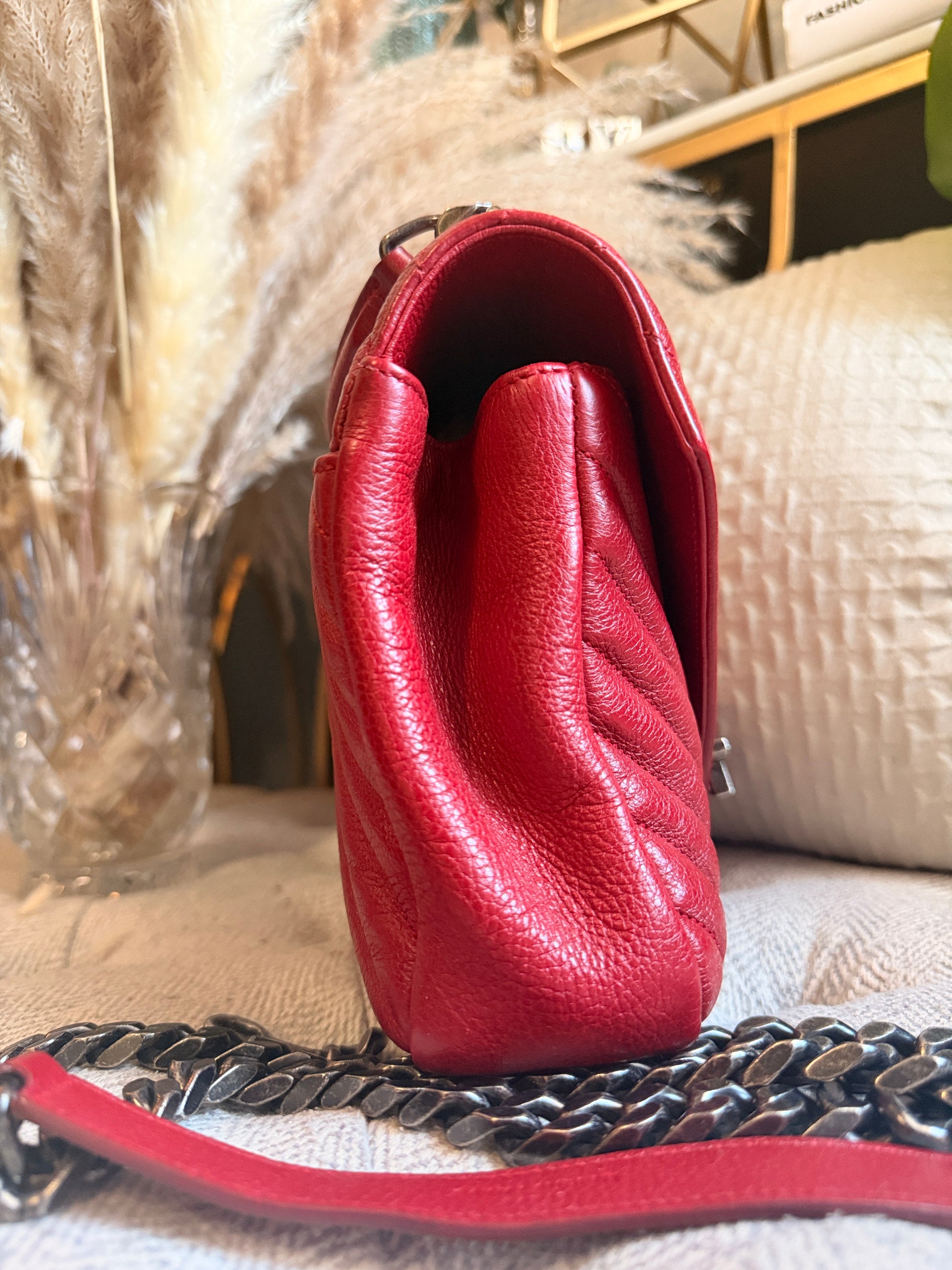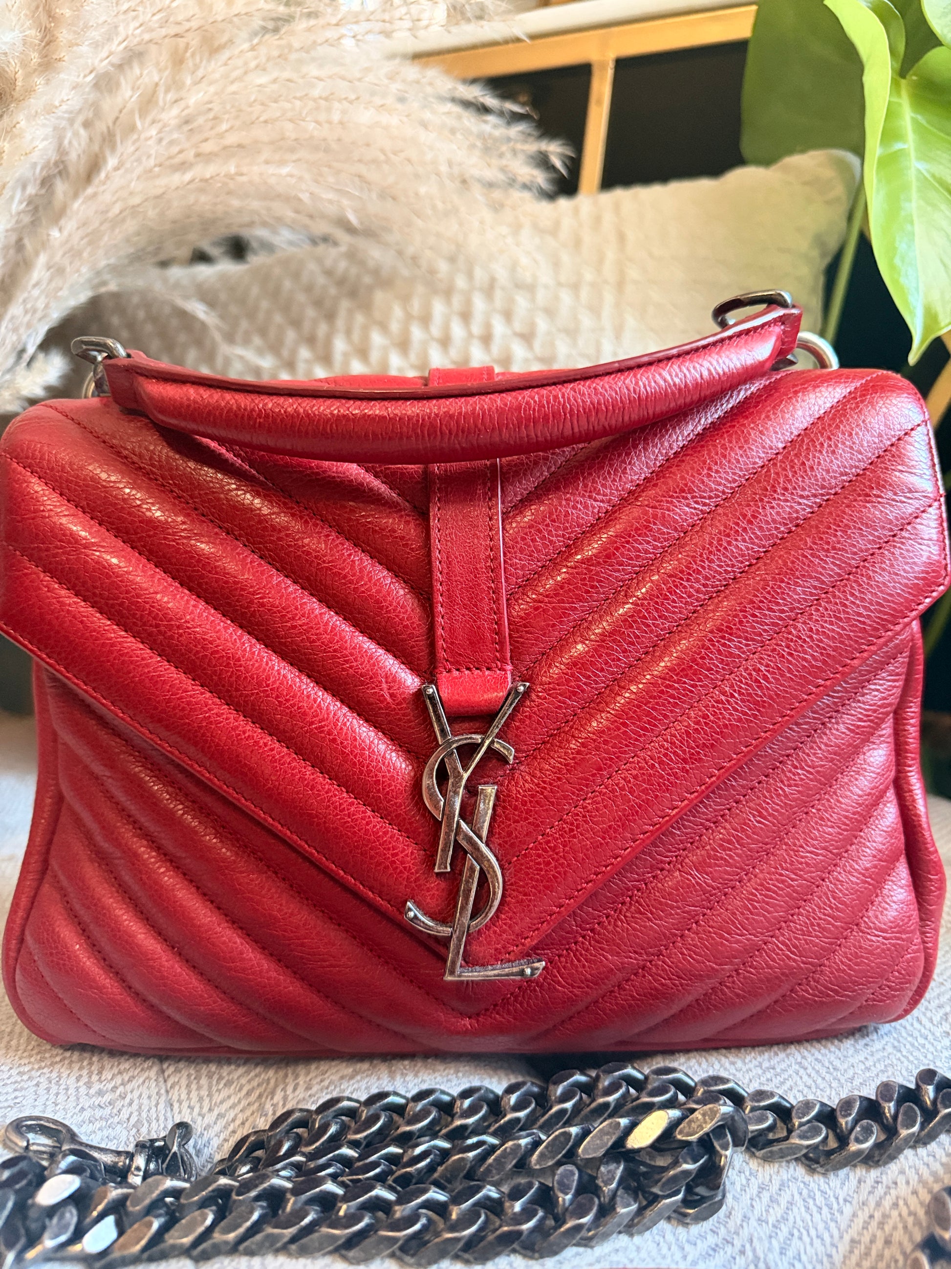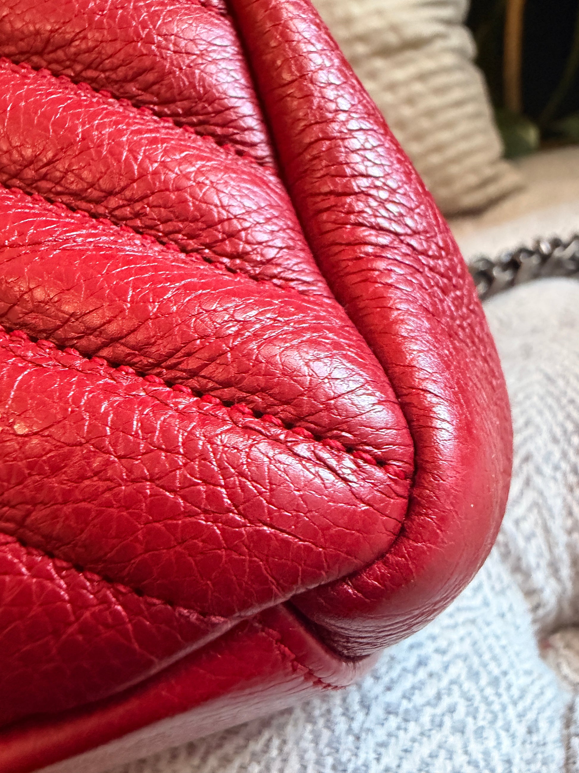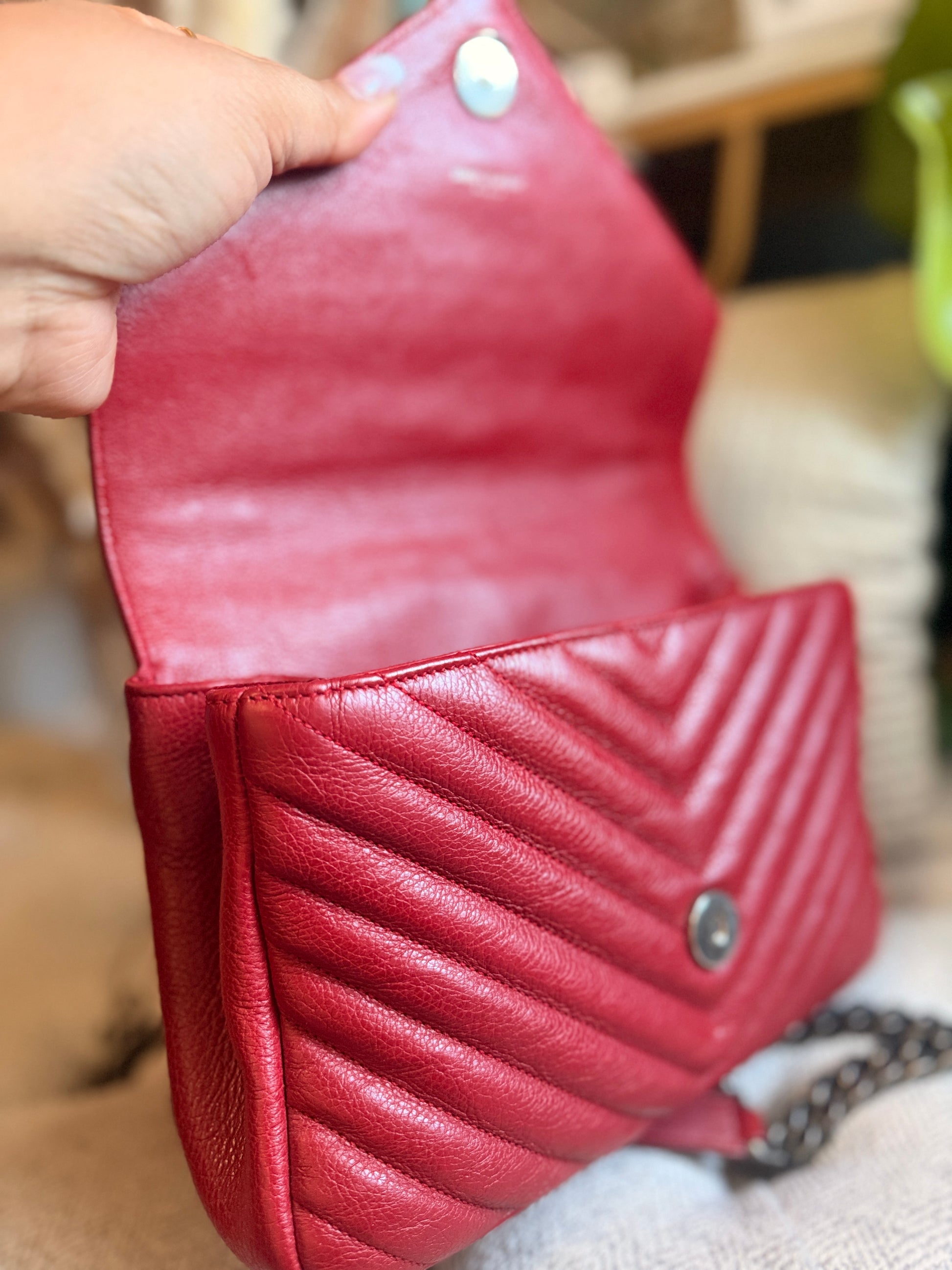 This is a satchel with the iconic chevron quilt pattern, adorned with the metal cassandre. It is such a functional piece and comes with a top handle plus a strap that you can use on your shoulder or as a crossbody strap. This bag has only minor signs of loving use, corners look great, interior is clean. Hardware has typical signs of light use. Leather has softened up beautifully but it still has beautiful structure with some signs of naturally relaxing leather. Overall beautifully preloved and ready for a new home! Will only come with a dustbag from another brand. Feel free to ask for more pics if you’d like to see more.